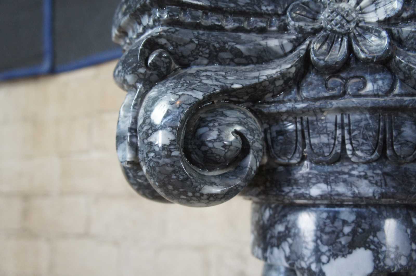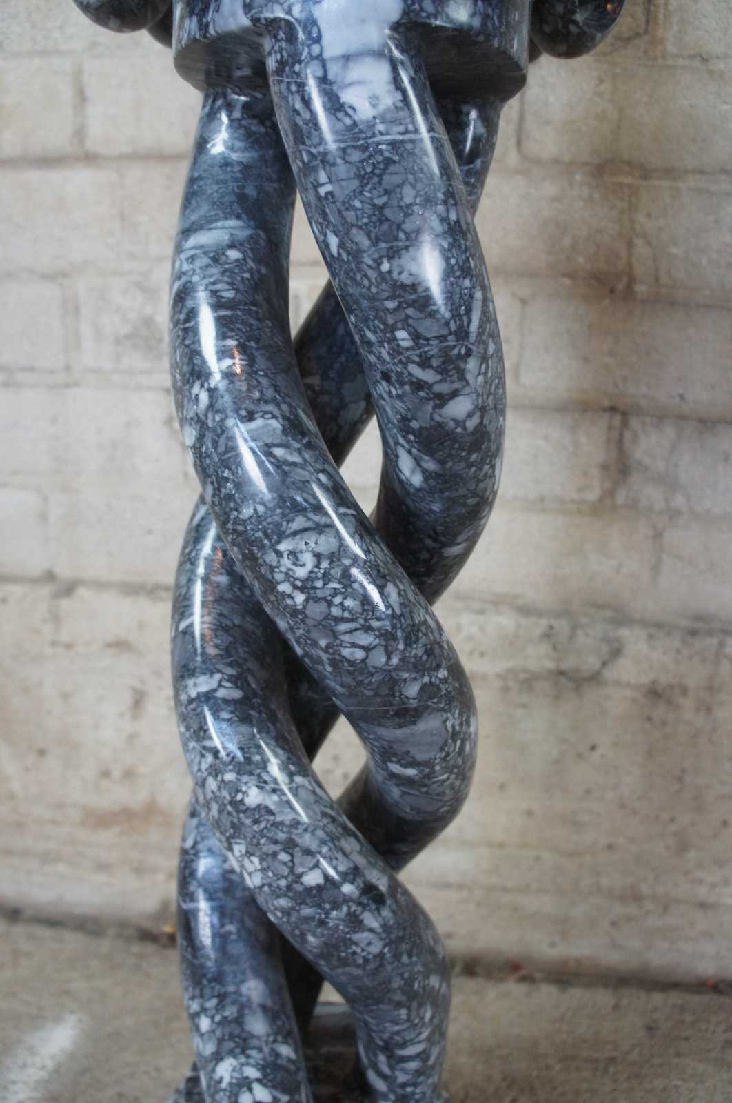 Sculptural late 20th century Italian marble pedestal. A graphite color stone with twisted column and ornate carvings.