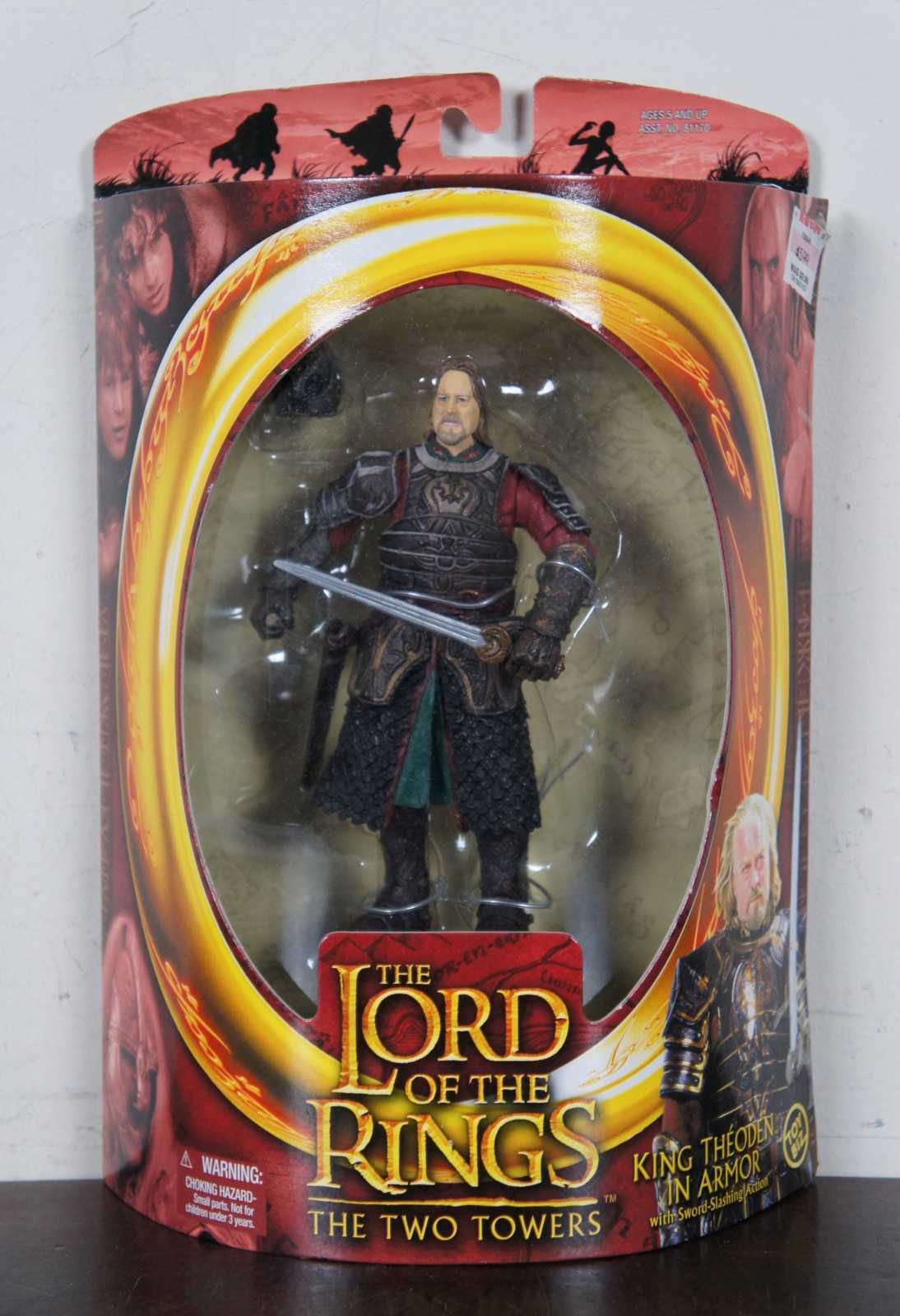 Set of six vintage 2002 Toy Biz Lord of the Rings: The Two towers action figures with accessories in sealed boxes. Lot includes Saruman the White, Aragorn, King Theoden in Armor, Rohirrim Soldier, Helm’s Deep Aragorn, and King Theoden.