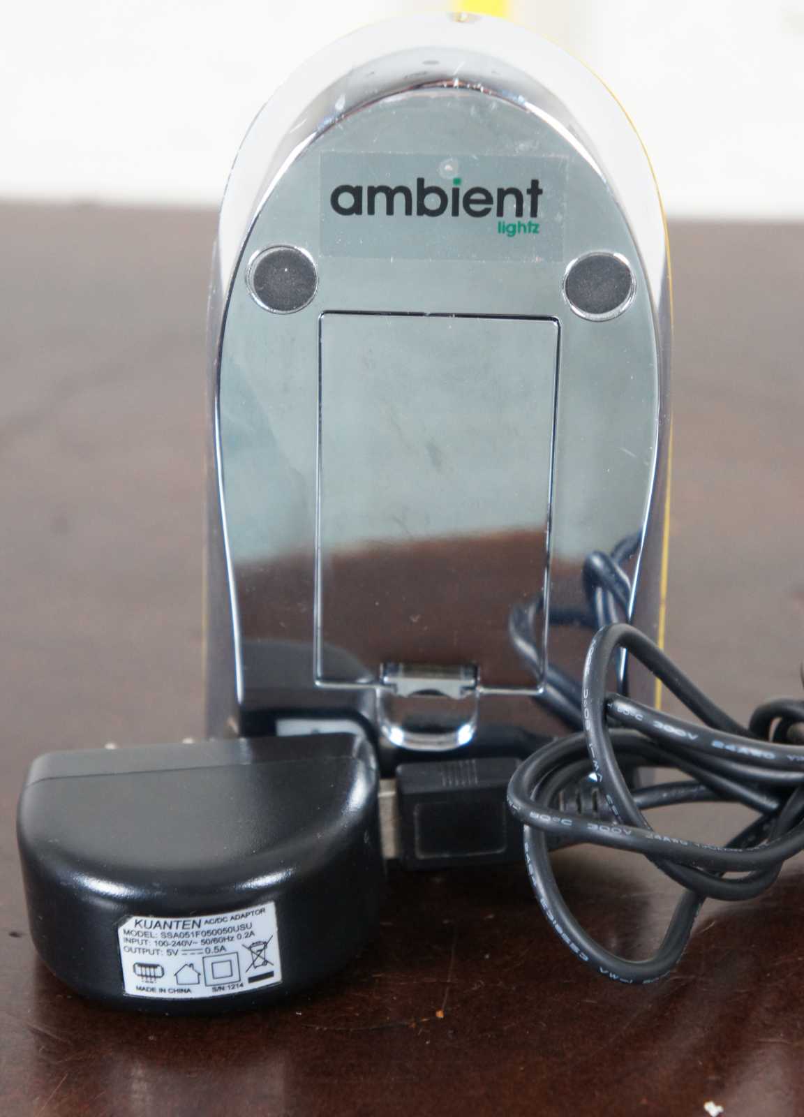 Modern yellow adjustable desk lamp by Ambient Lightz with computer mouse shaped base, adjustable lighted arm, powered with either AA batteries or included AC/DC/USB adapter.