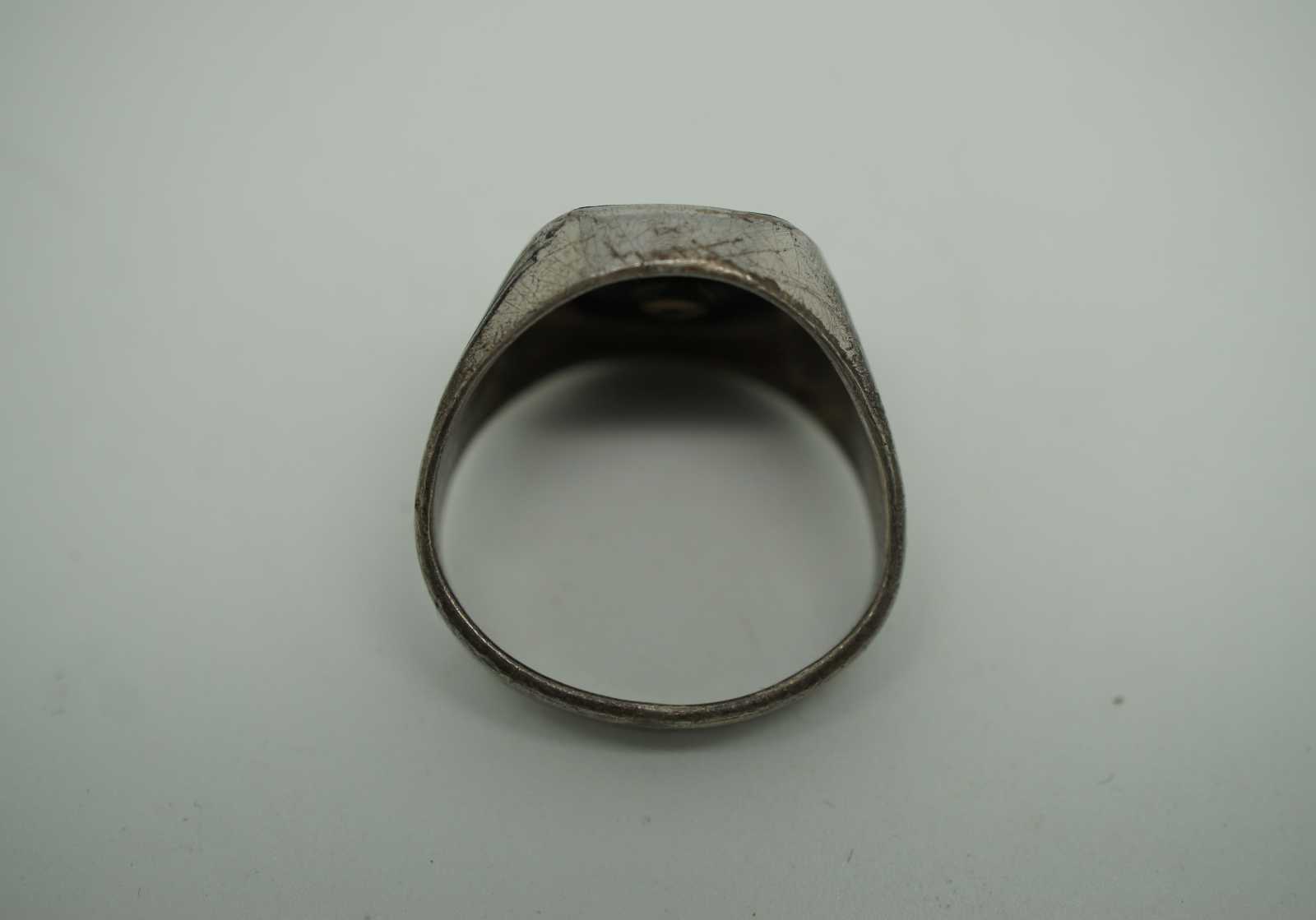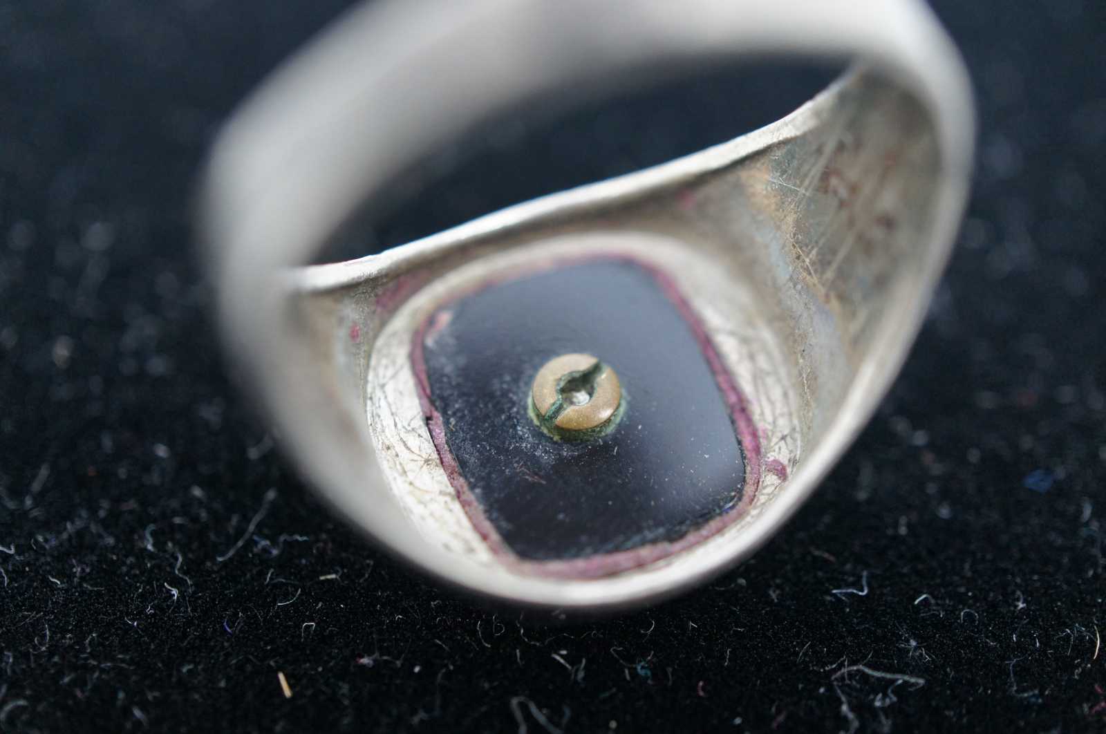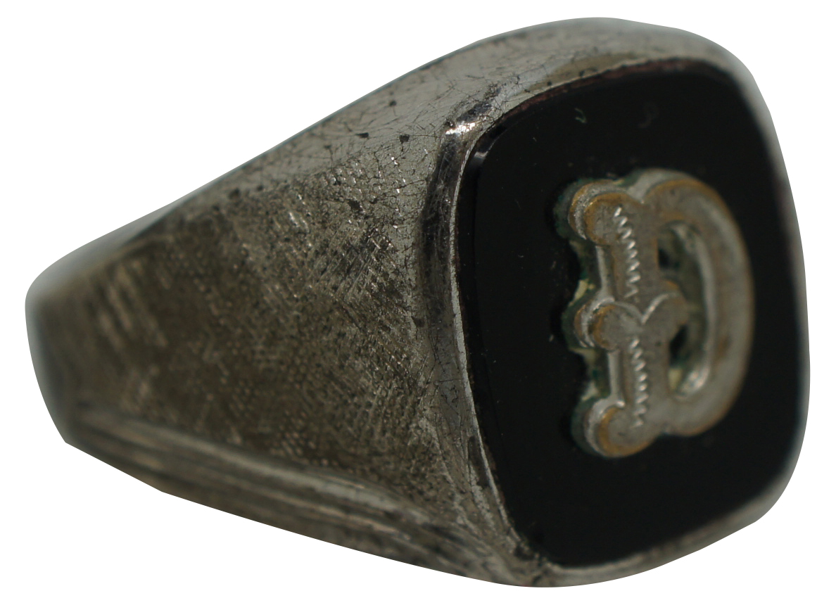 Mid century sterling silver signet ring by Vargas with the initial “D” in a Gothic font set on a black onyx surface.