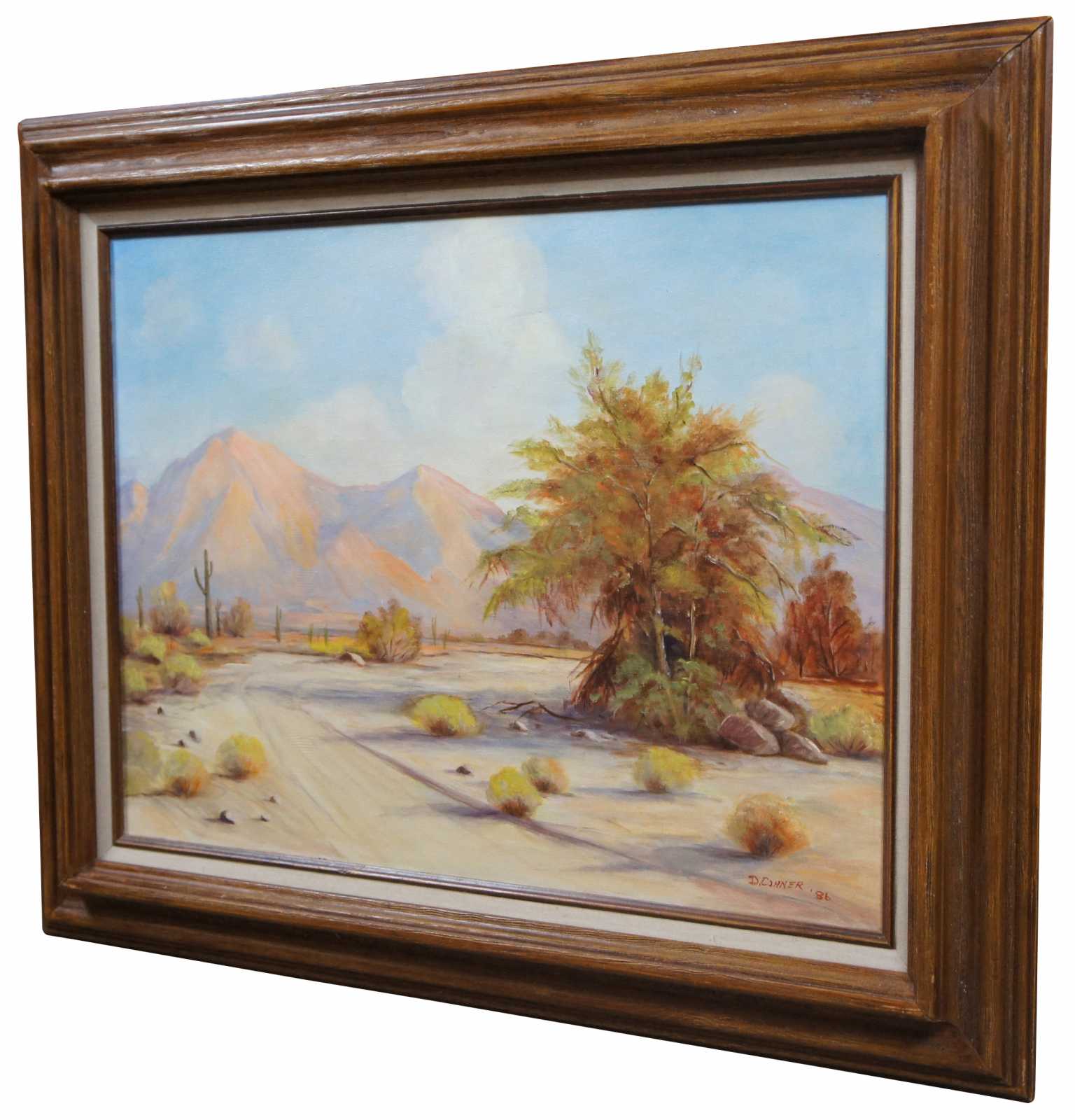 Vintage 1986 oil on canvas desert landscape painting showing Arizona mountains and trees, signed D. Conner.