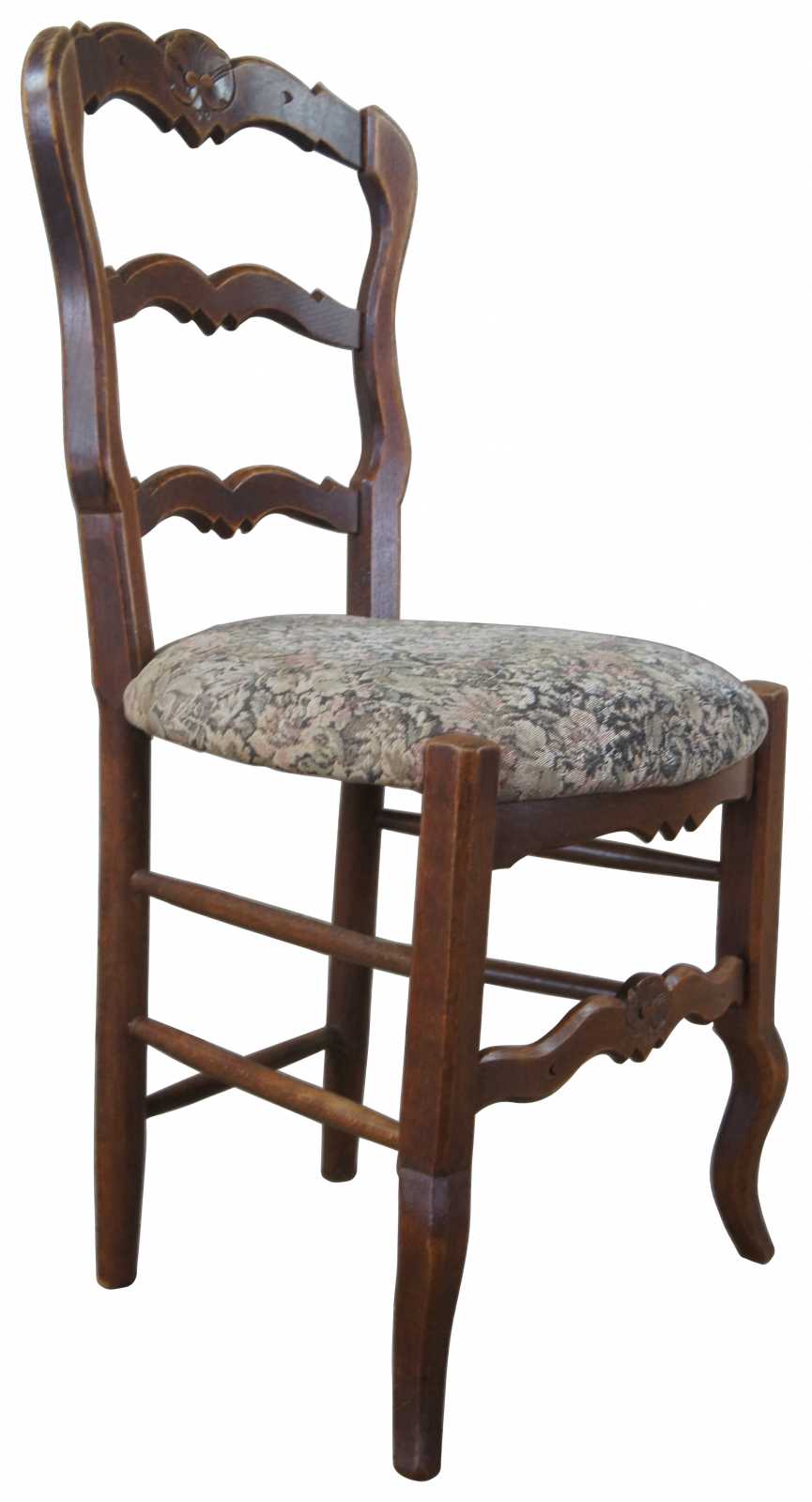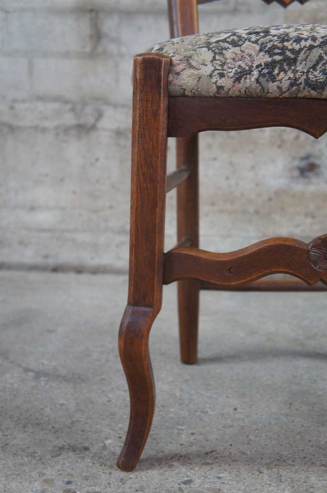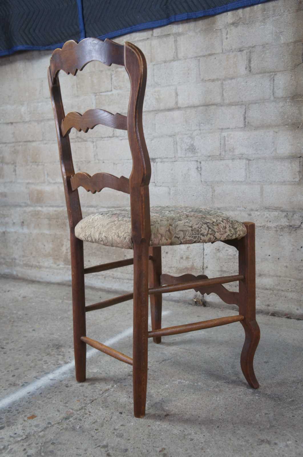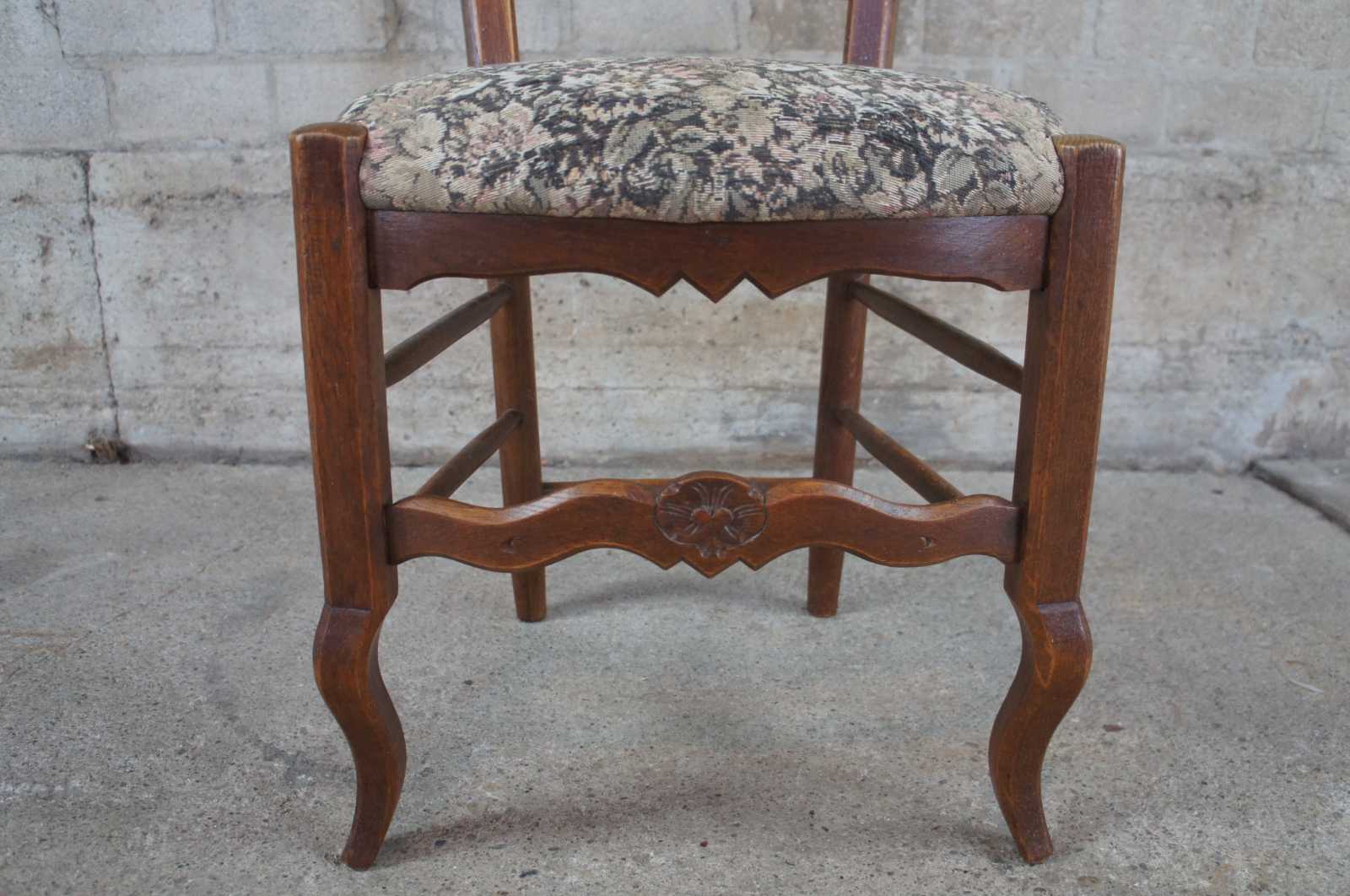 Set of six French Country dining chairs. Made of oak with serpentine ladderback design and floral Aubusson upholstered seat.