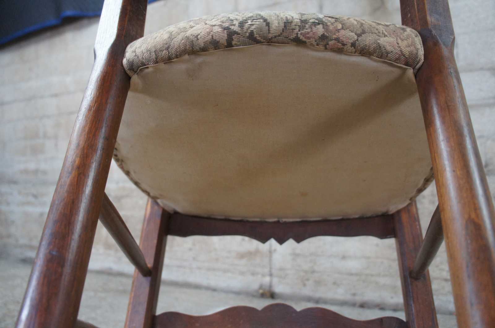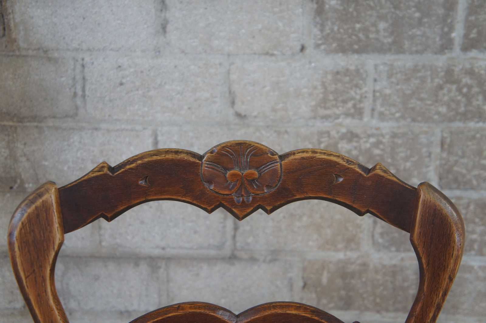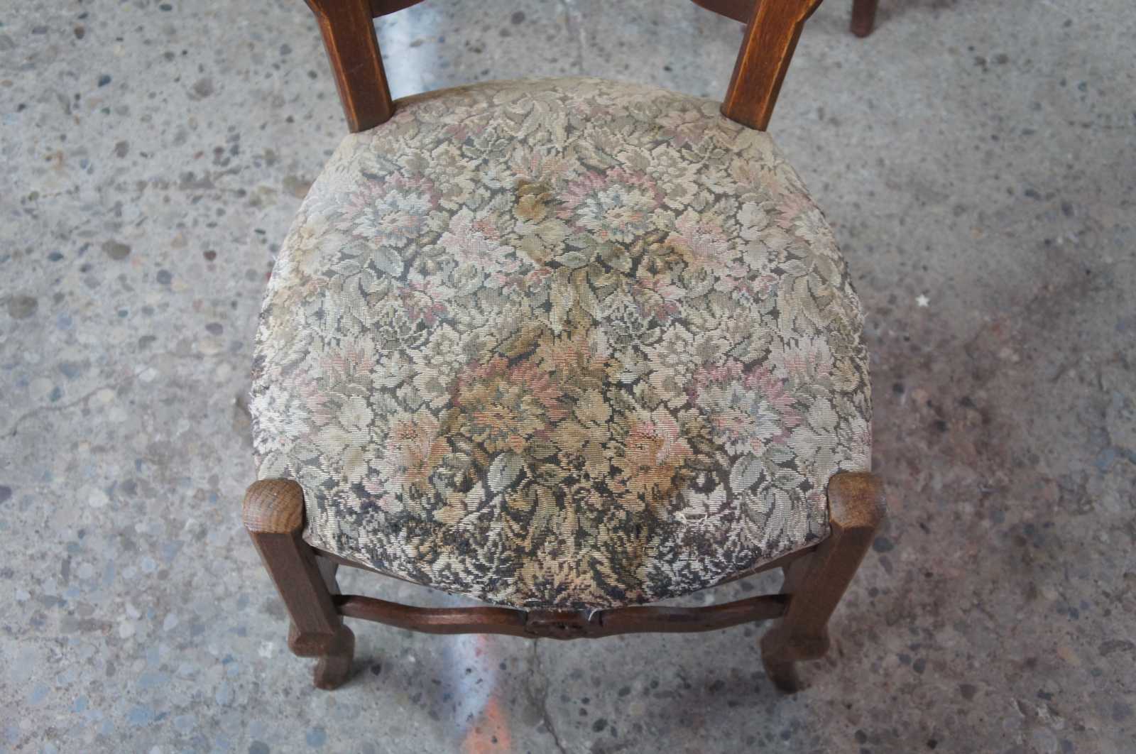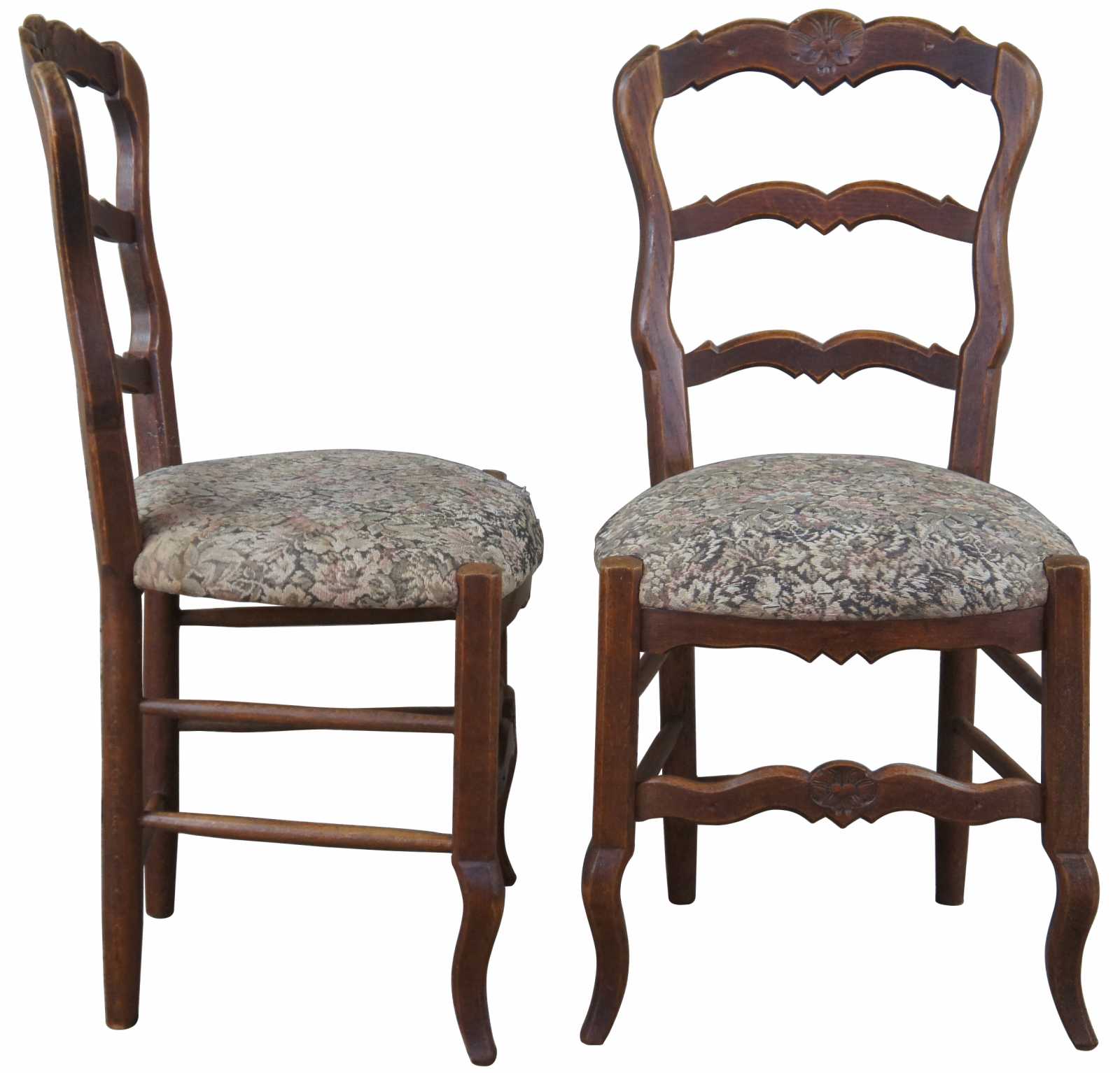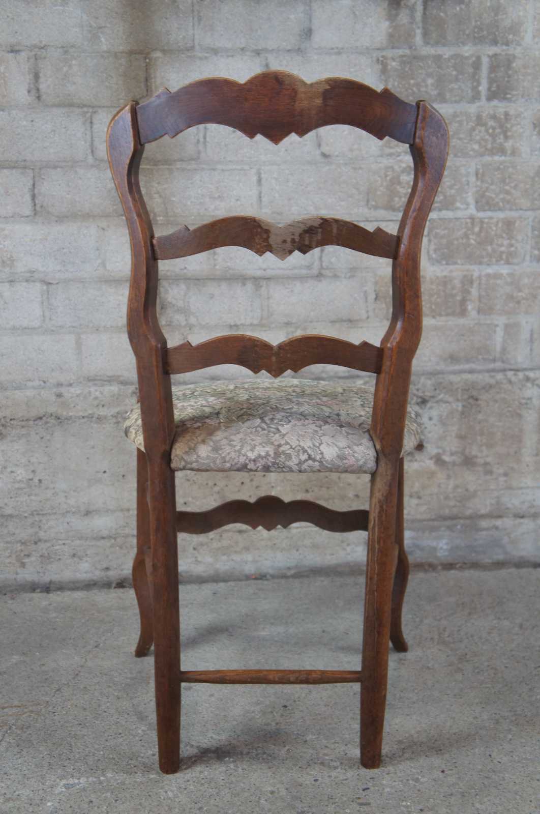 Set of six French Country dining chairs. Made of oak with serpentine ladderback design and floral Aubusson upholstered seat.