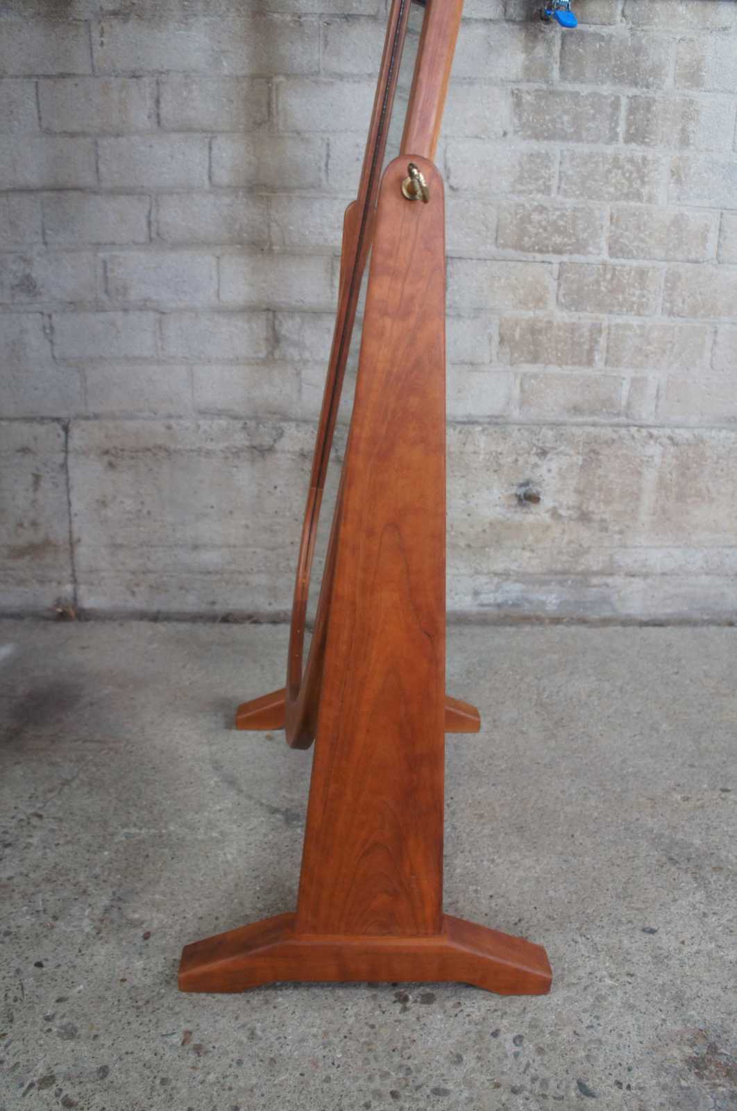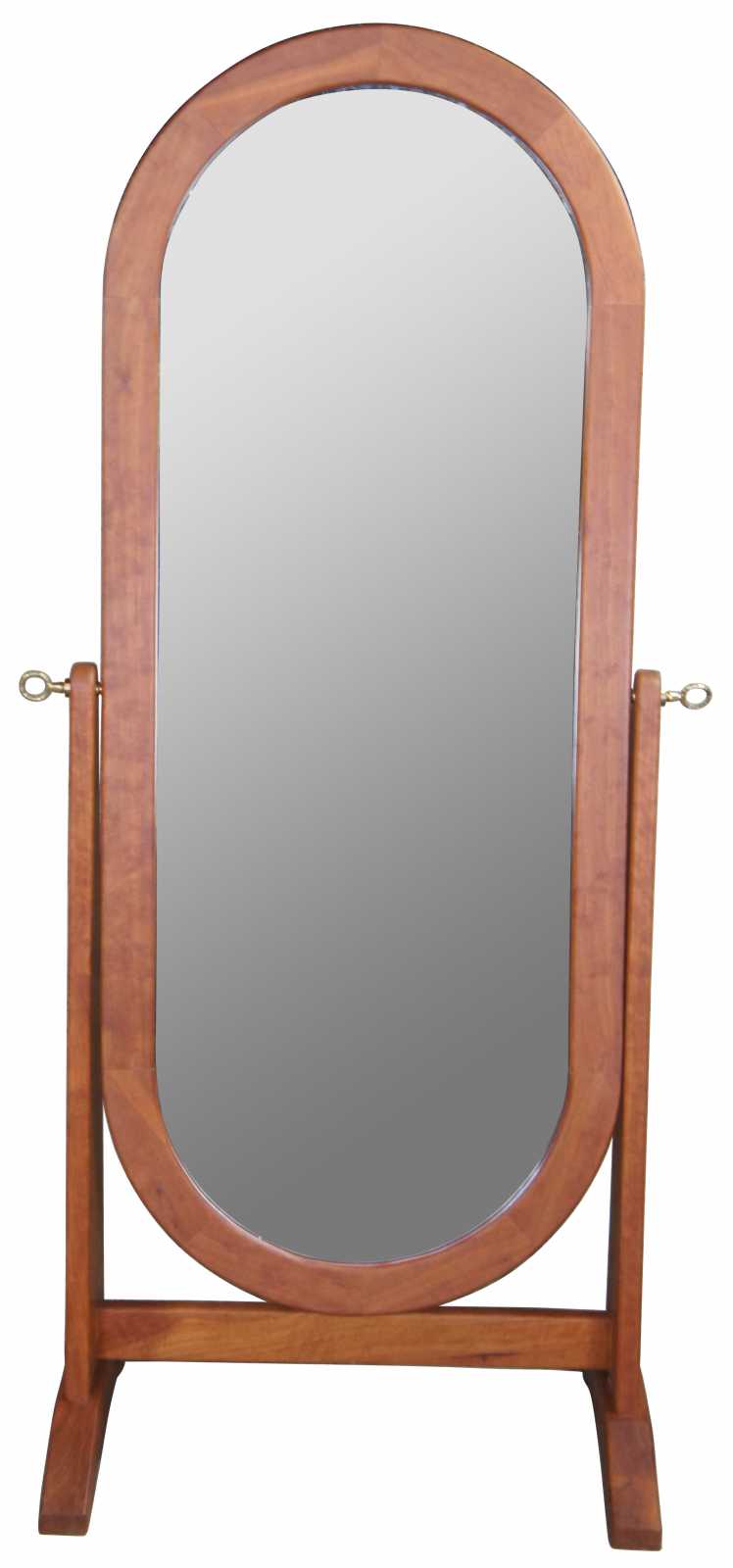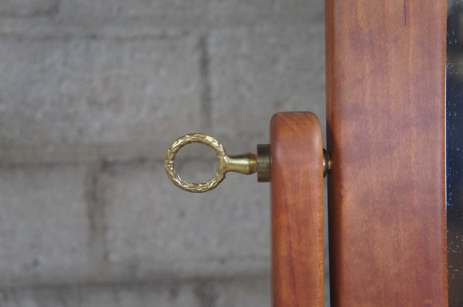 1997 American cherry cheval mirror. Mission or Arts & Crafts styling with an oval adjustable mirror and Neoclassical brass hardware.