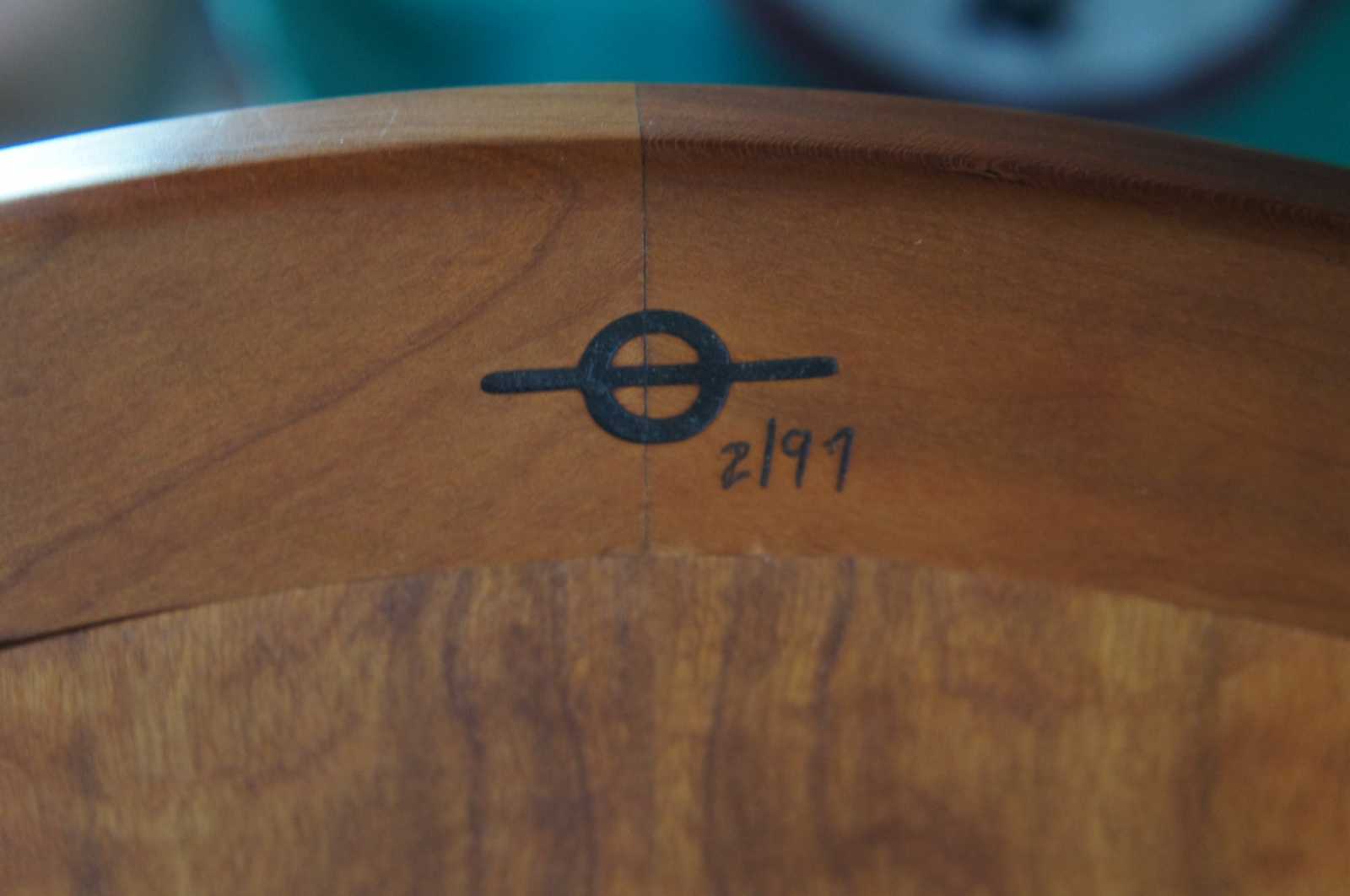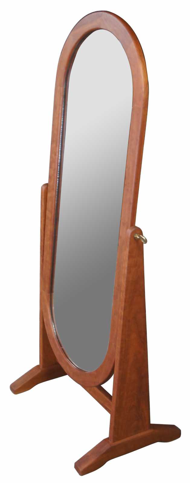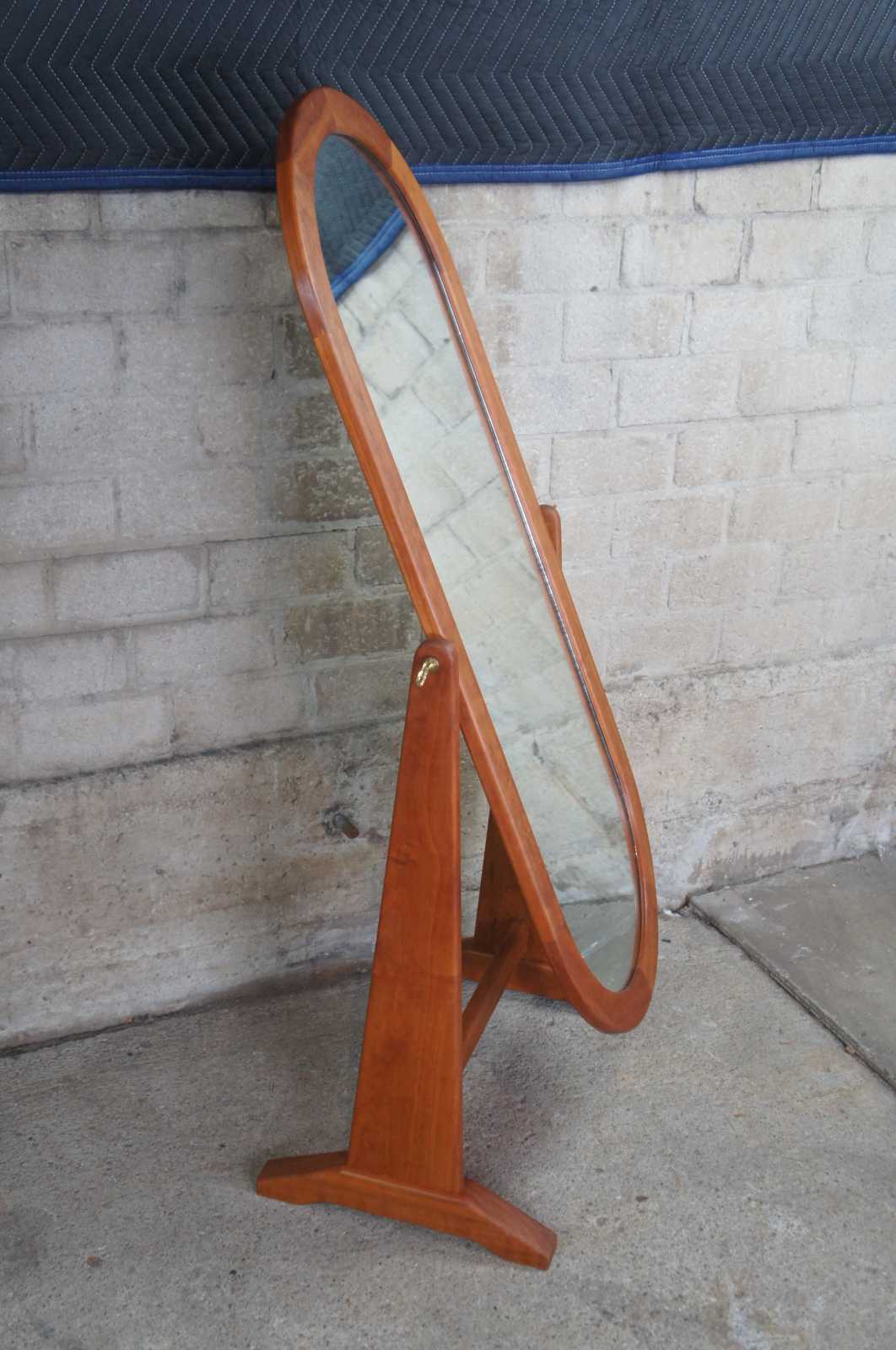 1997 American cherry cheval mirror. Mission or Arts & Crafts styling with an oval adjustable mirror and Neoclassical brass hardware.