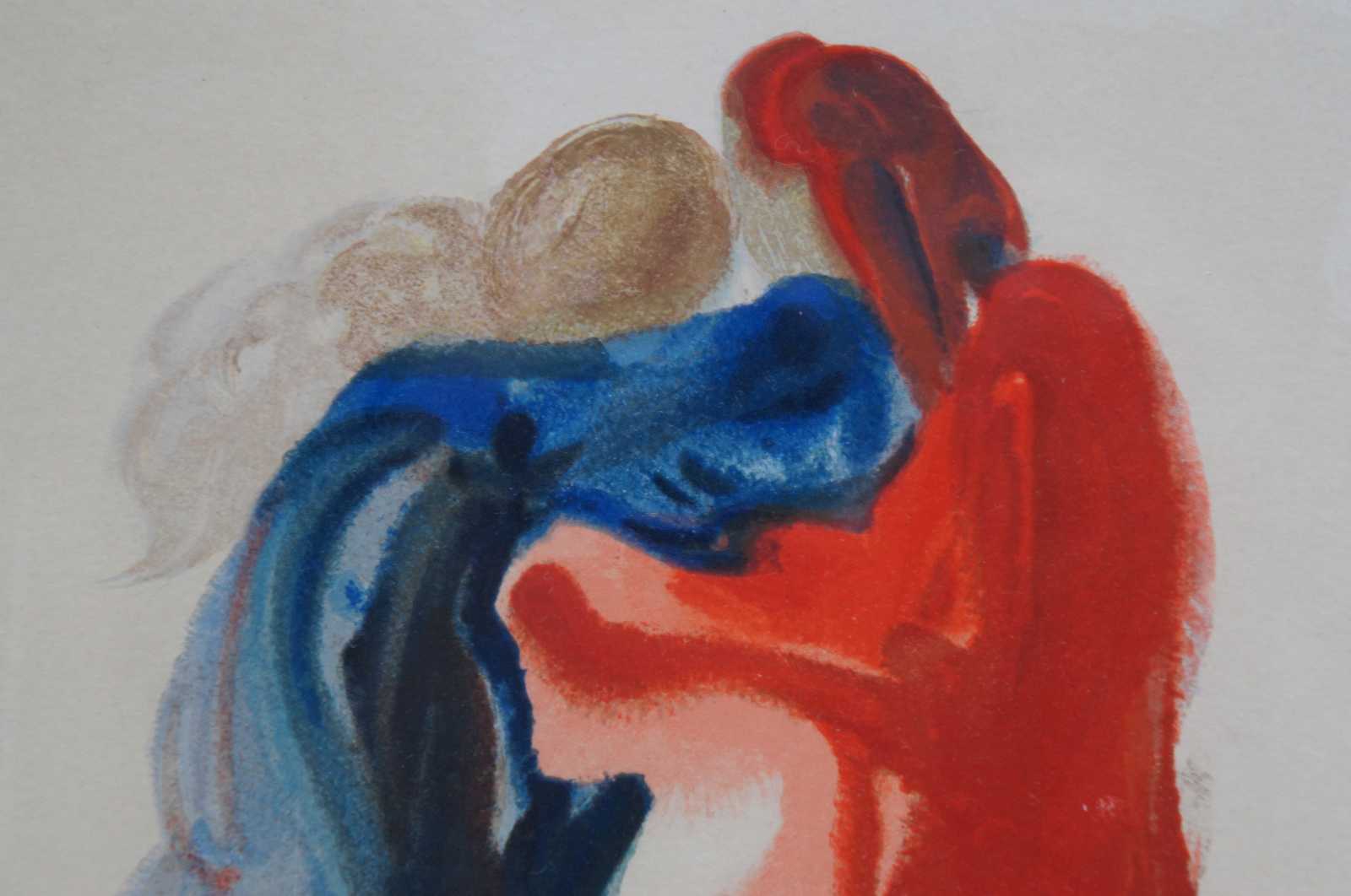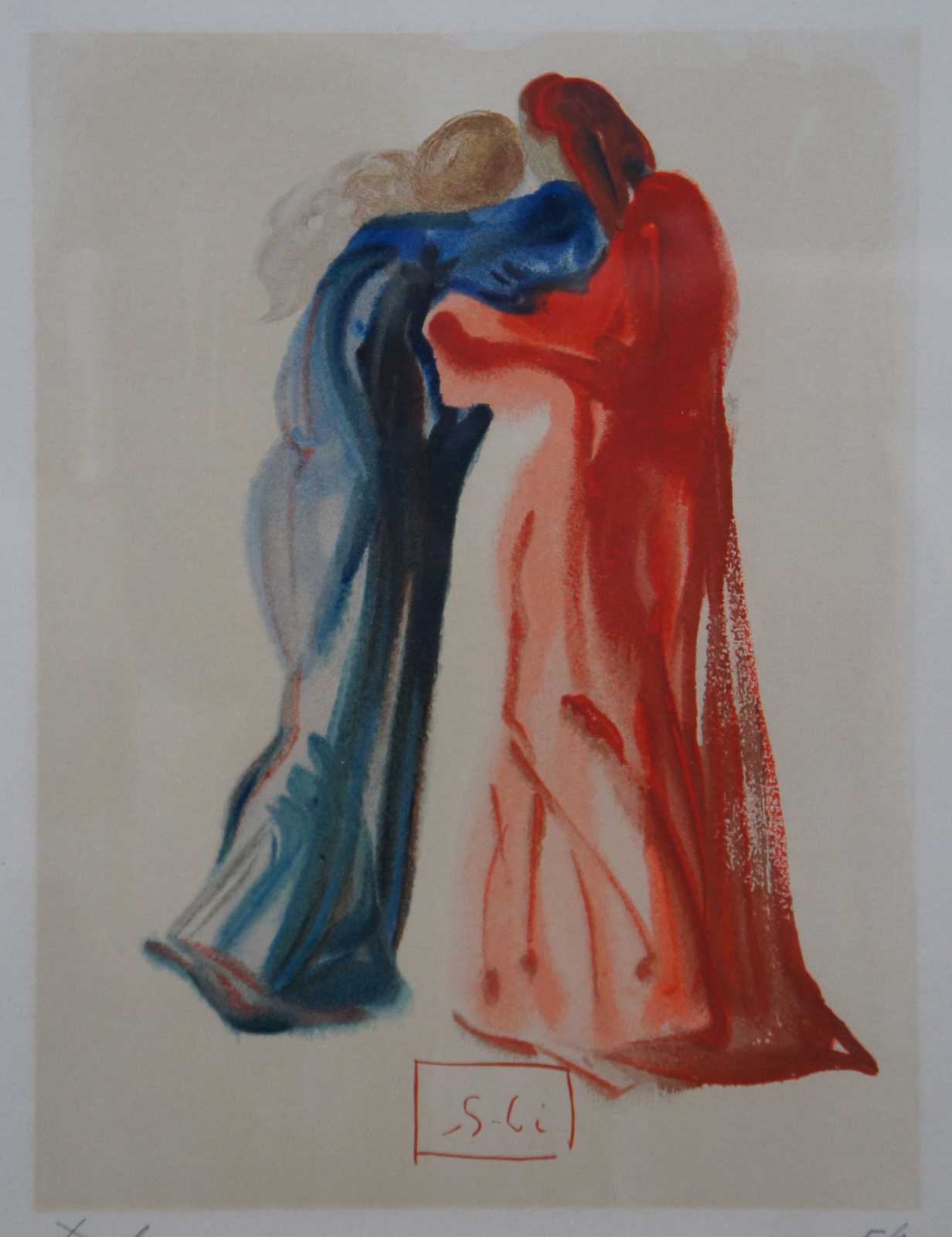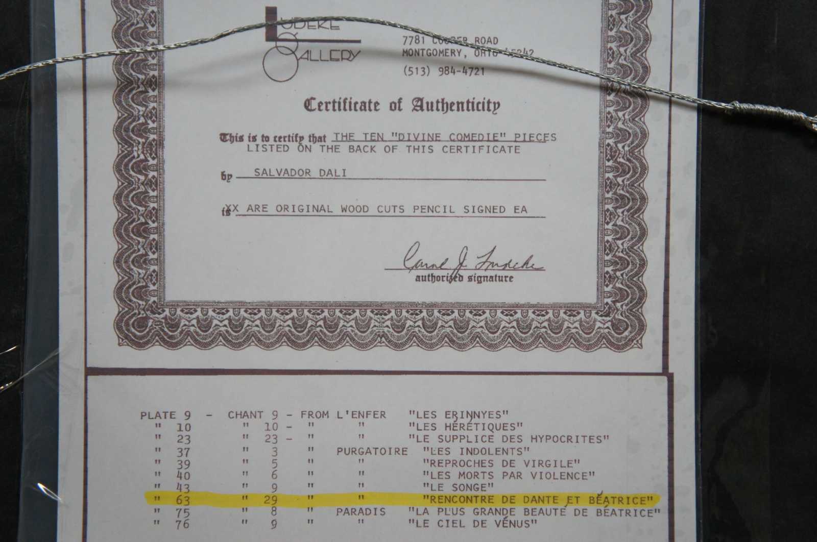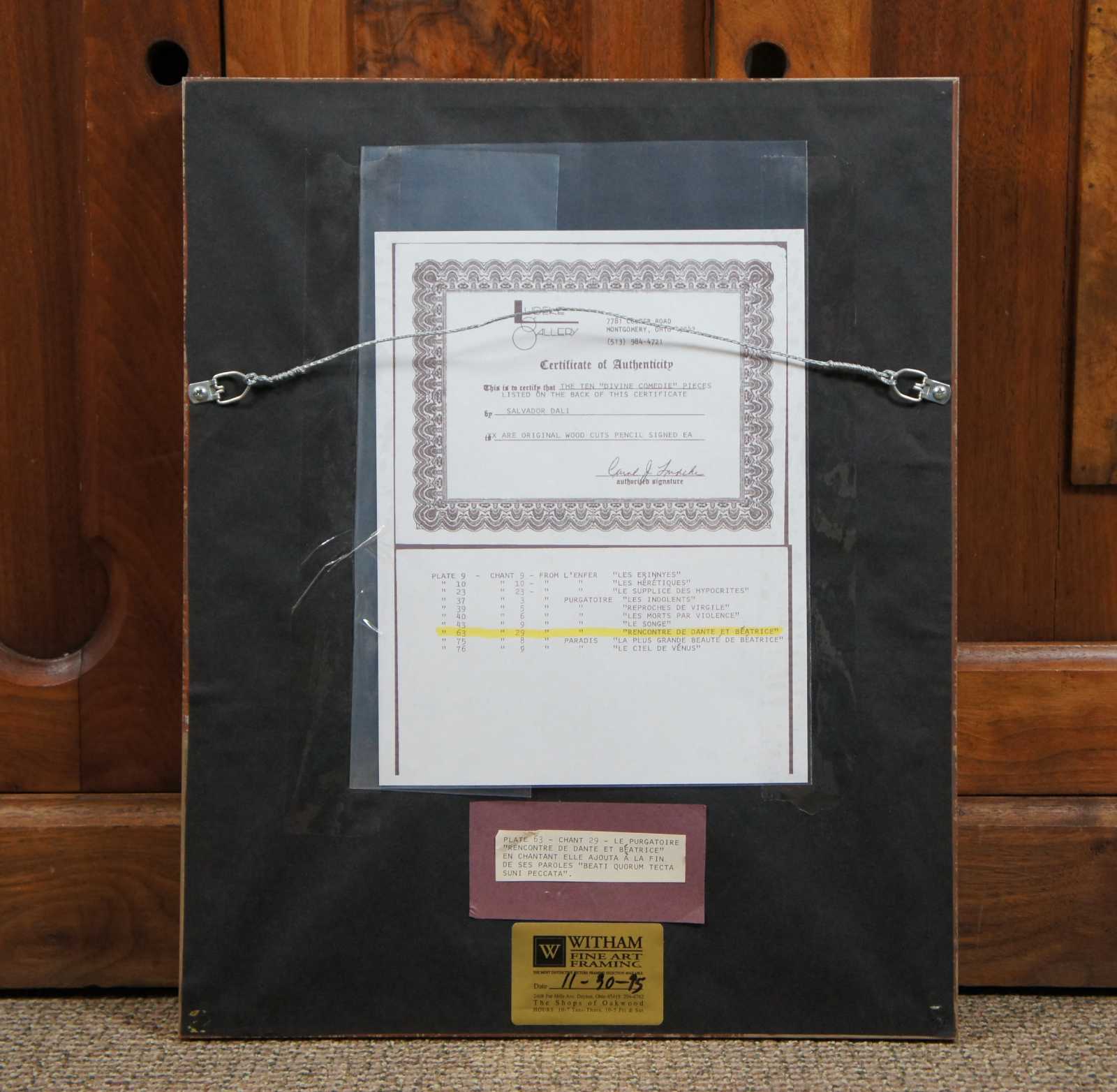 Framed original woodcut artist’s proof print on BFK Rives paper, pencil signed lower left by Salvador Dali – Plate 63 – Chant/Canto 29 – from Le Purgatoire (Purgatory) – “Rencontre de Dante et Beatrice” (Meeting of Dante and Beatrice) from the “Divine Comedie” series. Original certificate of authenticity covered 10 separate prints – photocopy included.