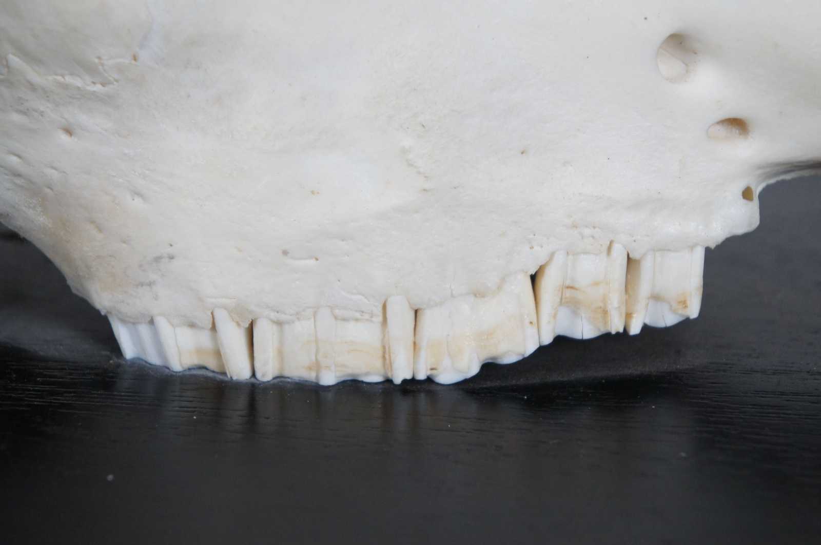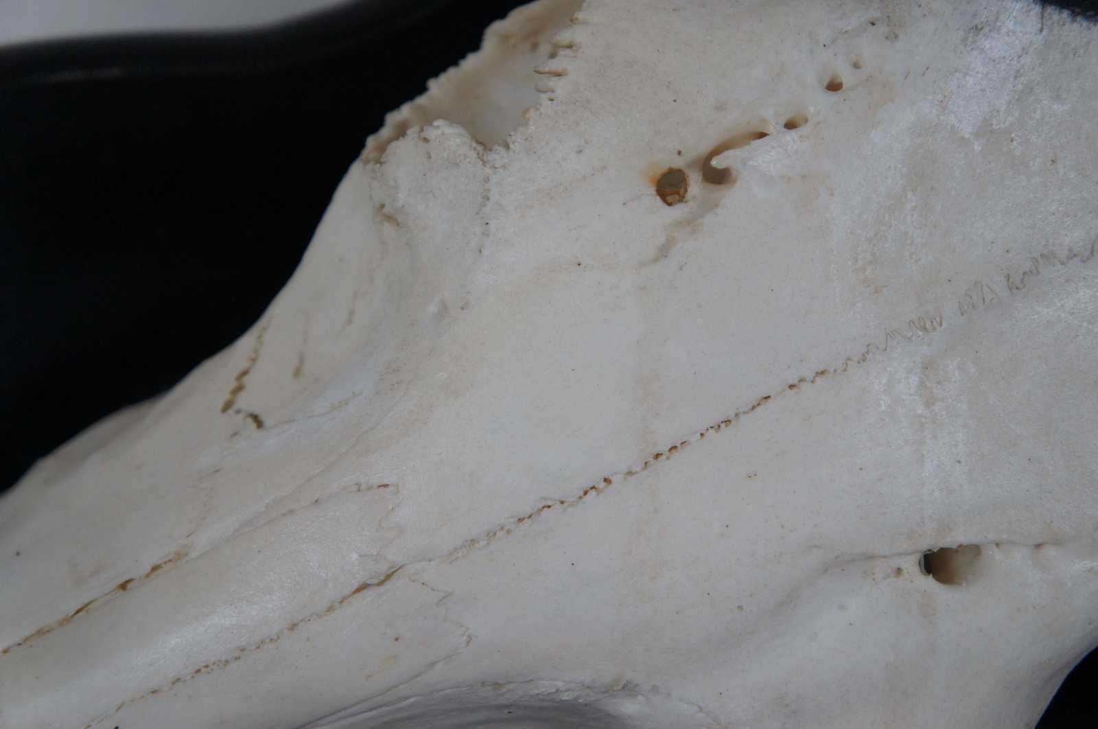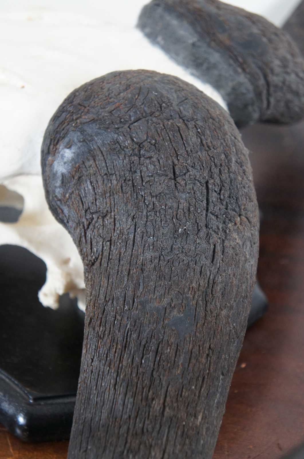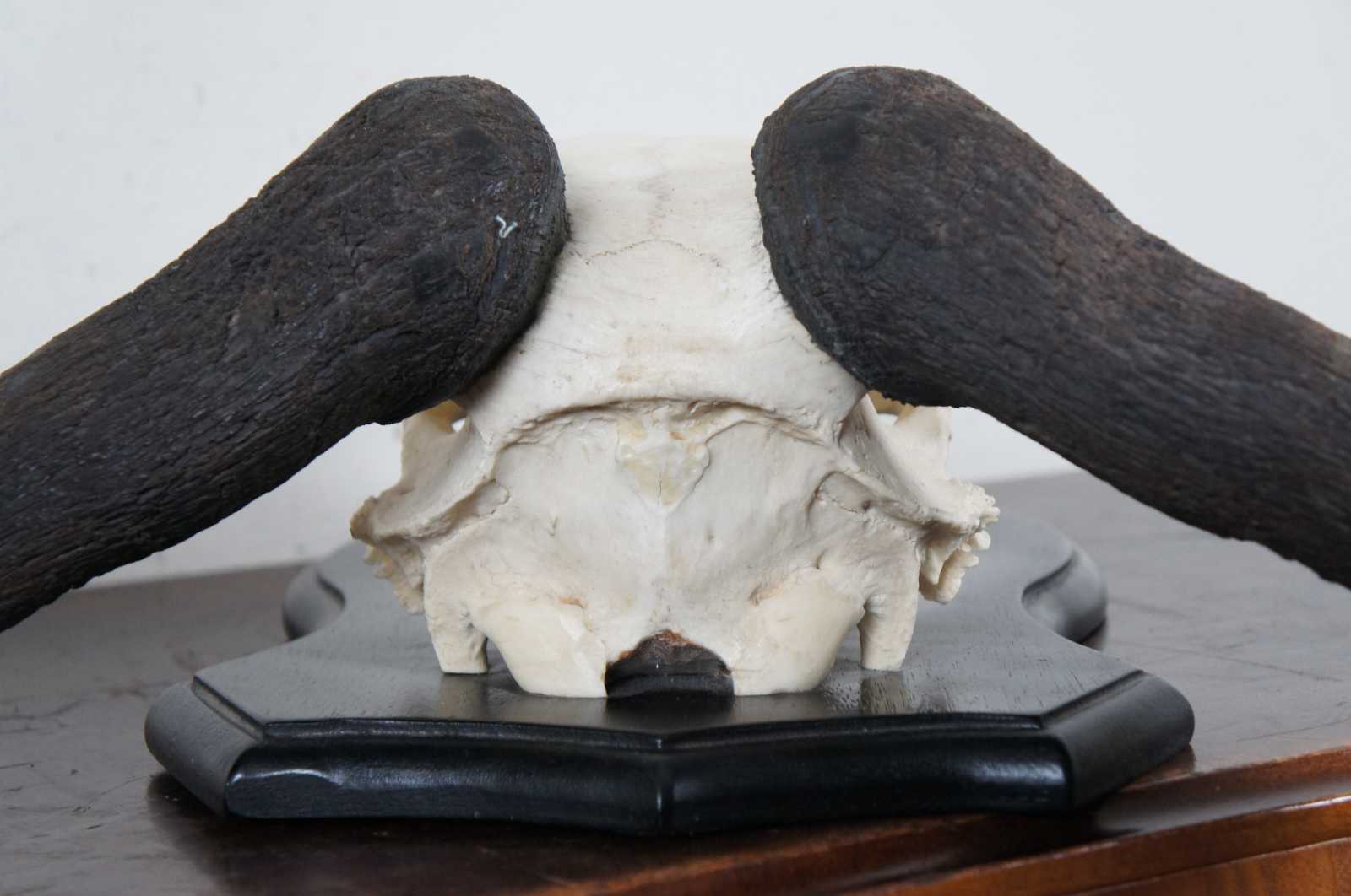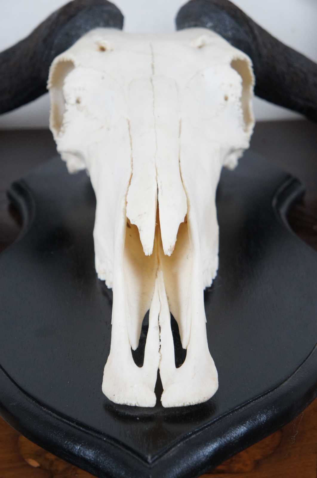 Natural wildebeest skull with 27” wide horns, mounted on a black wood plaque.