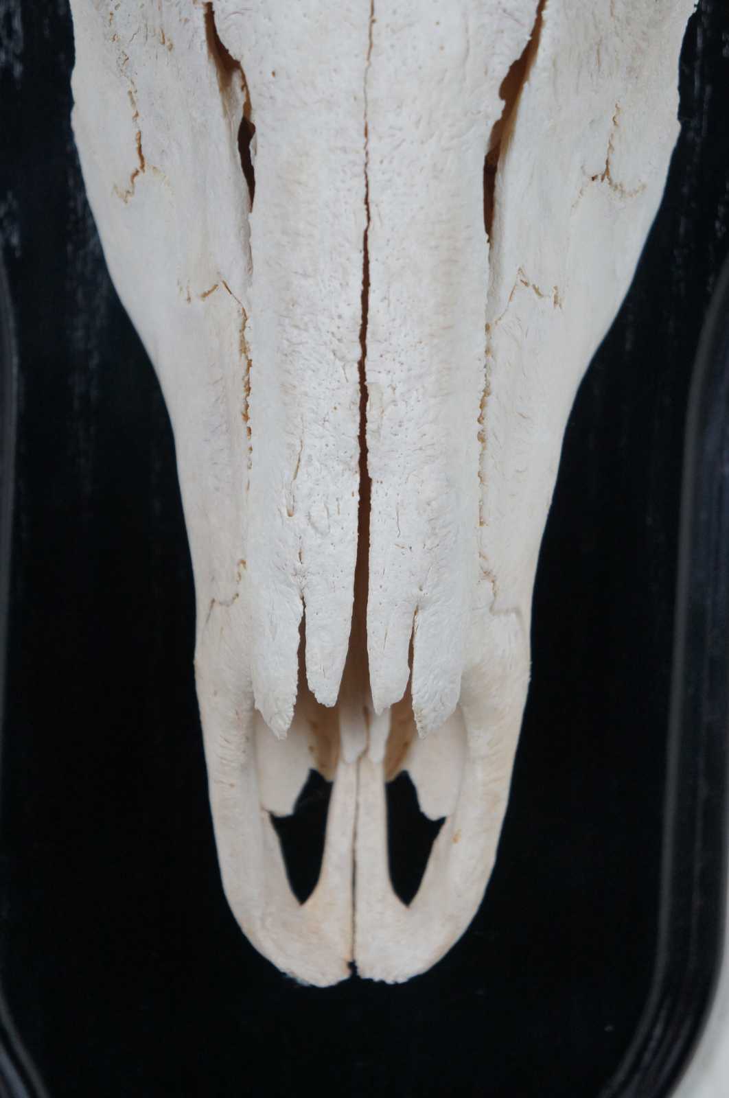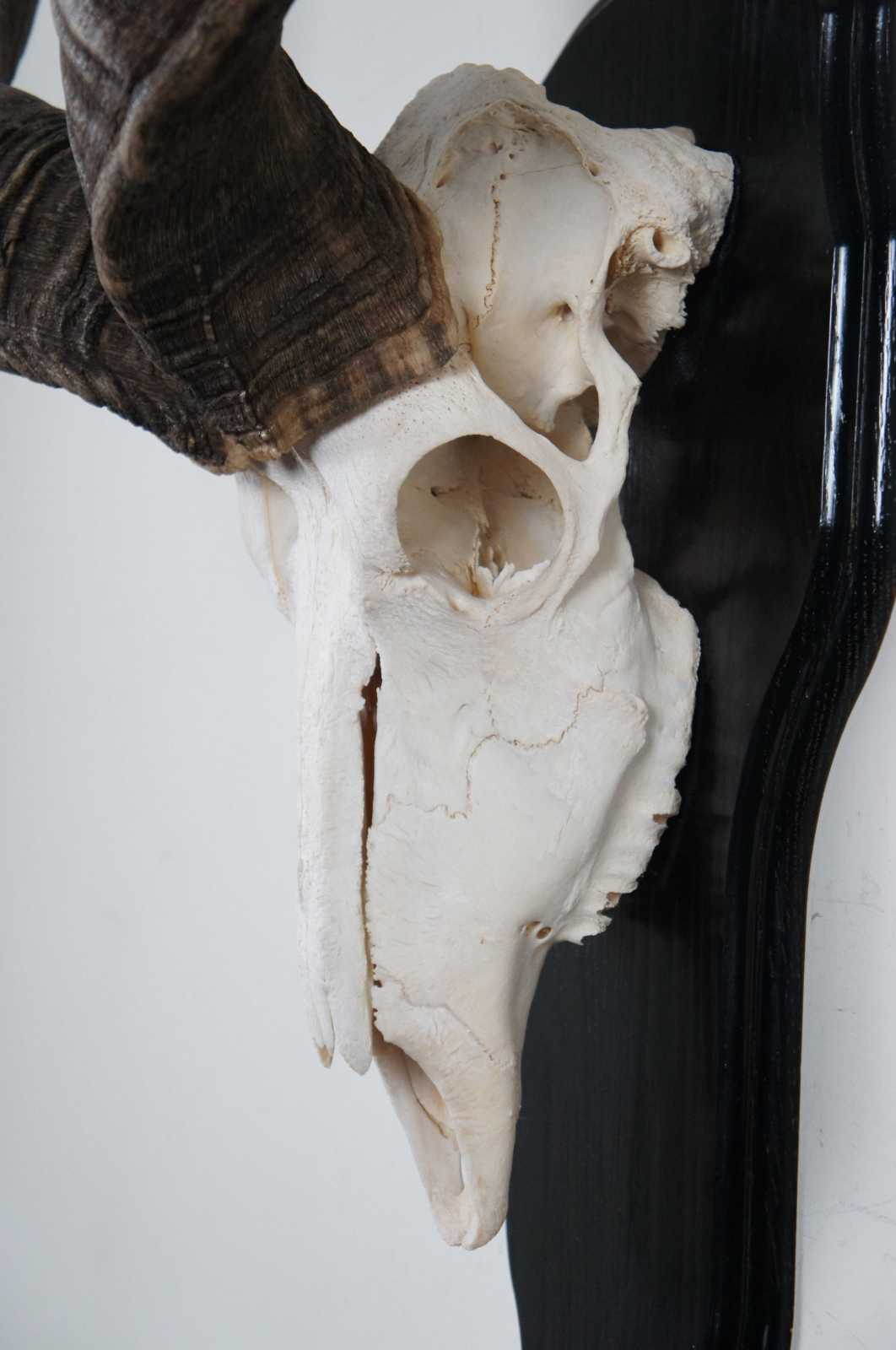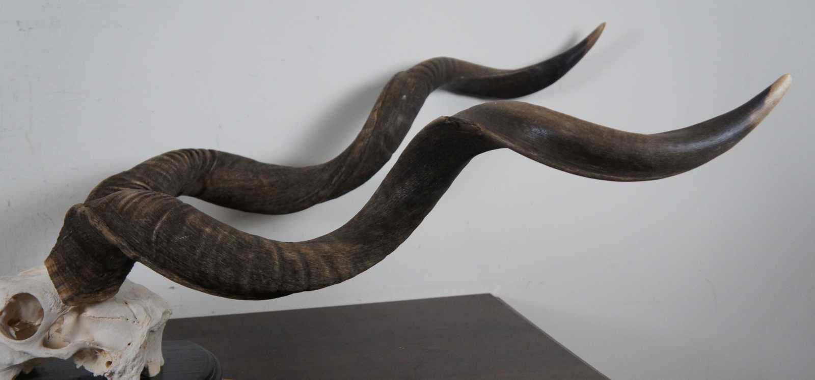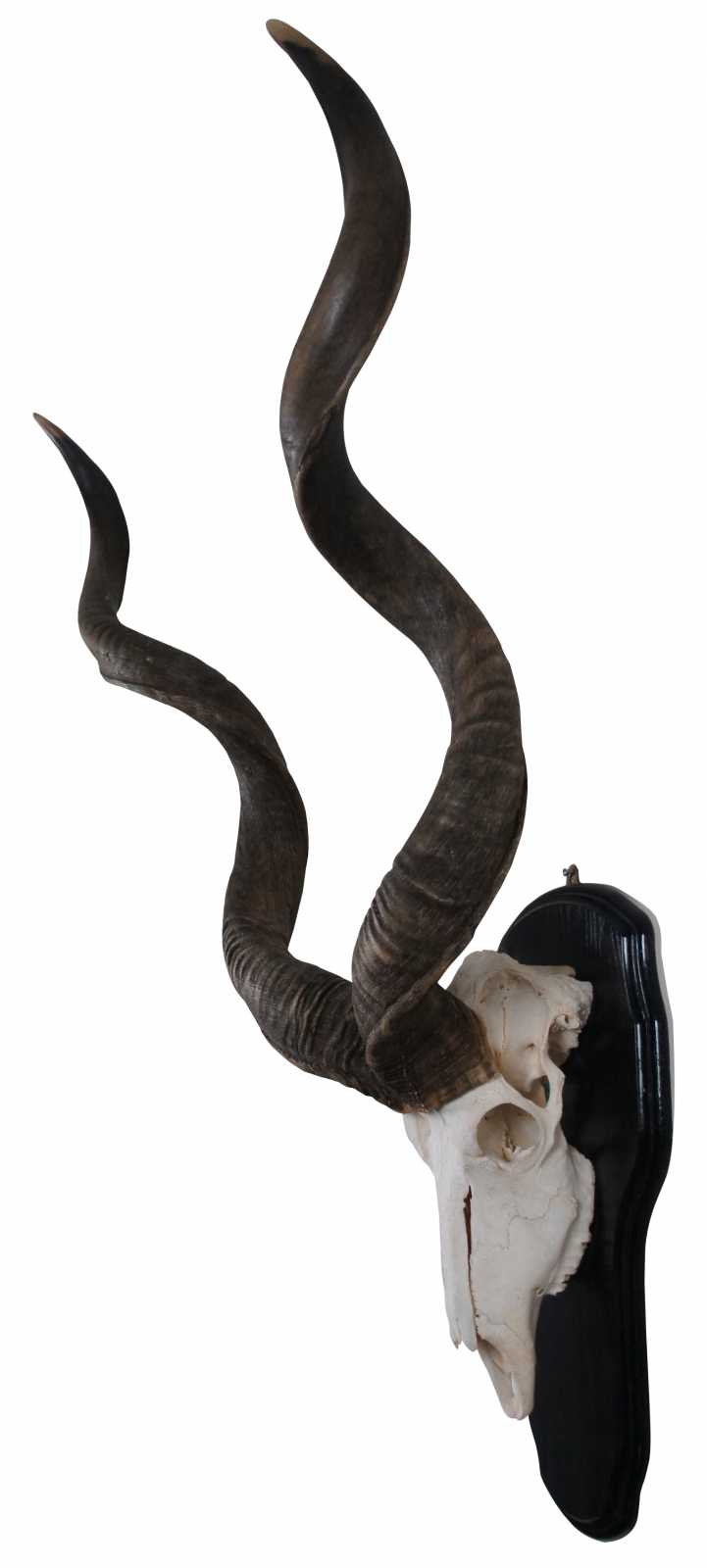 Natural kudu skull with horns mounted on a black wood plaque.