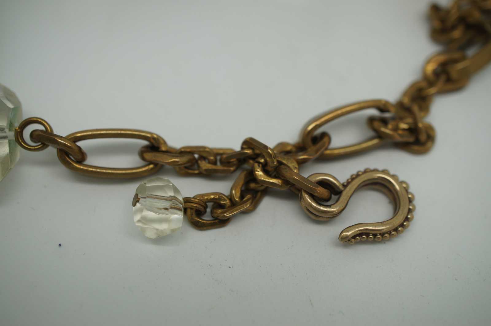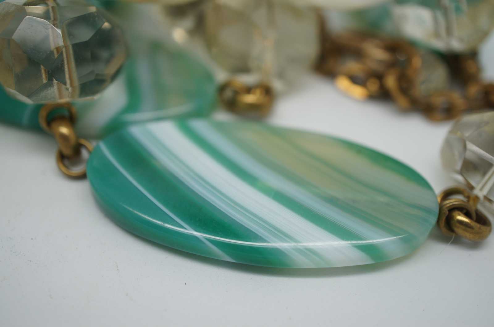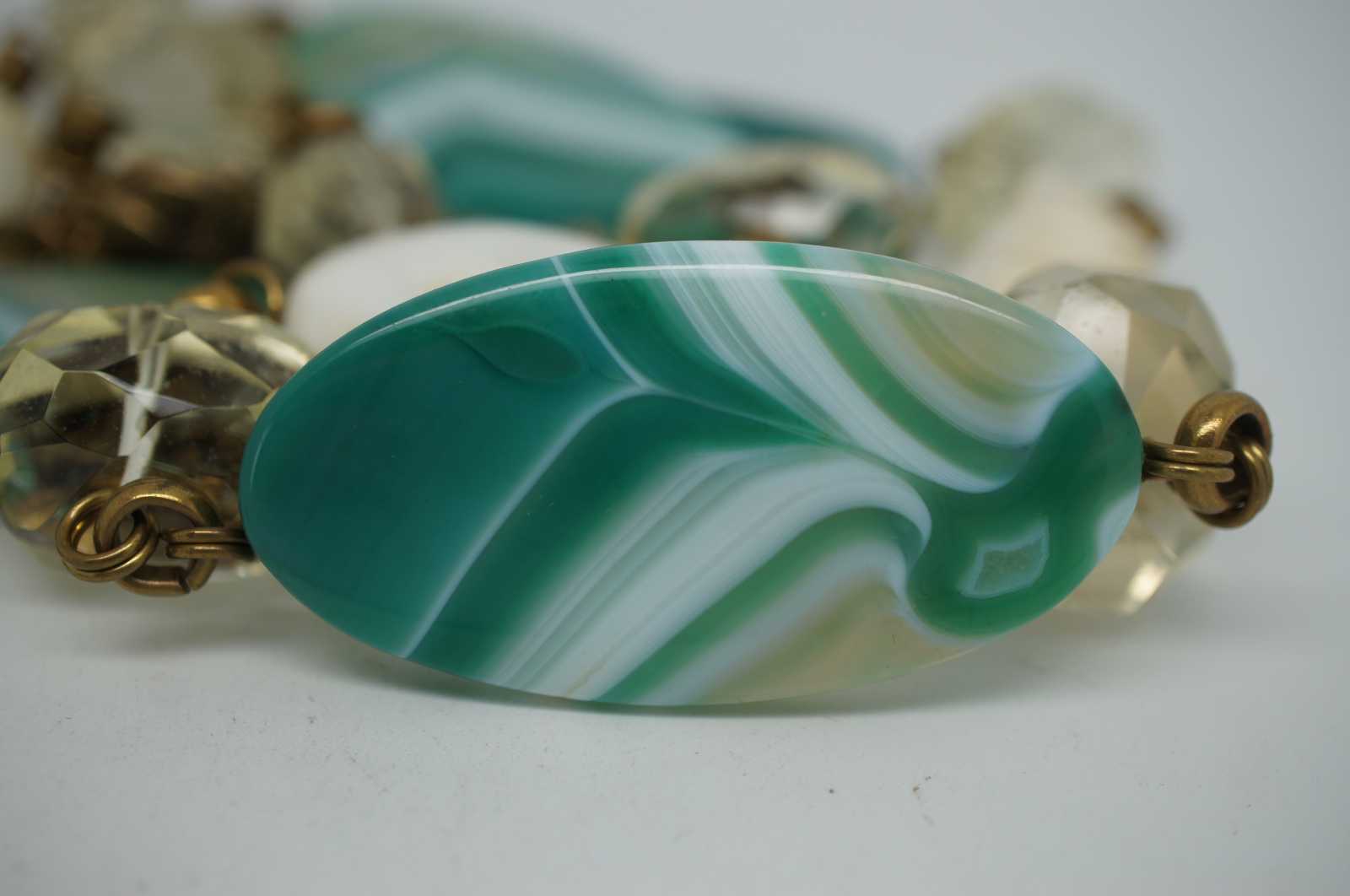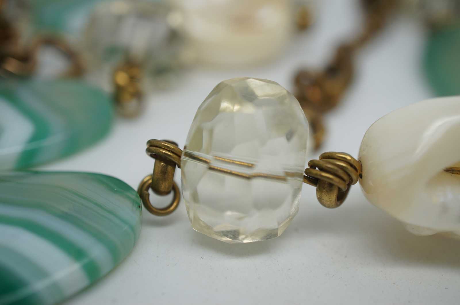 Stephen Dweck designer statement necklace featuring alternating faceted crystal beads, natural pearl shells and banded turquoise and white polished gemstones.