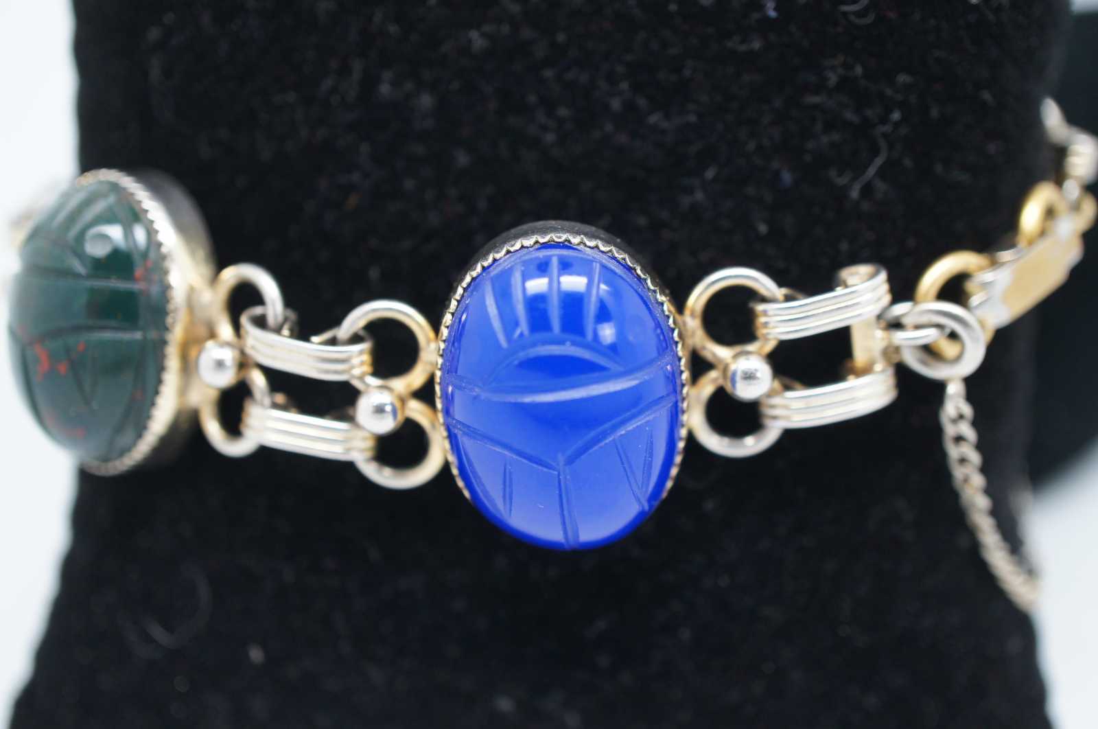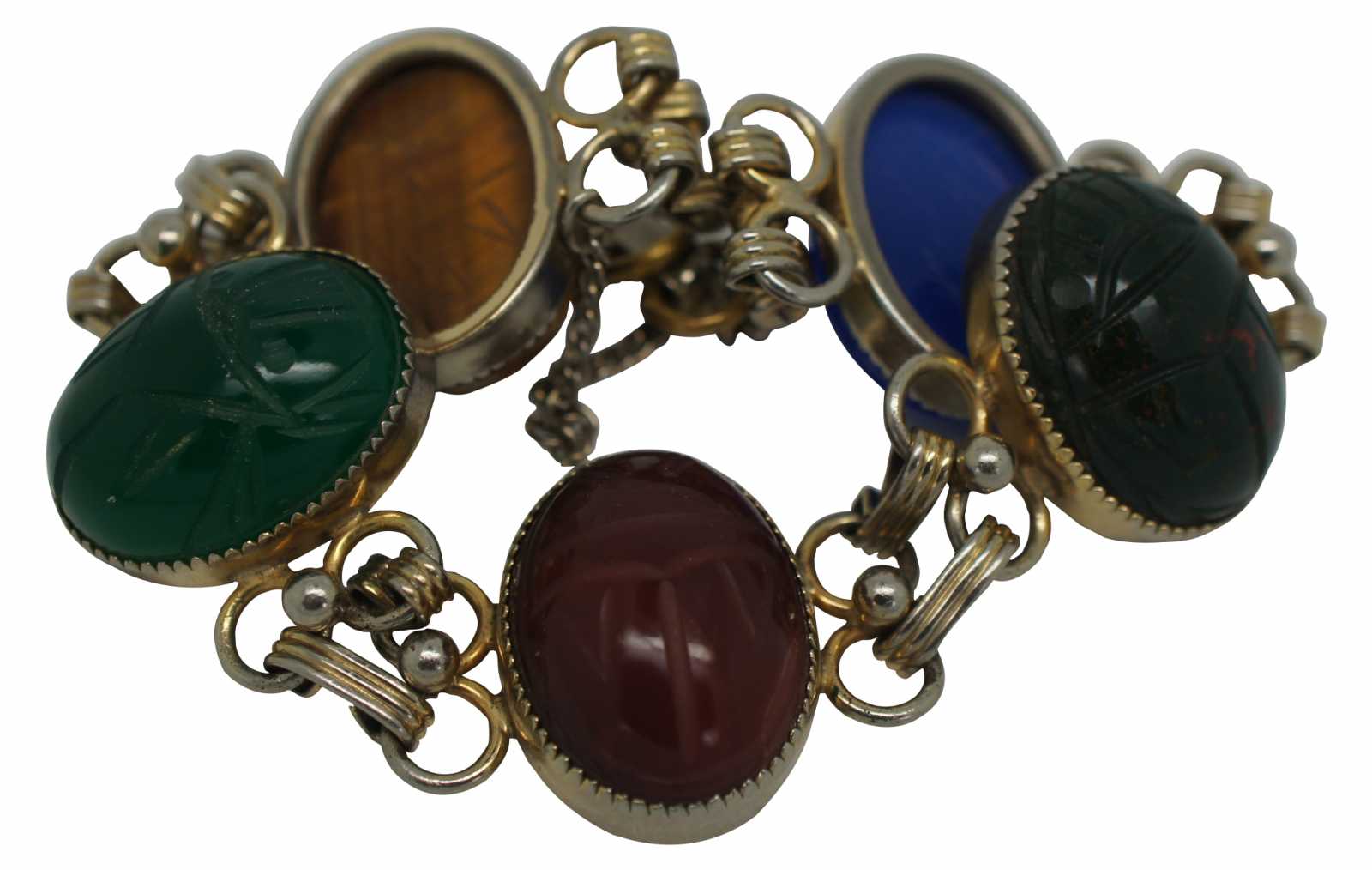 Vintage Star brand carved assorted gemstone scarab beetle bracelet with a silver/gold tone plated chain. Features jadite, lapis, carnilion, bloodstone and chatoyance (tigers eye).