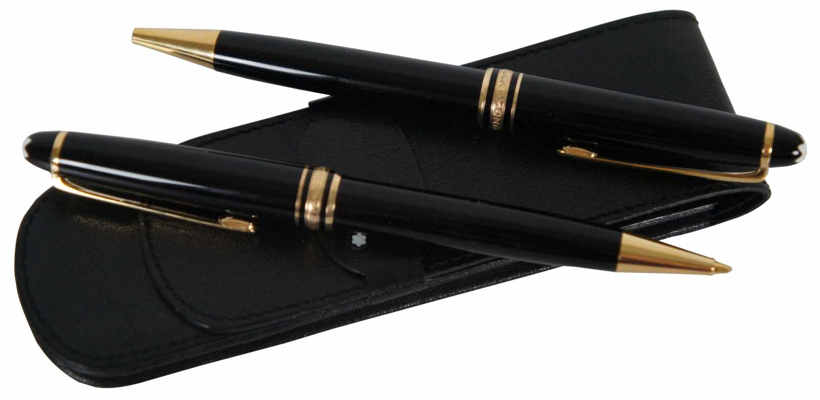 Vintage Montblanc Meisterstuck black ballpoint pen and mechanical pencil set with black leather two slot carrying case/pouch.