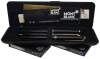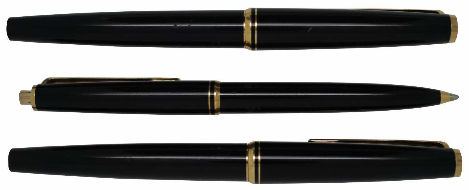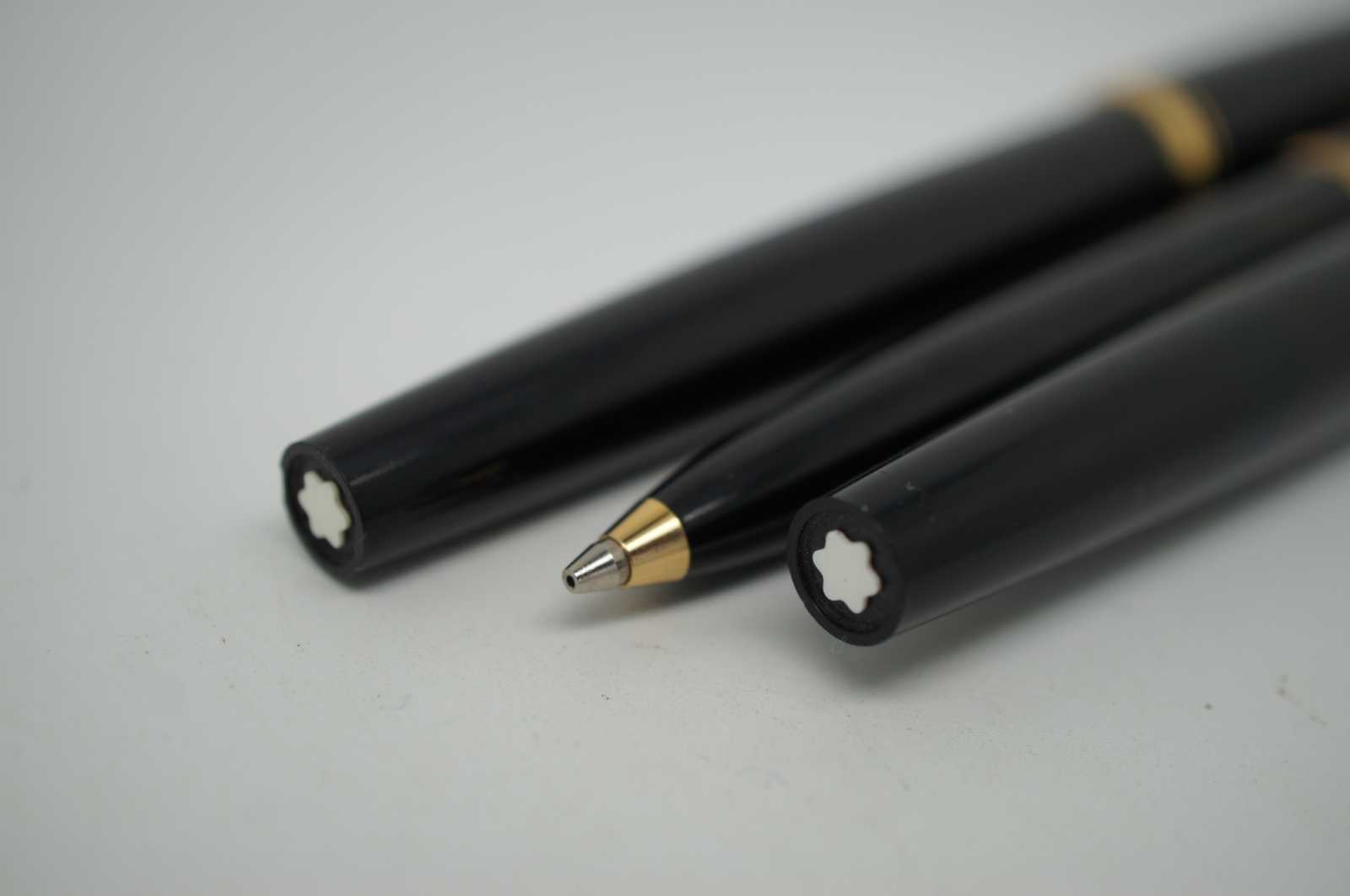 Vintage Montblanc three piece mechanical pencil and cartridge filled fountain pen set with 14K Gold 585 nibs. Two 10 count packages of Black and Royal Blue ink cartridges included.