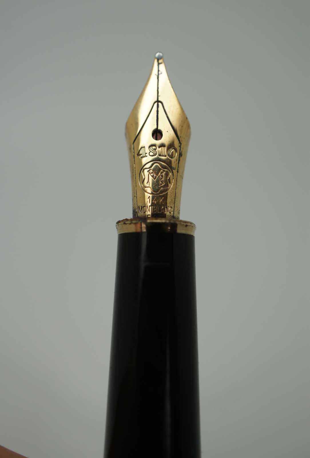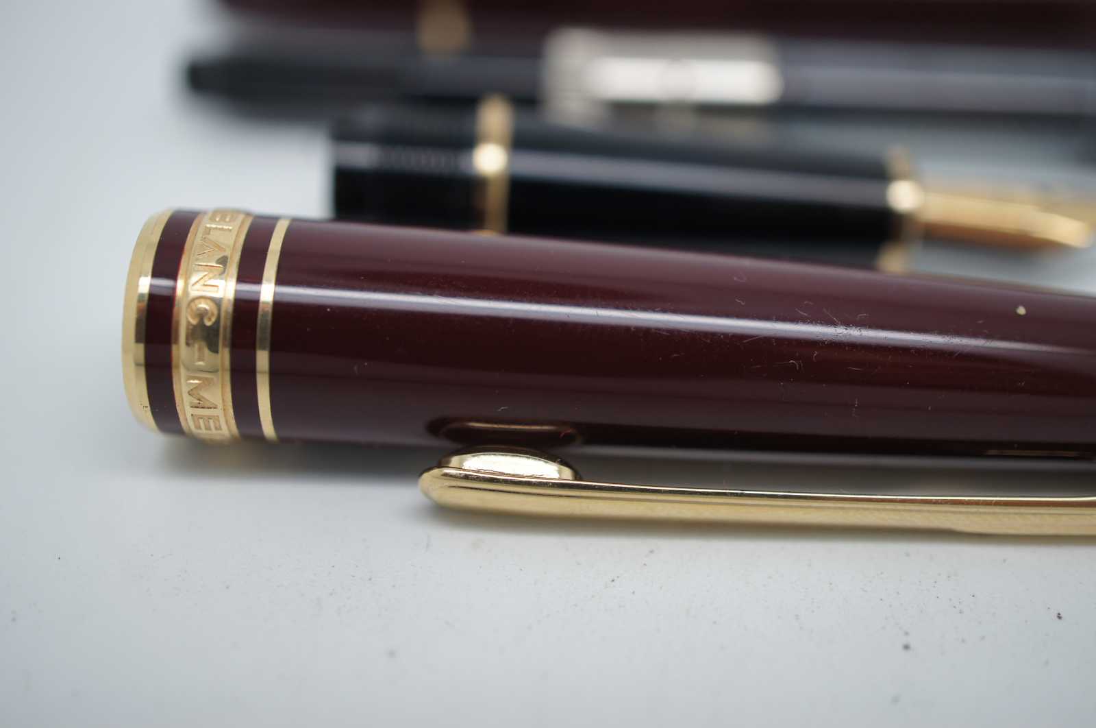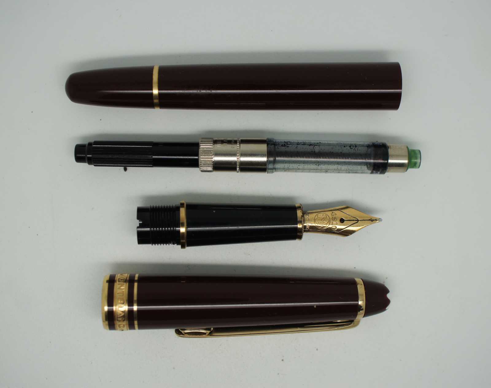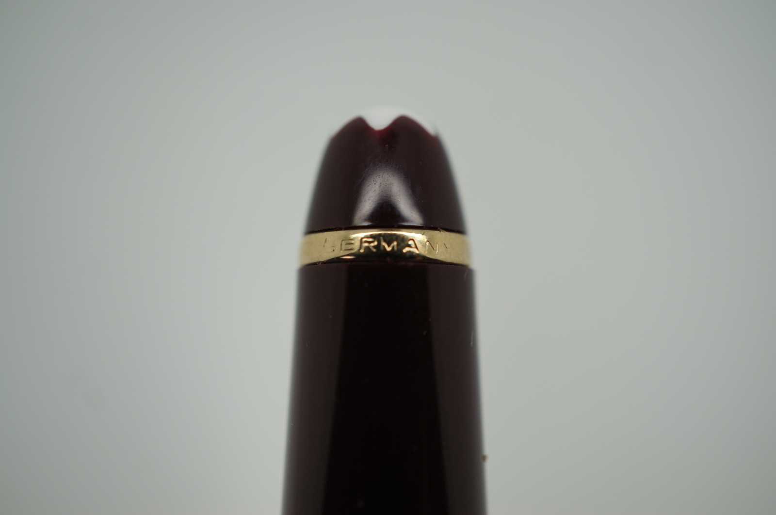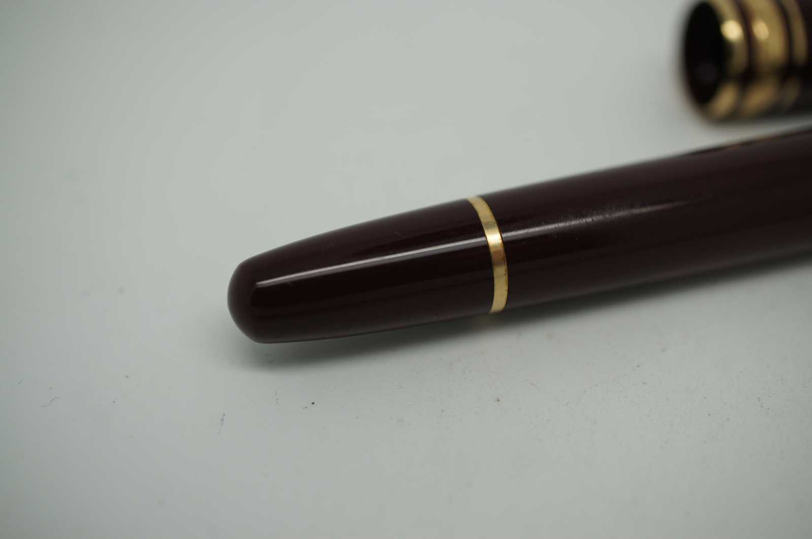 Vintage Montblanc Meisterstuck No 144 cartridge fountain pen in Bordeaux red with 4810 14K gold 585 nib; black and royal blue 10 piece replacement cartridge packages included.