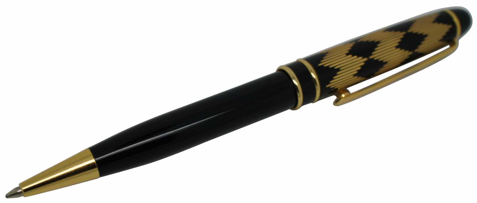 Vintage Montblanc Solitaire ballpoint pen in black with a gold hatch mark diamond pattern on the barrel.