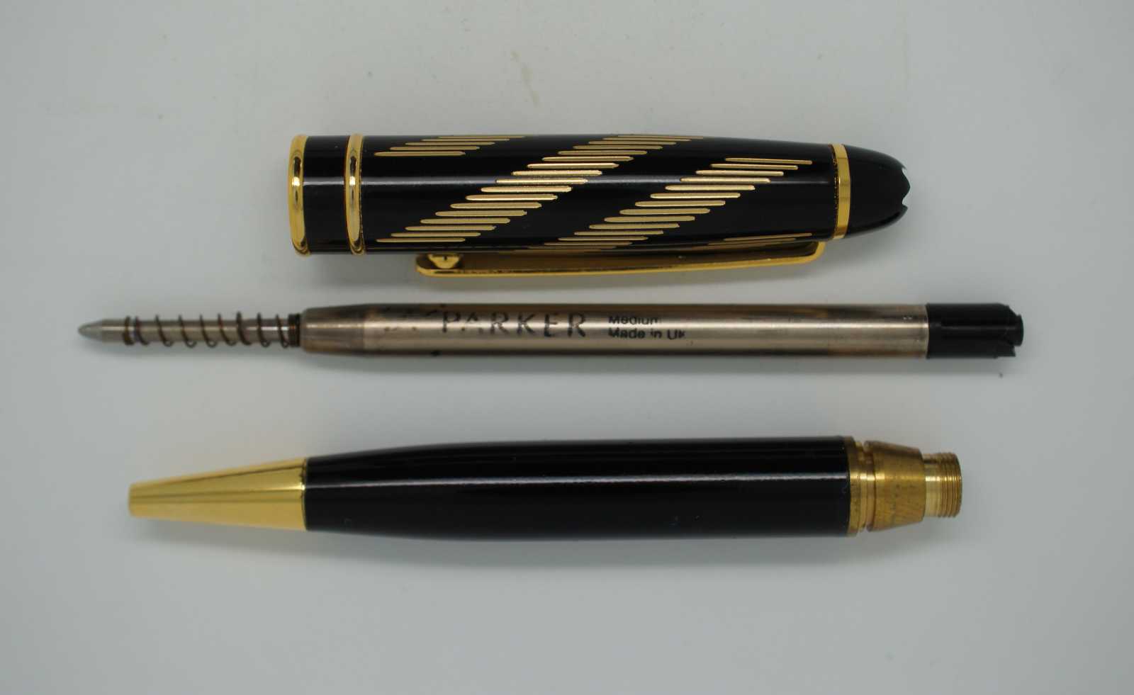 Vintage Montblanc Solitaire ballpoint pen in black with a gold hatch mark diagonal stripes on the barrel.
