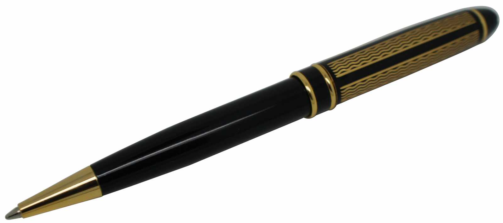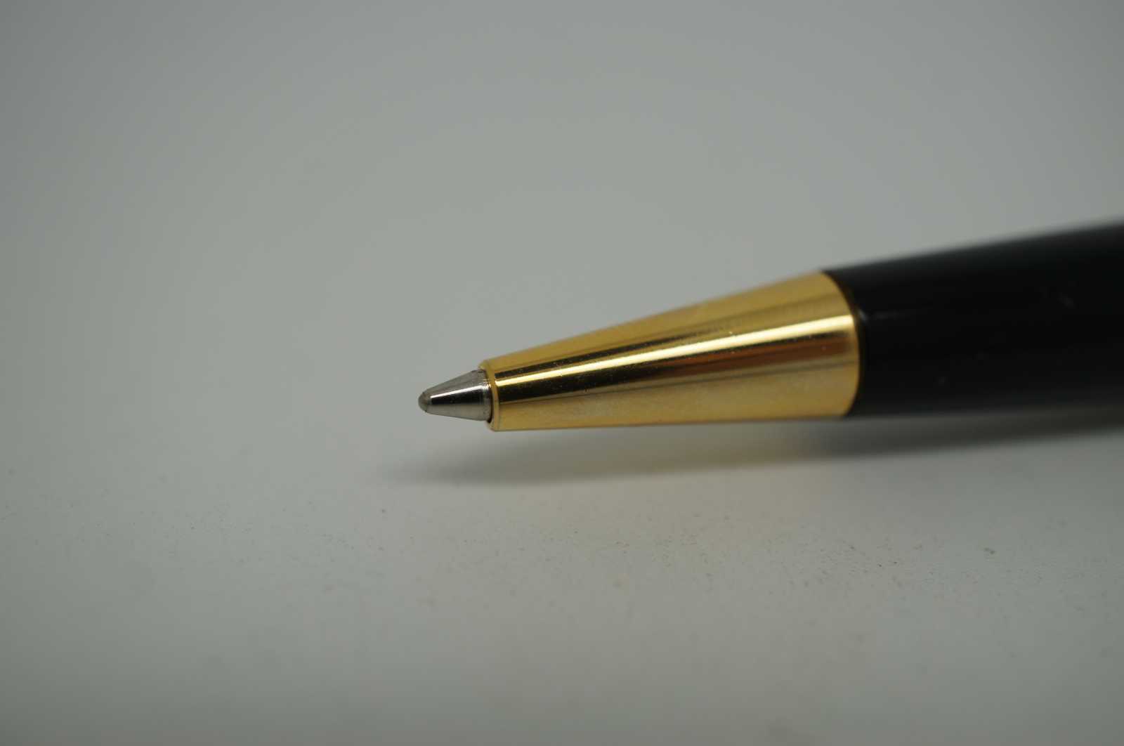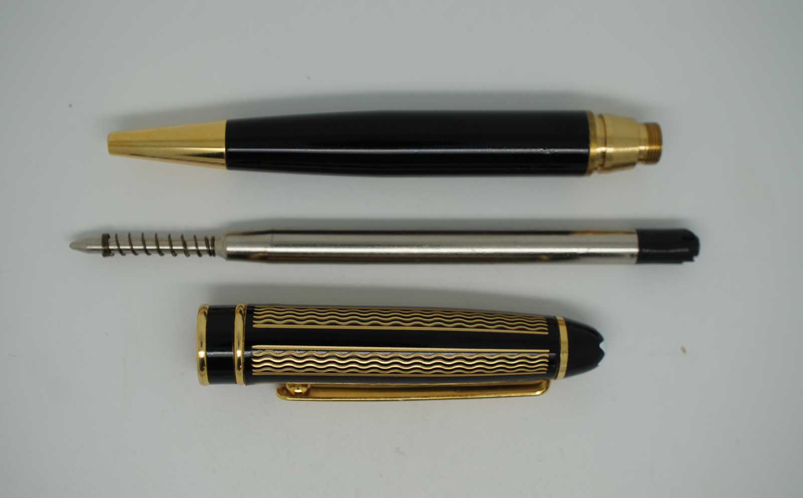 Vintage Montblanc Solitaire ballpoint pen in black with a gold wavy stripe pattern on the barrel.