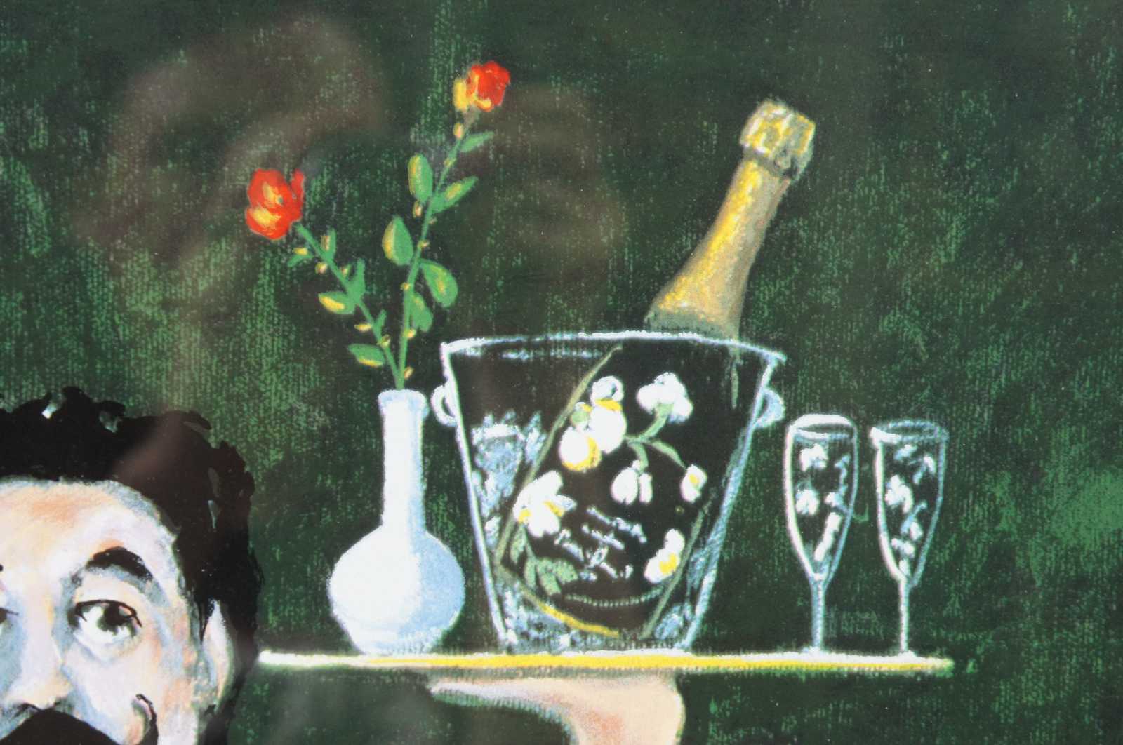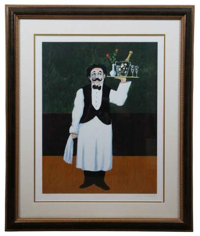 Pencil signed and numbered 340/595 lithograph print of a French waiter carrying a tray with iced Champagne and a vase of flowers.