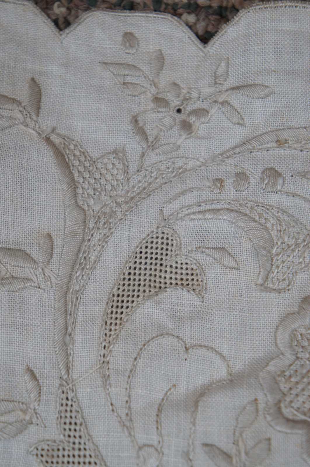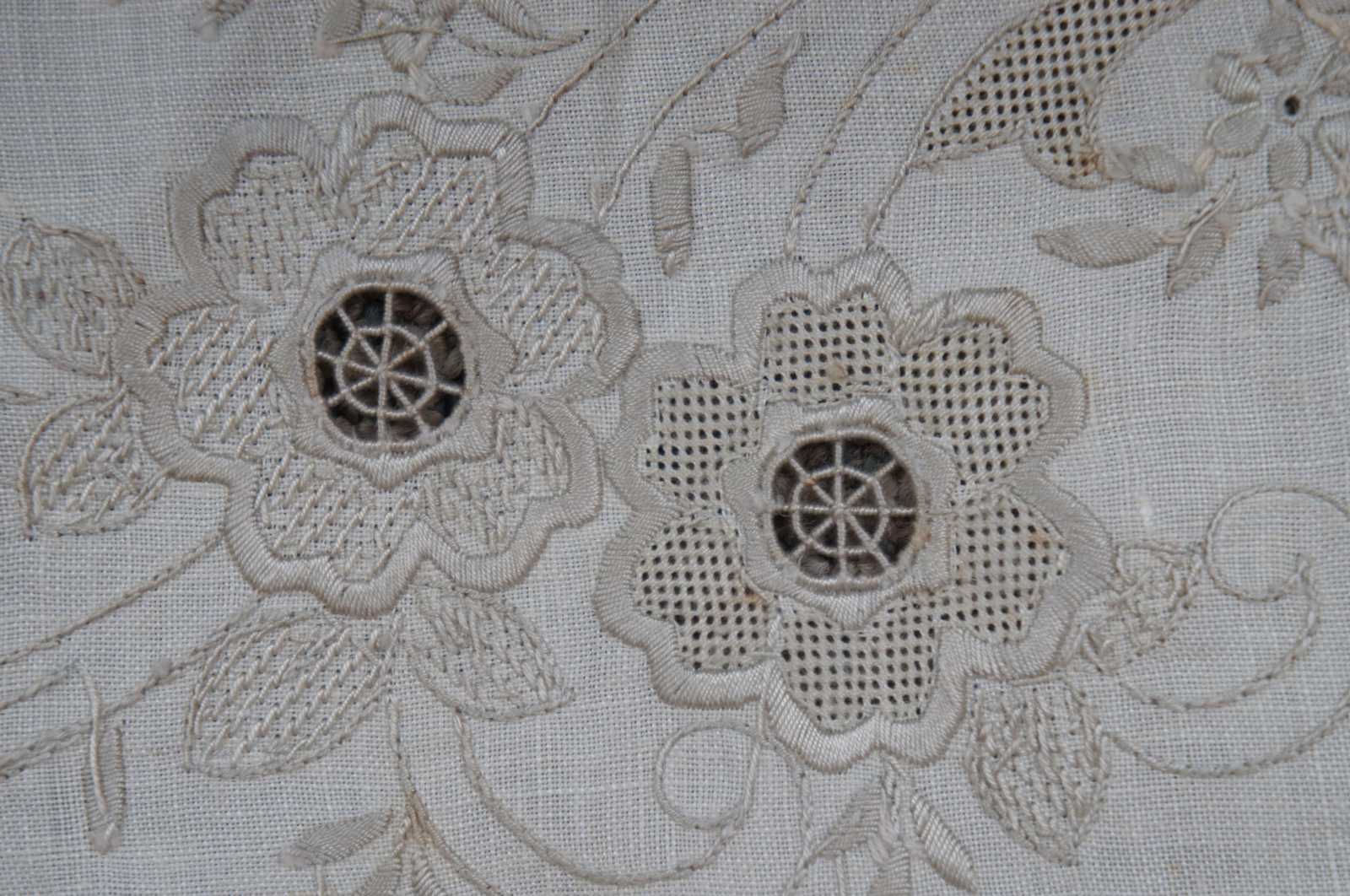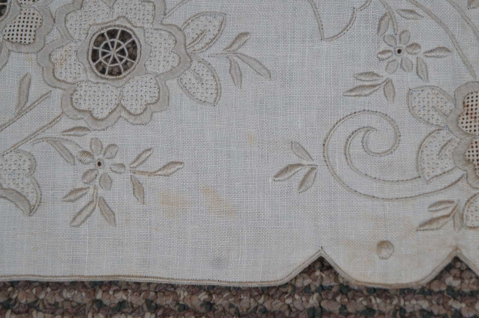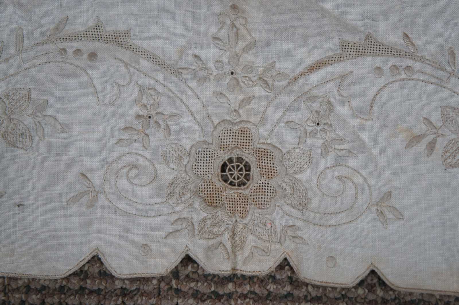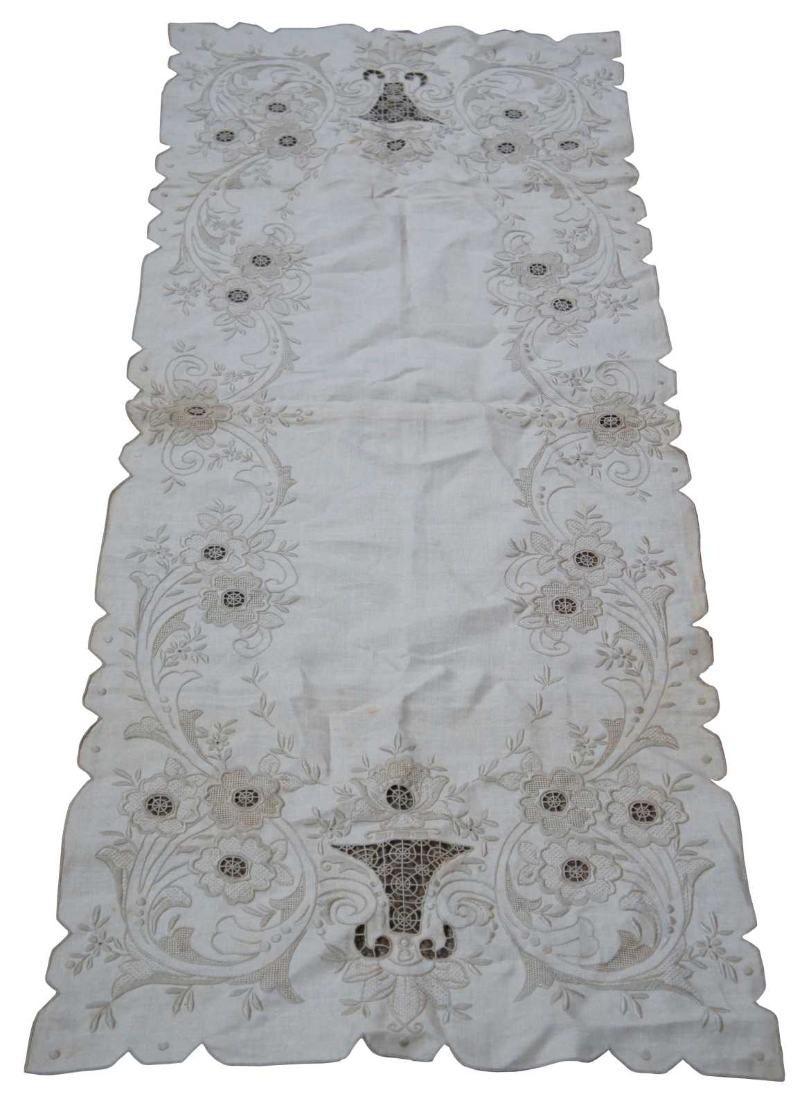 Antique white linen table runner with scalloped edge, beige embroidered flowers and reticulated lace accents.