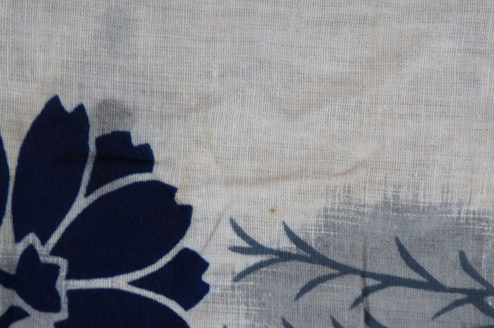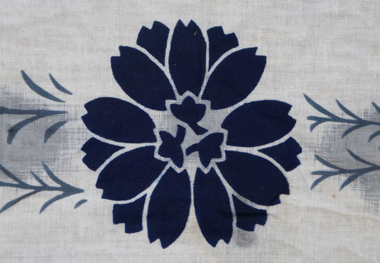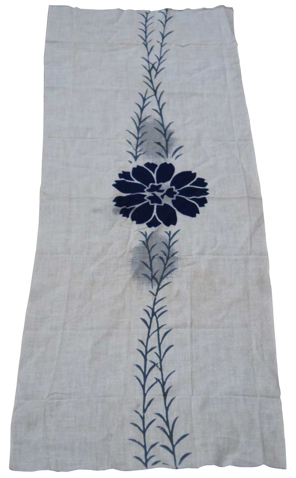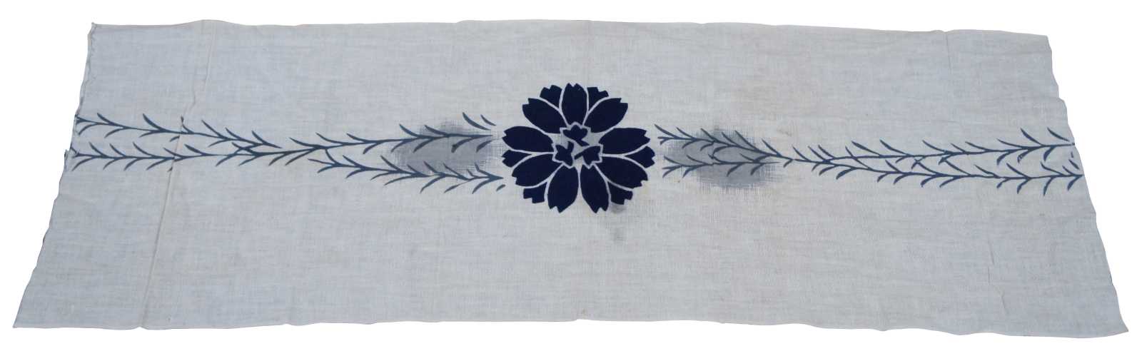 Vintage Japanese table runner with a blue flower and crossing vines of green leaves.