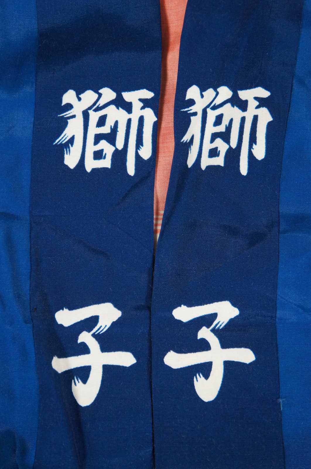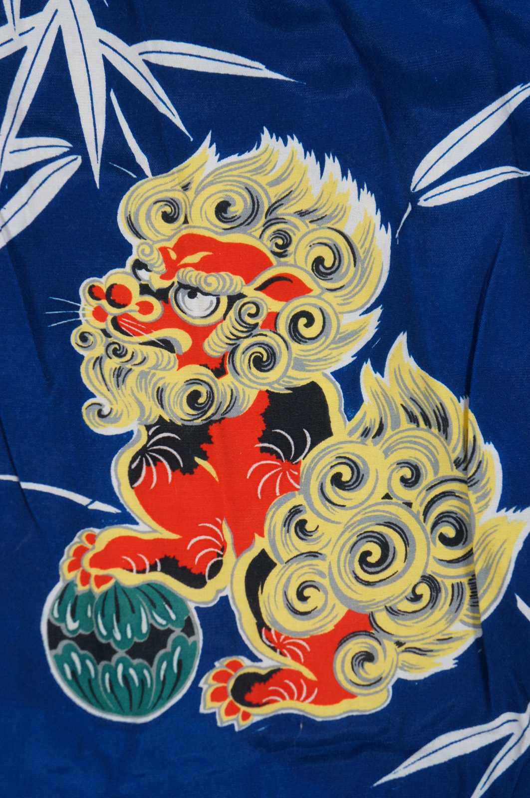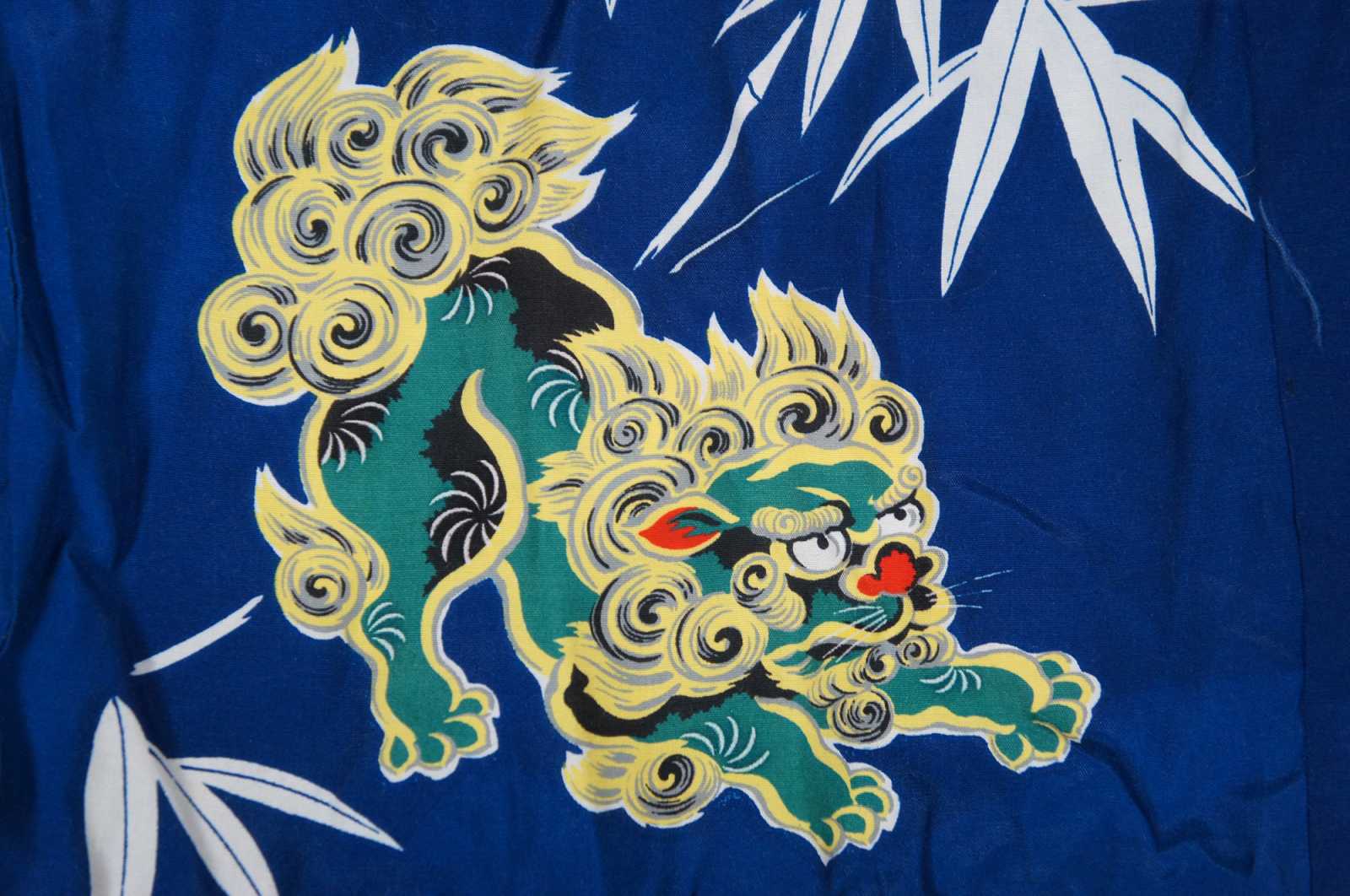 Vintage mid century short kimono robe or jacket, in blue with calligraphy and patterned with Chinese guardian lions.