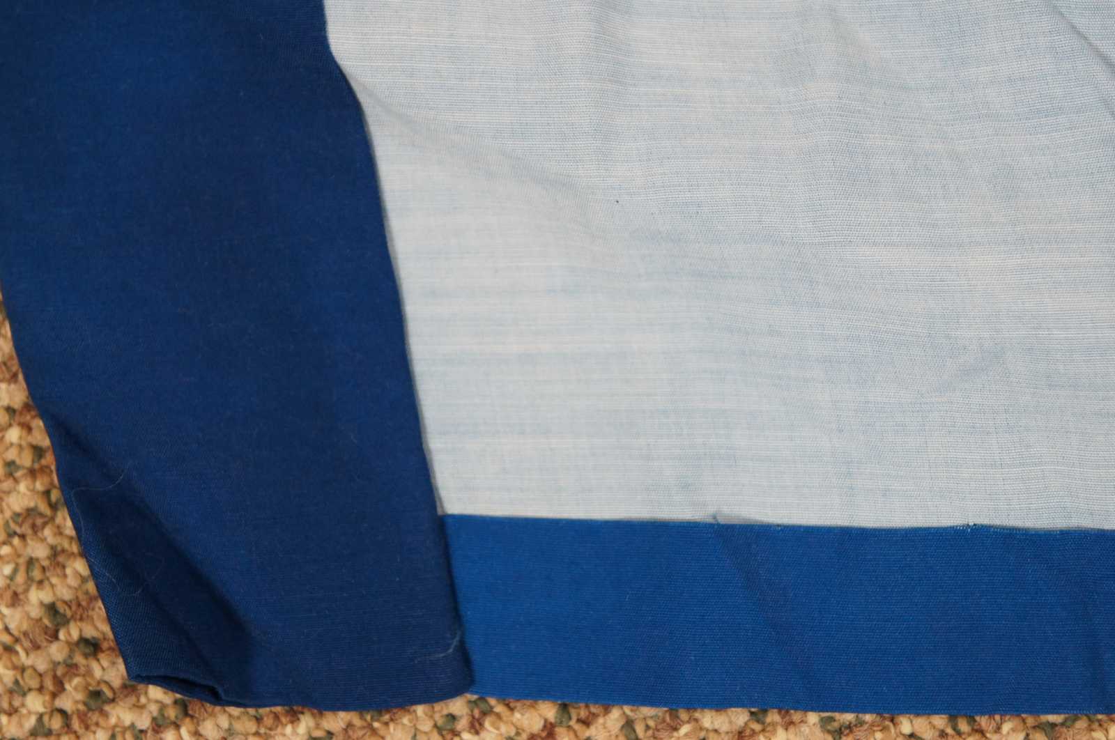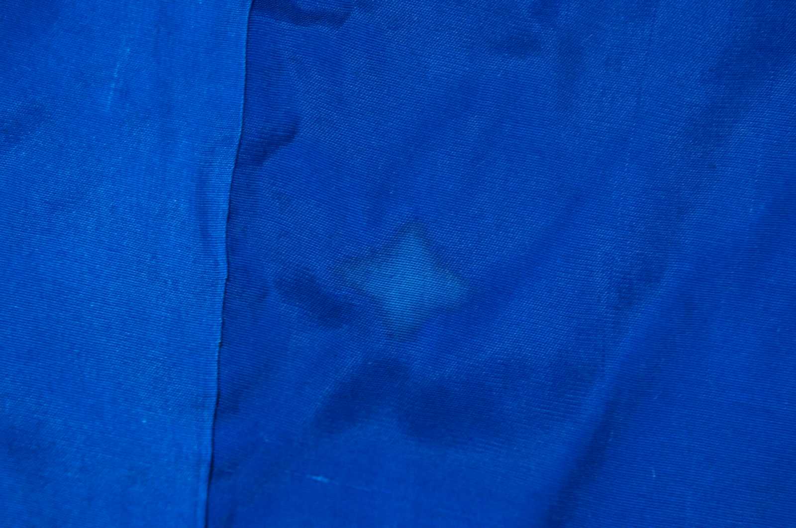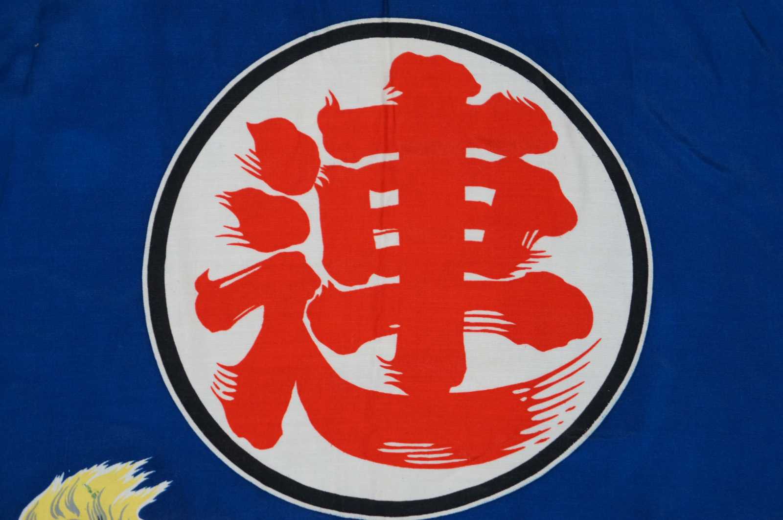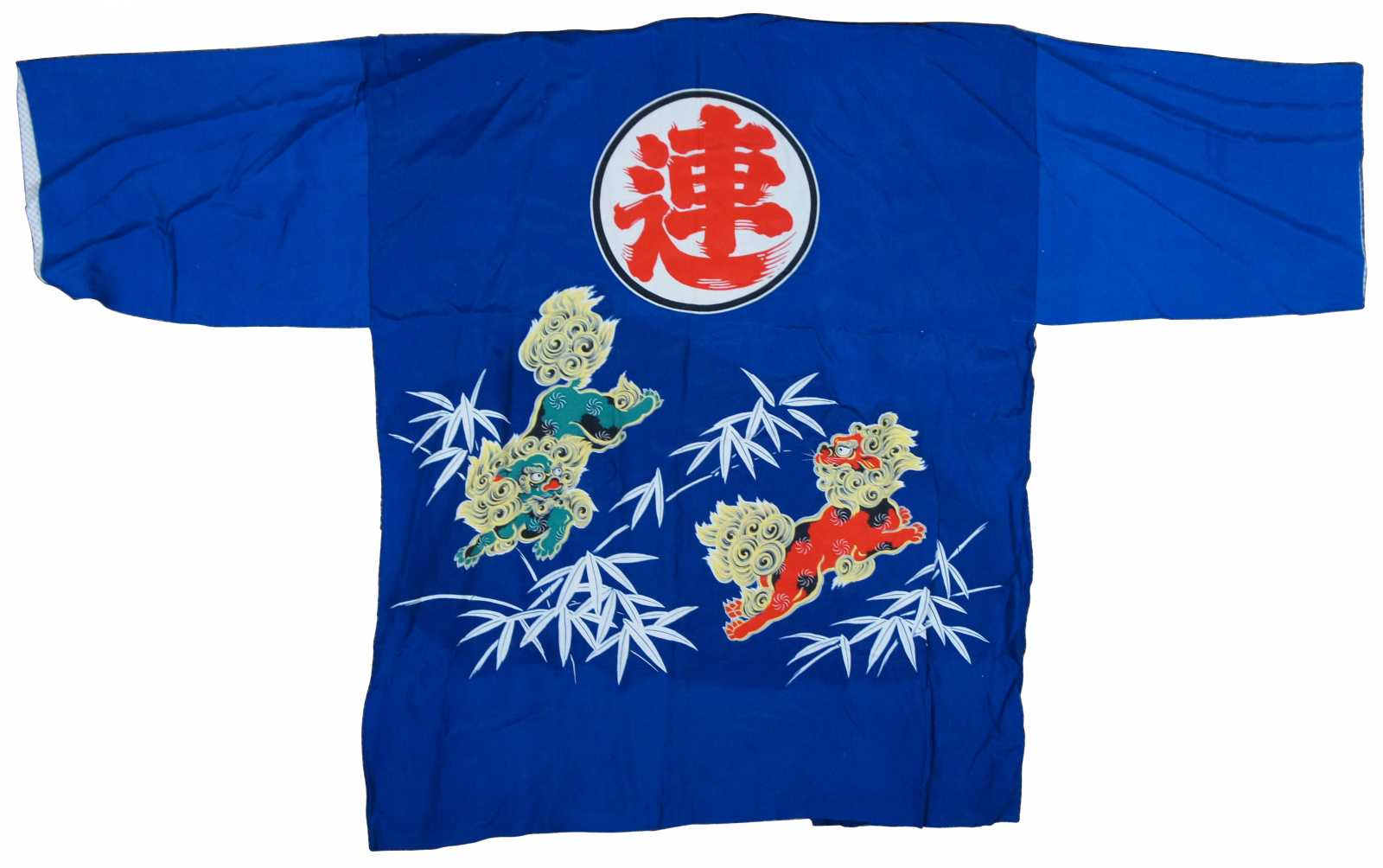 Vintage mid century short kimono robe or jacket, in blue with calligraphy and patterned with Chinese guardian lions.