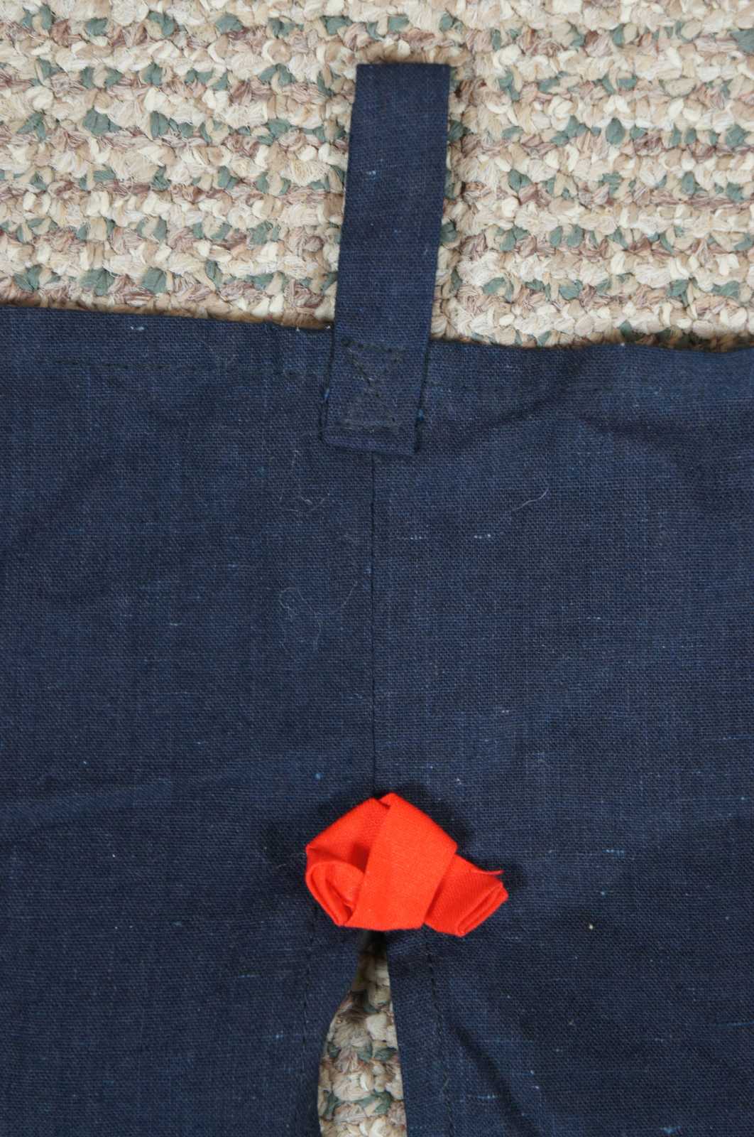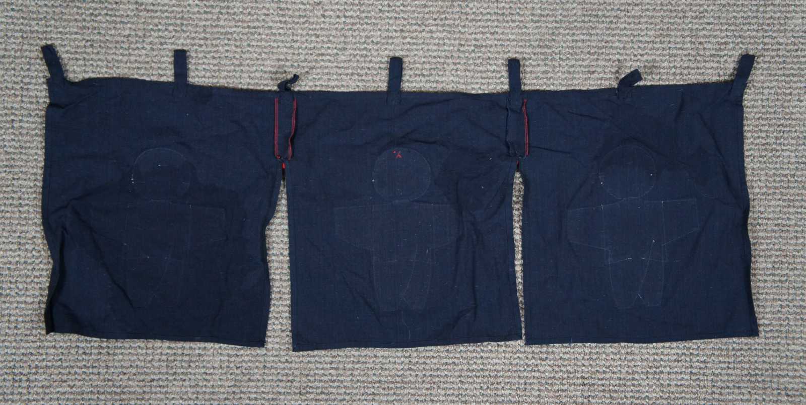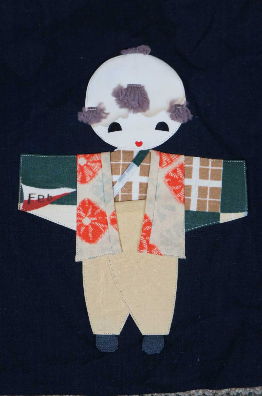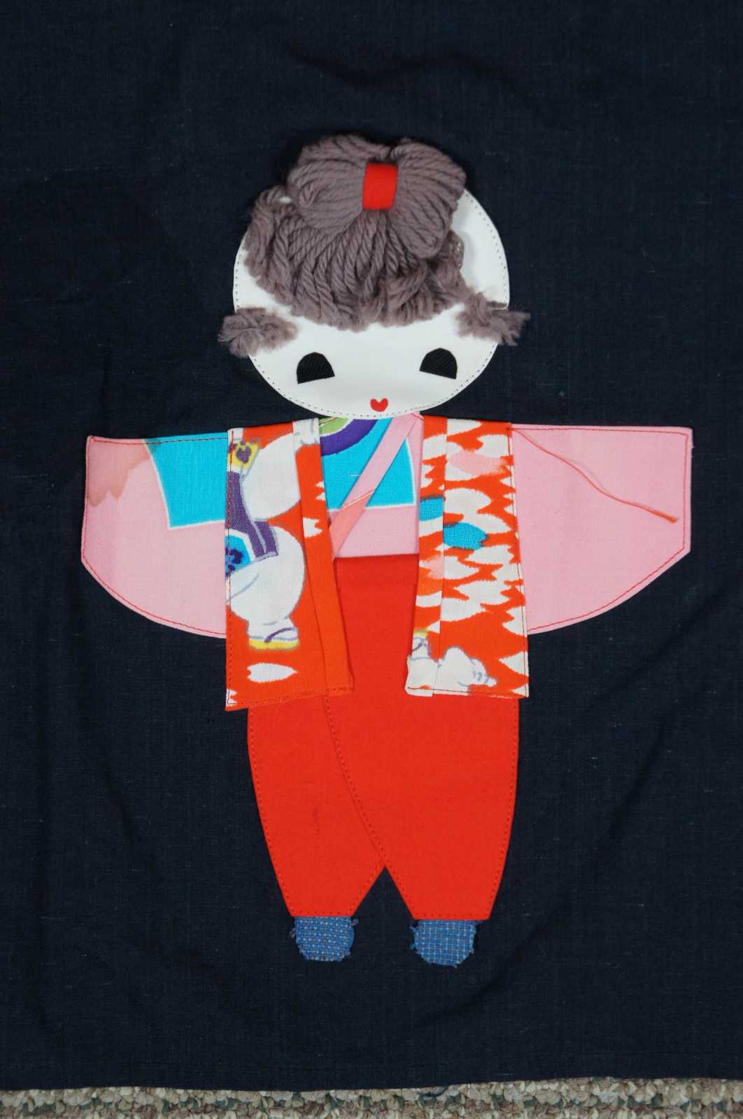 Vintage Japanese three panel cloth wall hanging with charming kawaii type applique figures dressed in multicolored kimonos.