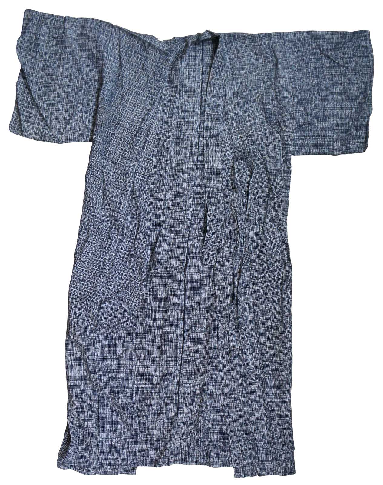 Vintage Japanese cotton Yukata kimono or robe featuring a blue and white modernist print.