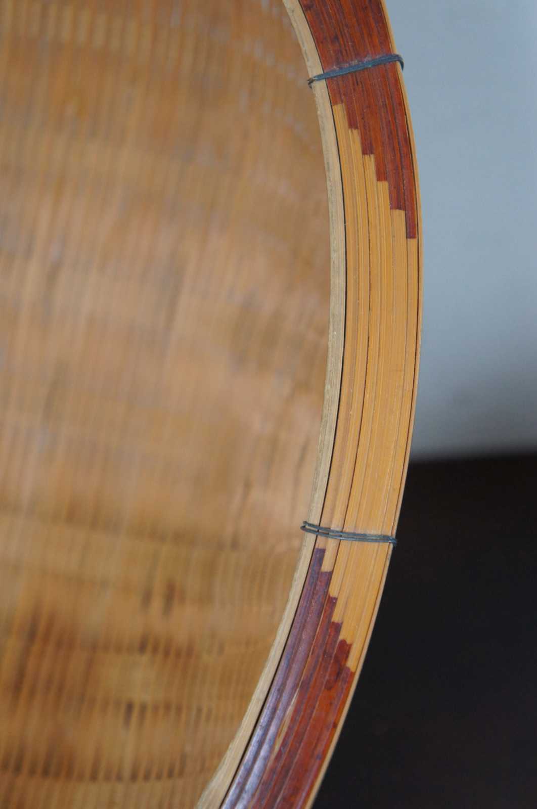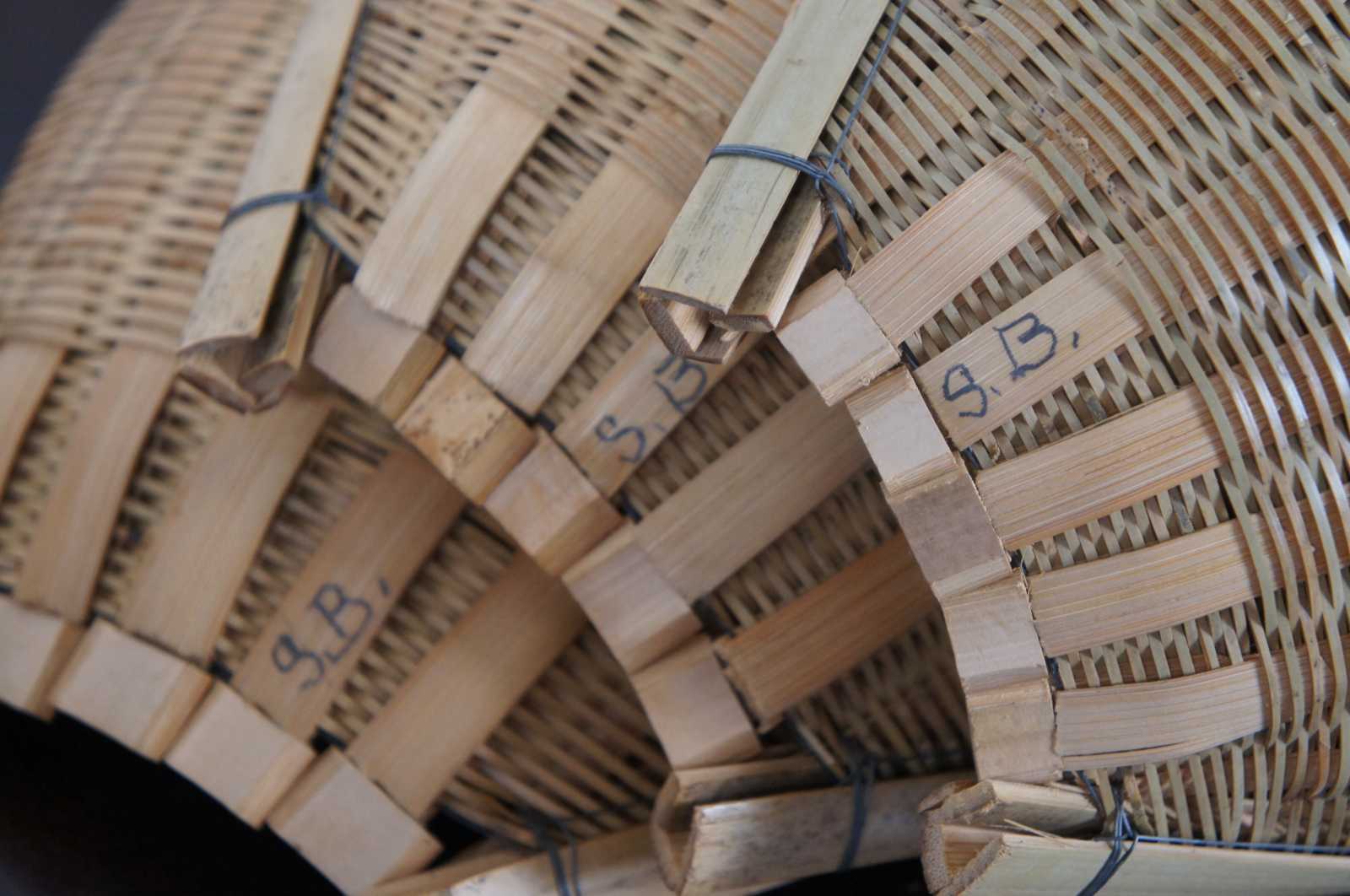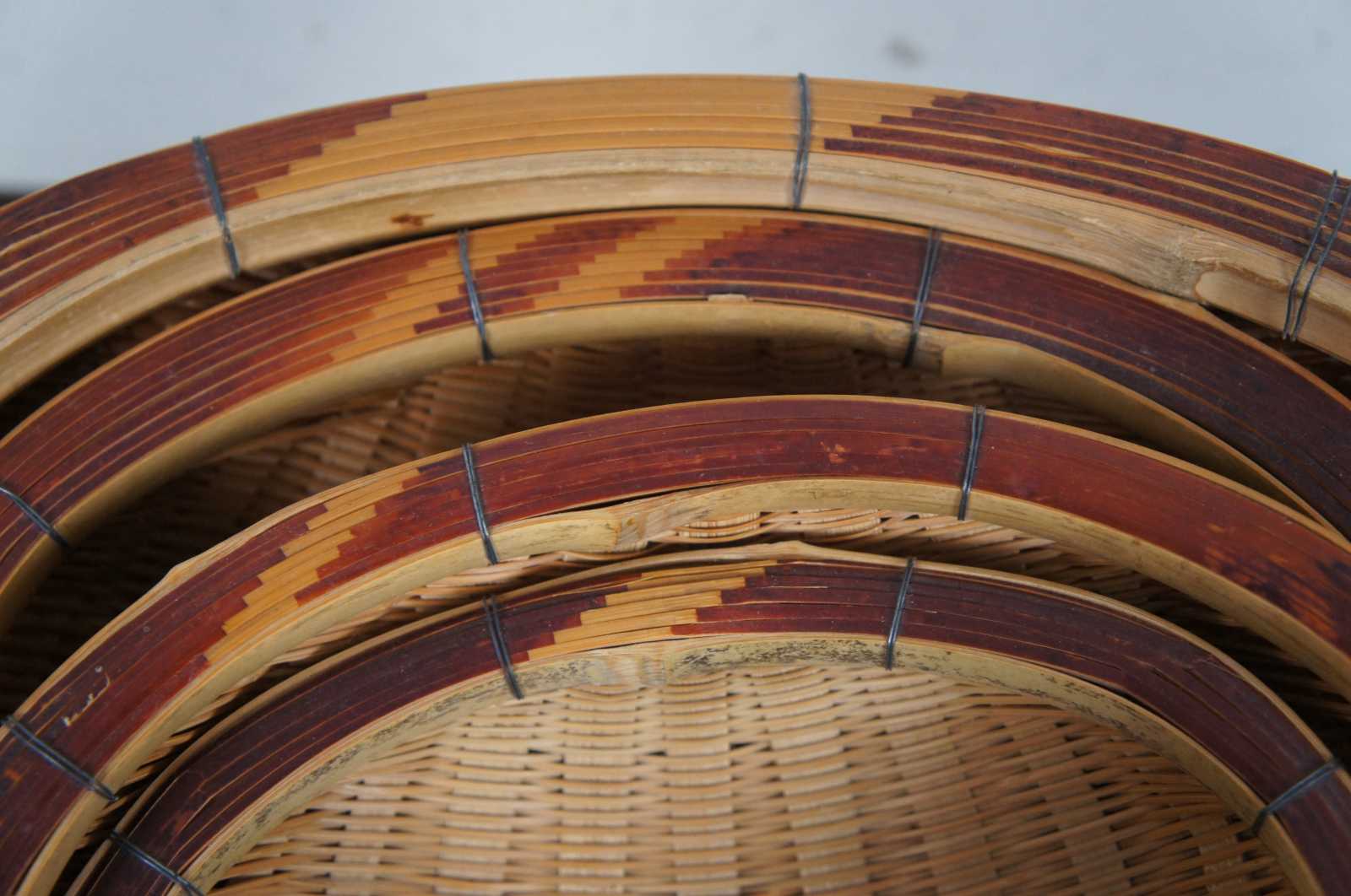 Set of four primitive hand woven nesting baskets in the shape of dust pan, fruit bowl or shovel.