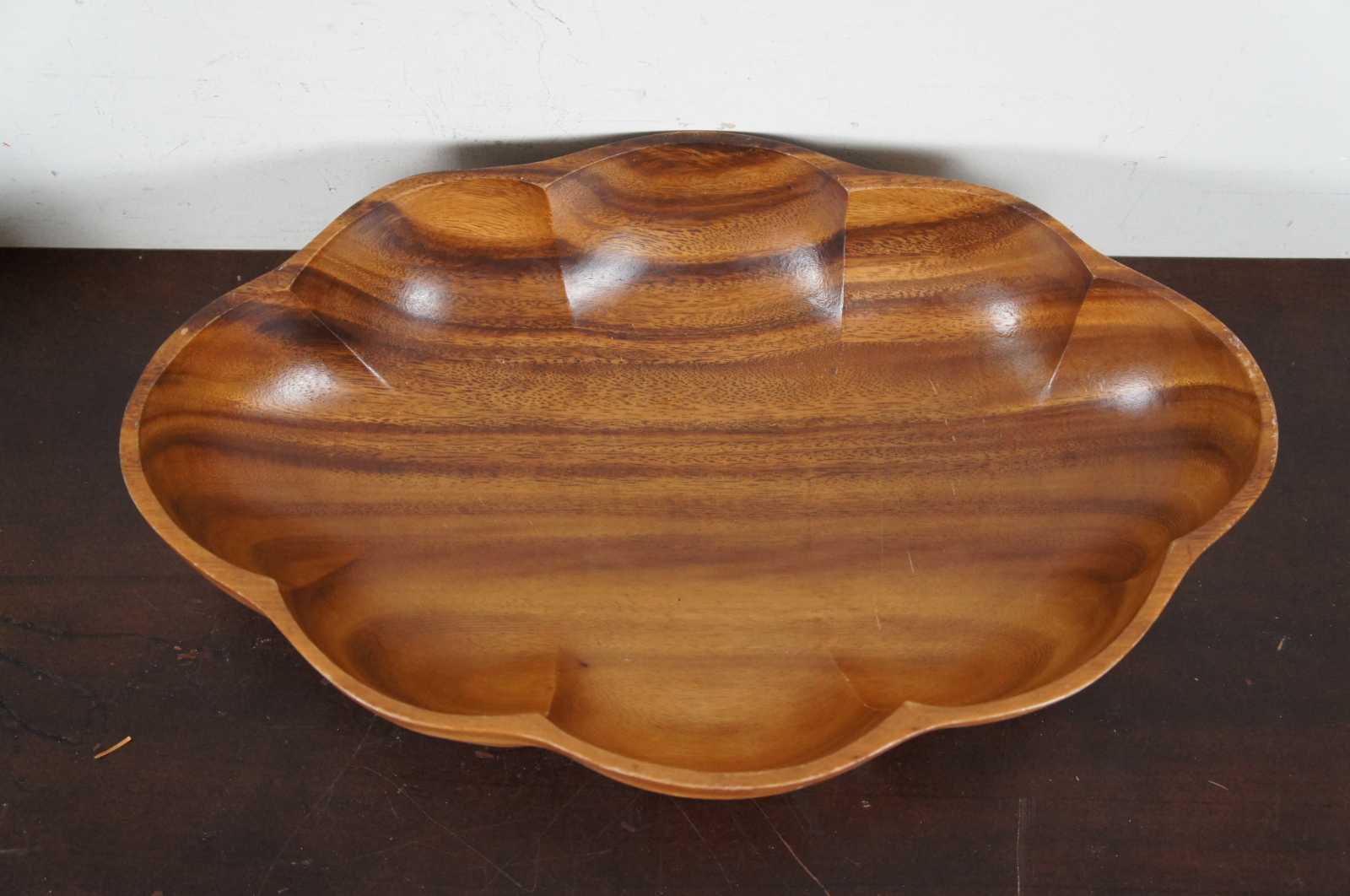 Vintage hand carved wooden salad bowl set with scalloped edges. Includes serving dish and five personal bowls.