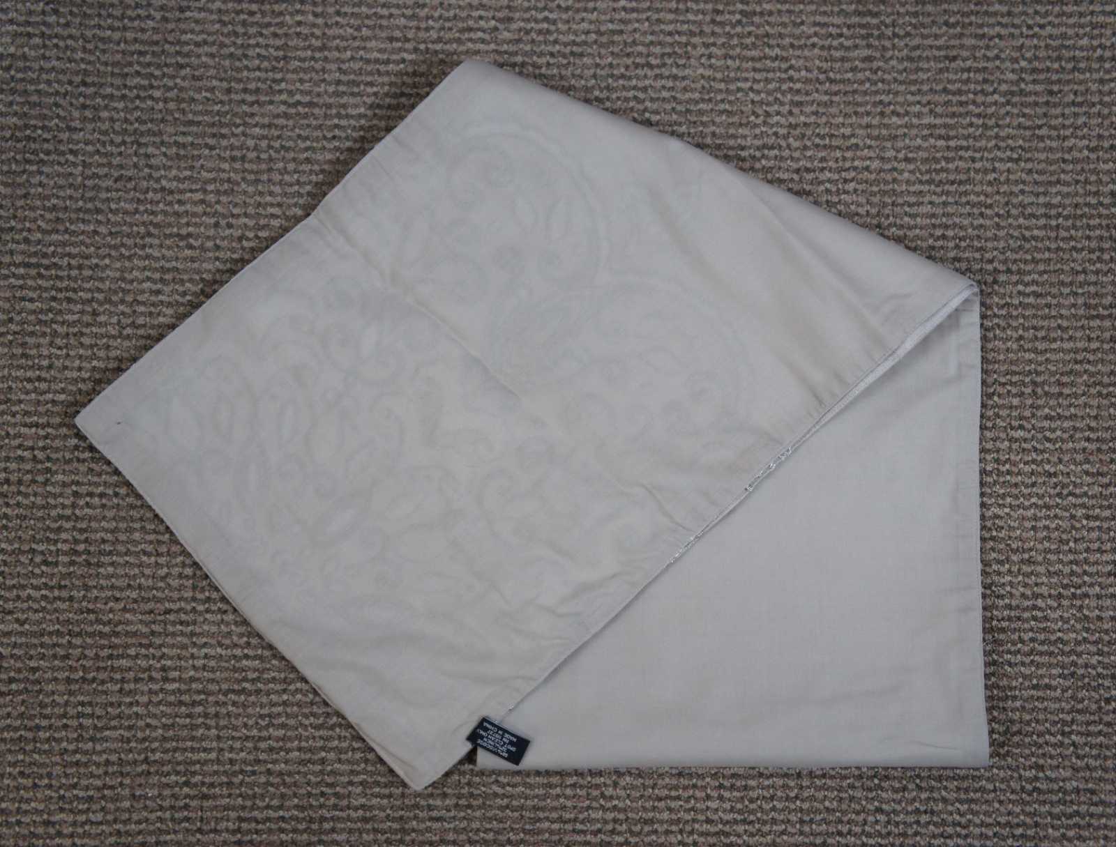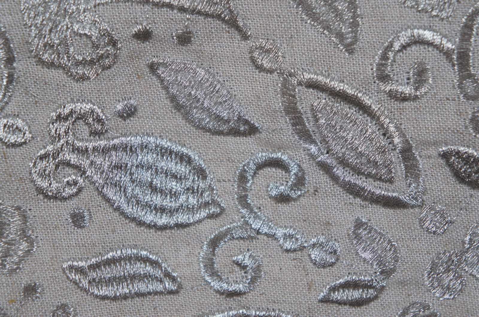 Vintage rectangular table runner by Tahari Home in unbleached linen viscose with slightly metallic floral embroidery.