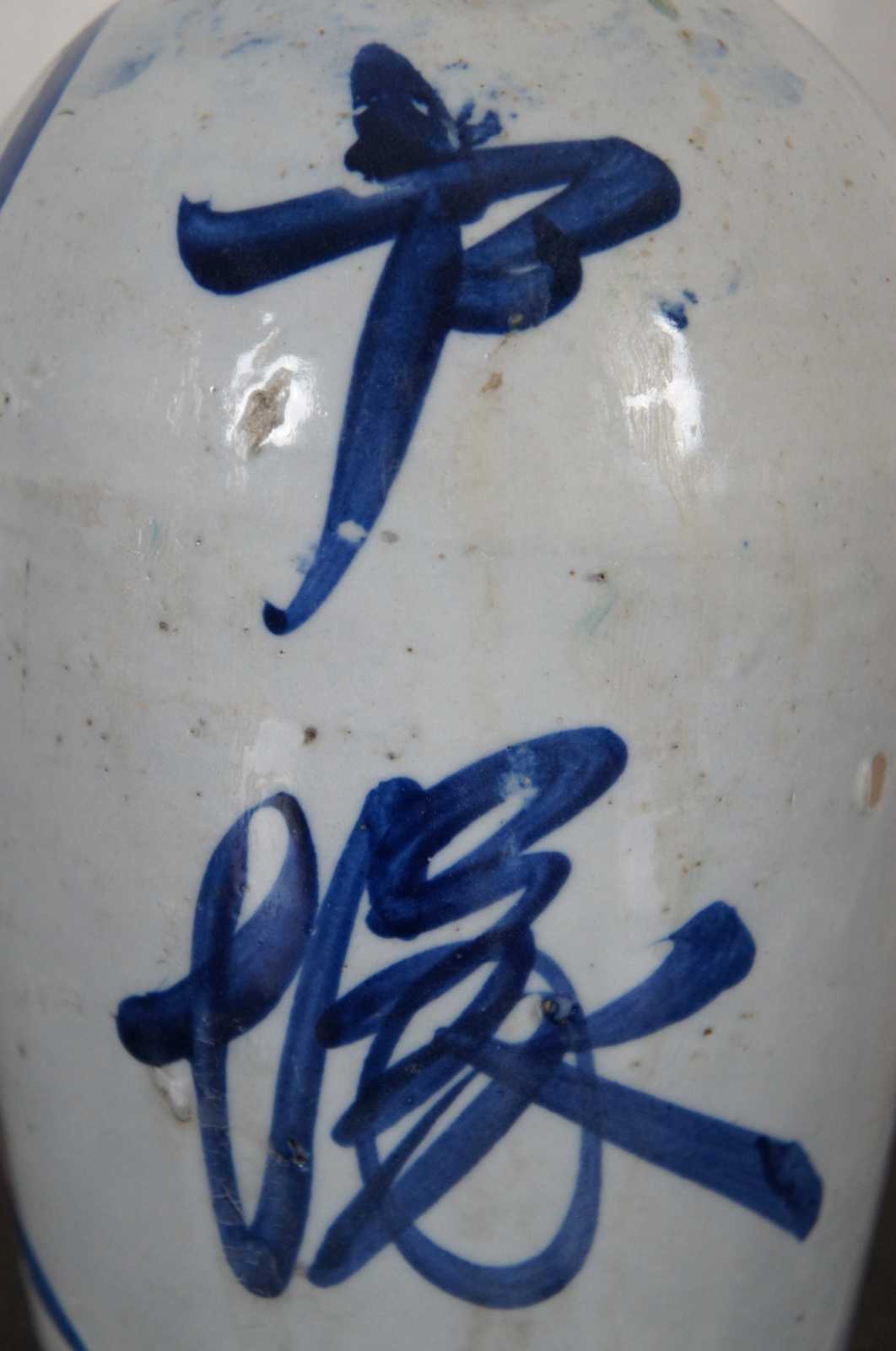Antique Japanese stoneware tokkuri or sake bottle with painted blue characters.