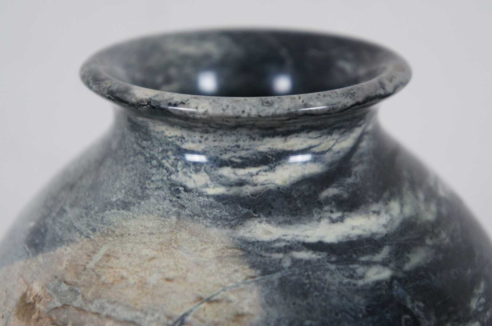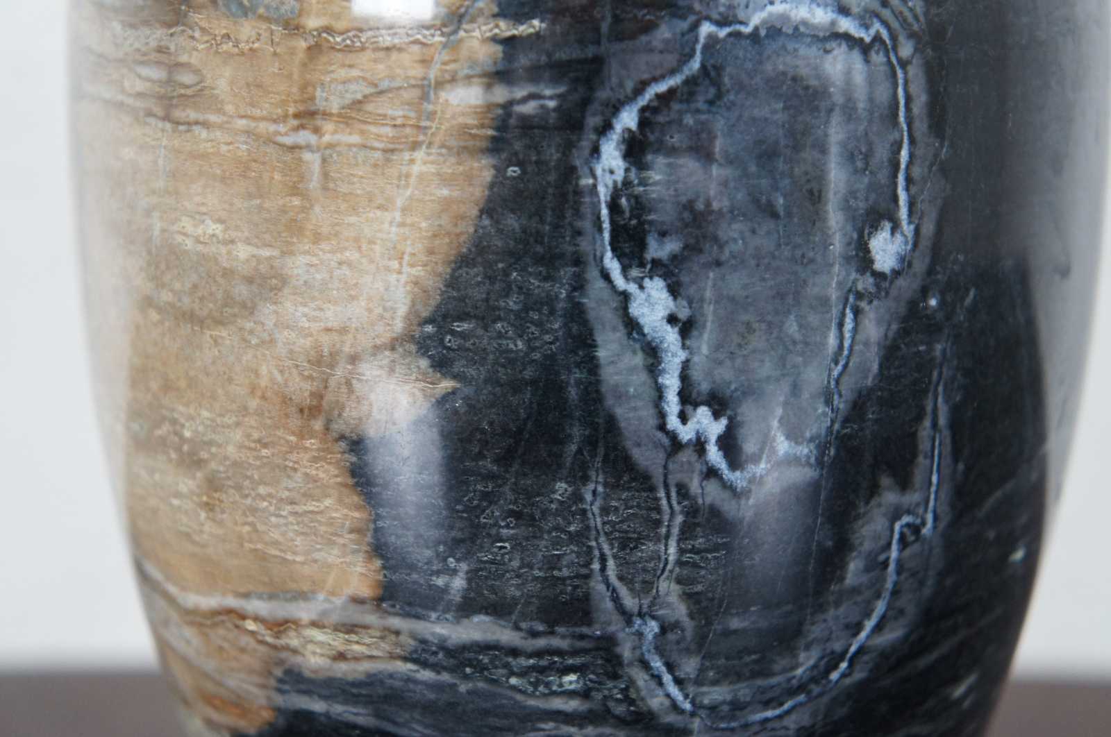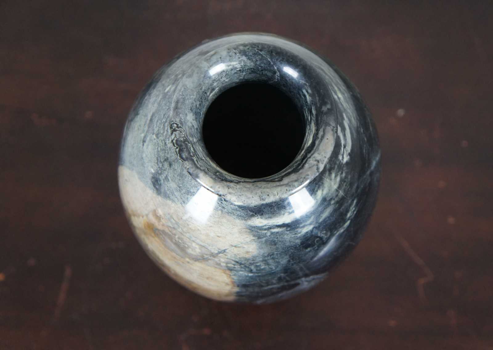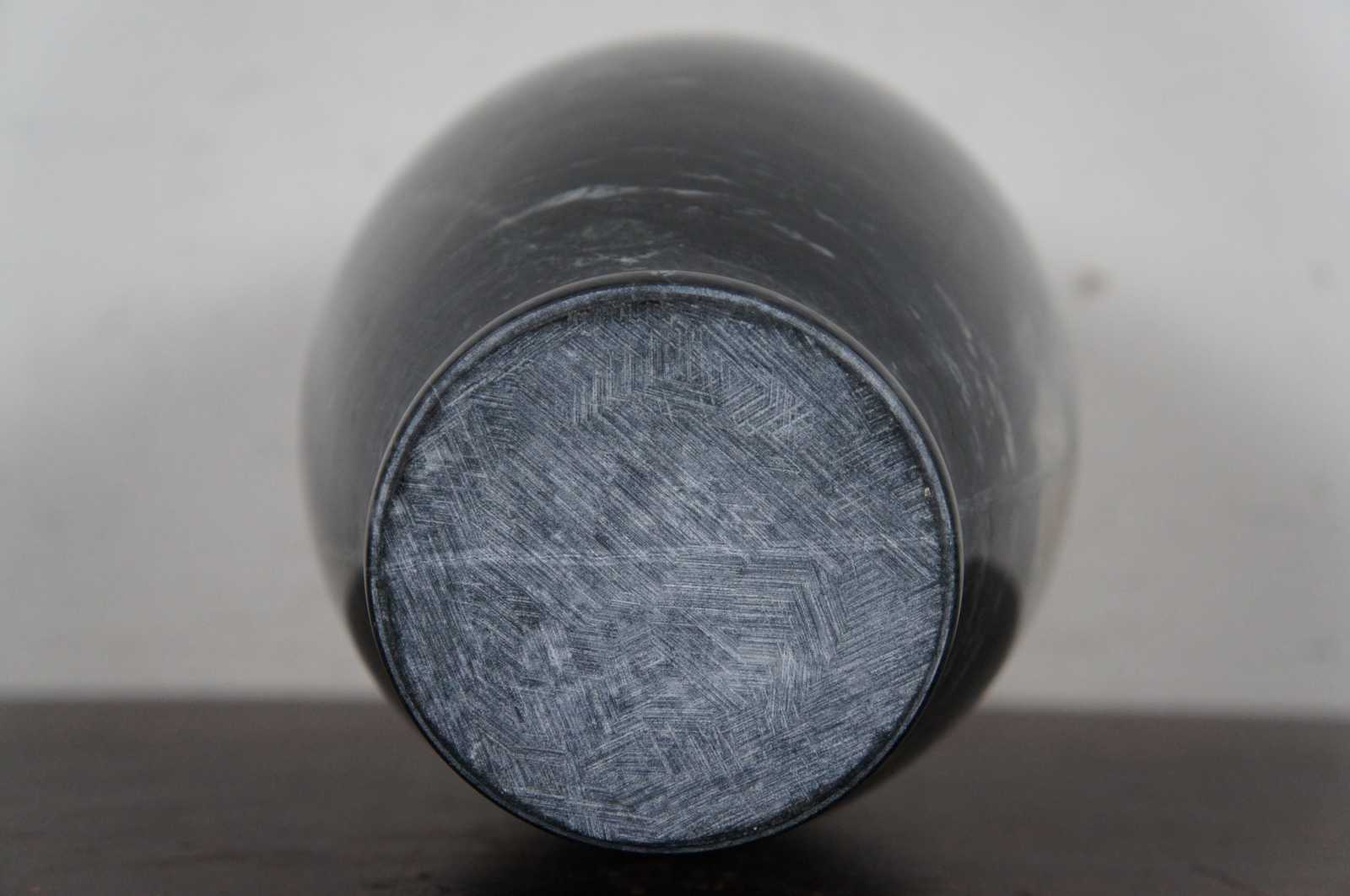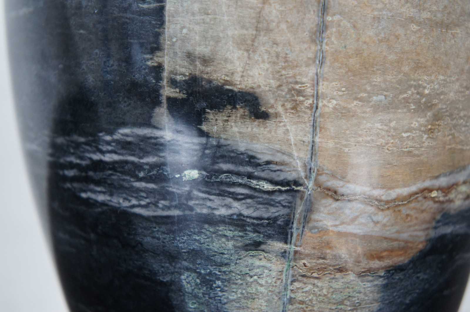 Heavy natural polished marble vase in dark gray with a light brown patch.