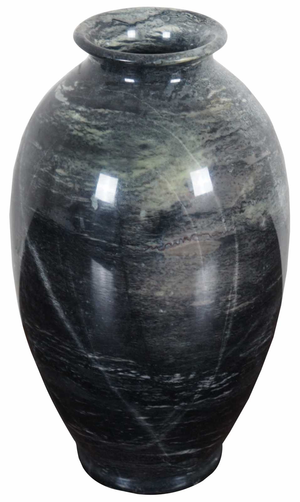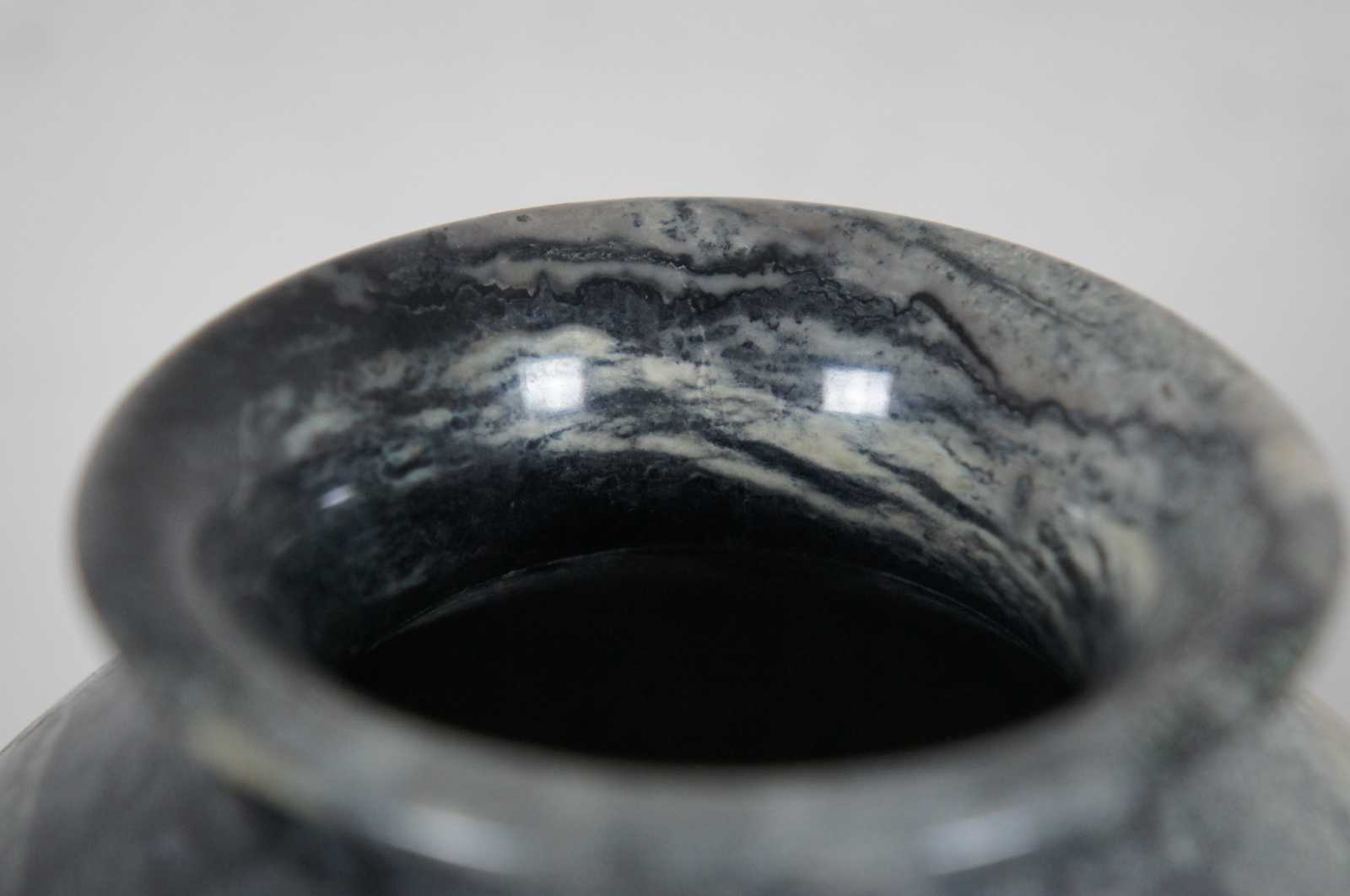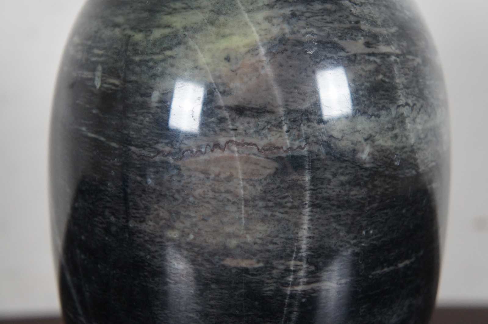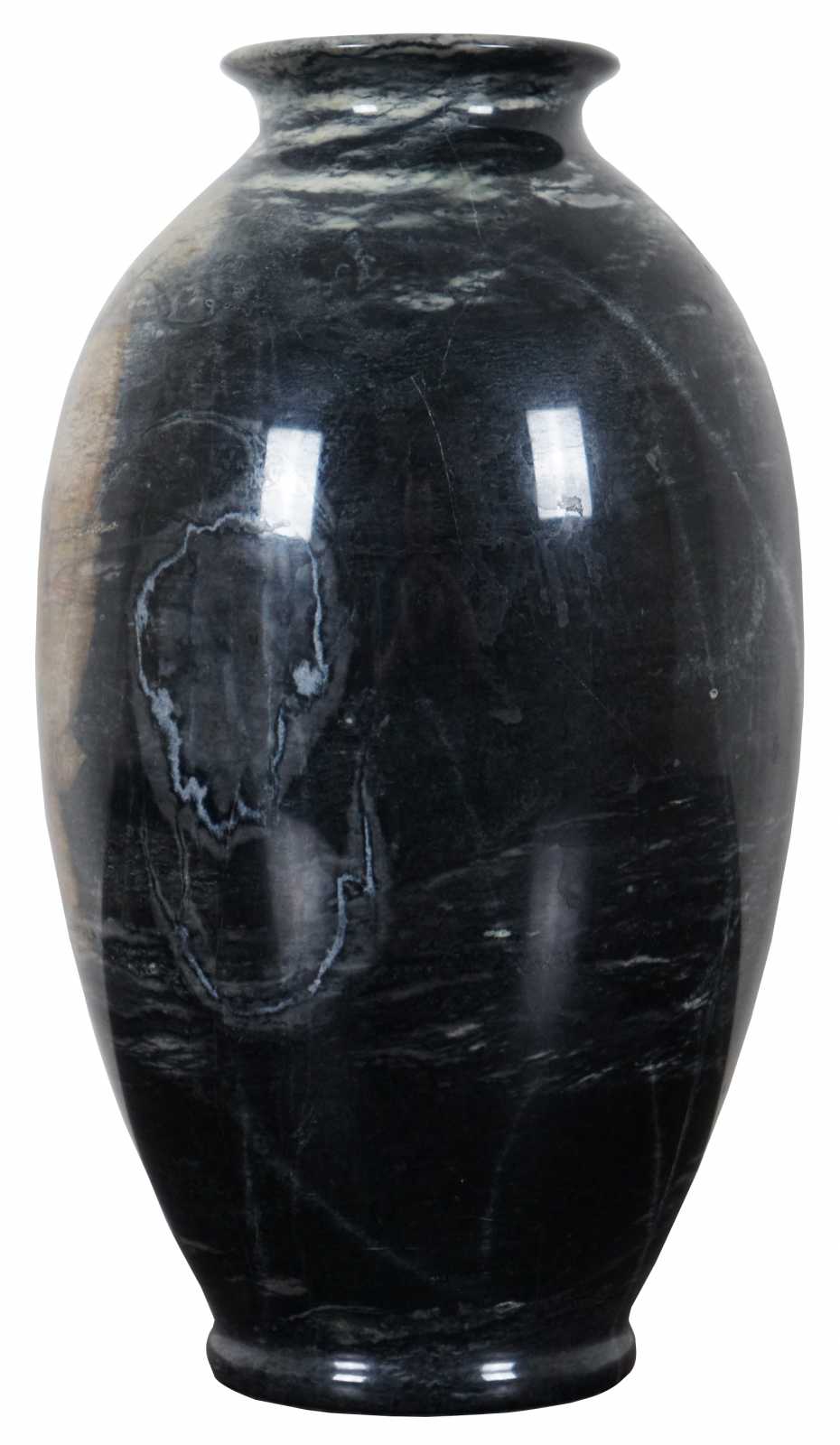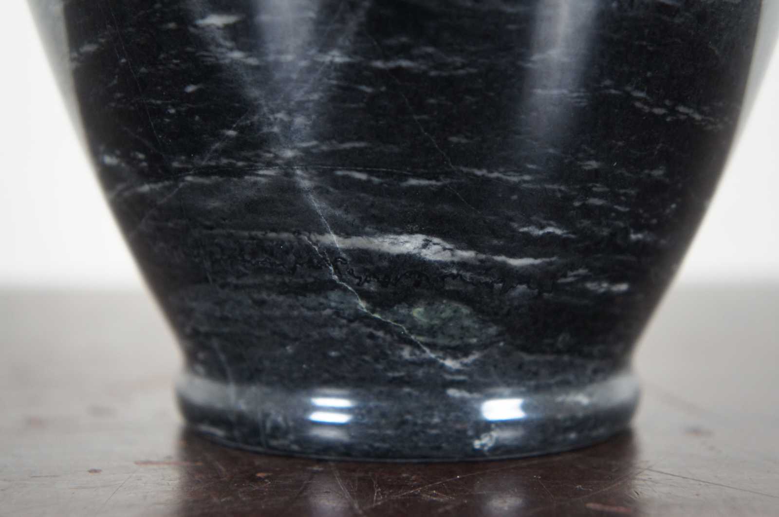 Heavy natural polished marble vase in dark gray with a light brown patch.