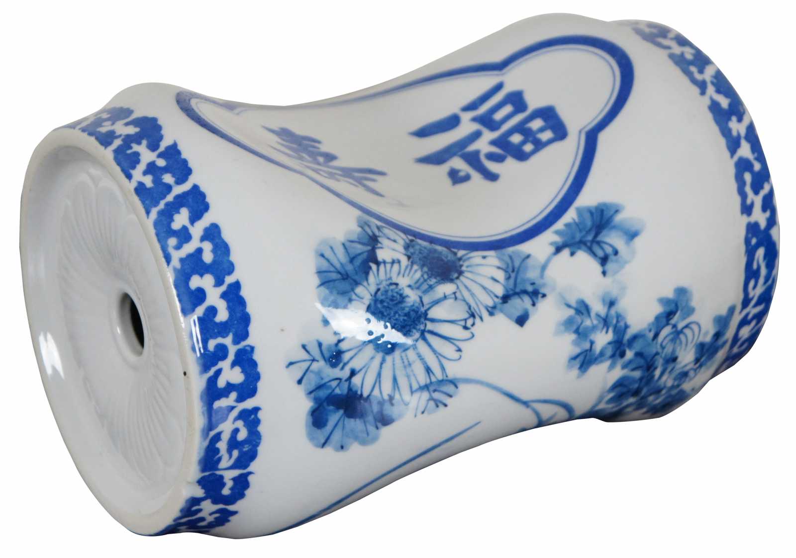 Vintage blue and white painted porcelain Chinese head or neck rest decorated with calligraphy, flowers and branches.