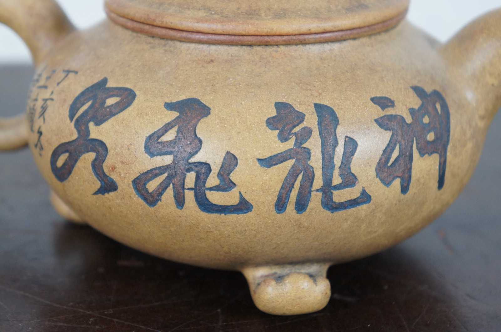 Vintage Chinese yixing zisha ceramic teapot with three feet, carved landscape and calligraphy on the sides and a lizard handle on the lid.