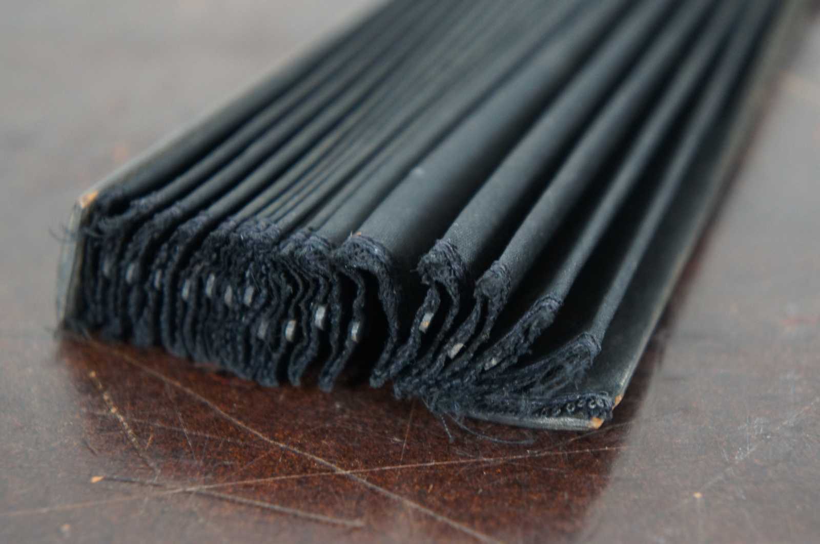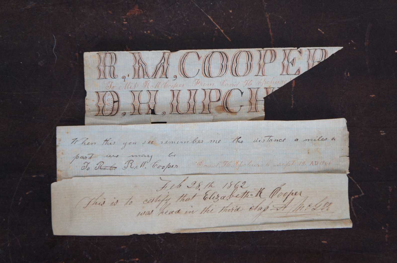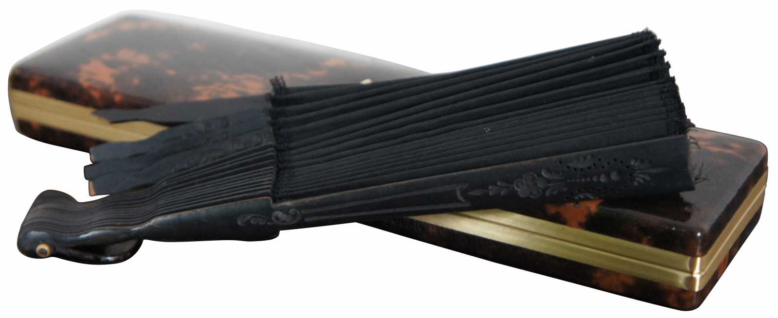 Antique Victorian folding fan with carved wood sticks and black fabric. Stored by previous owner in an empty vintage Bulova Accutron for Women box. Includes handwritten notes from the early 1860’s.