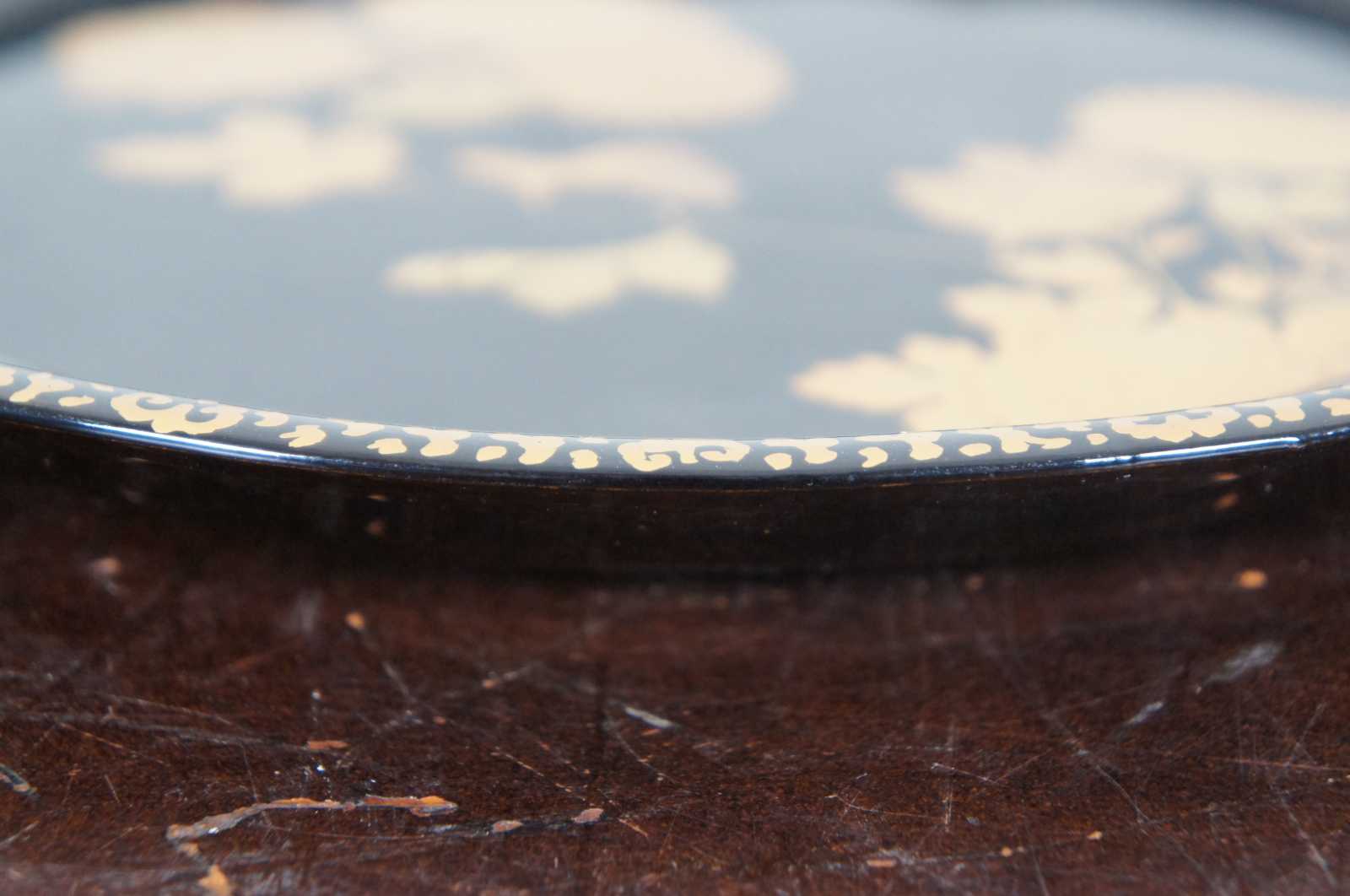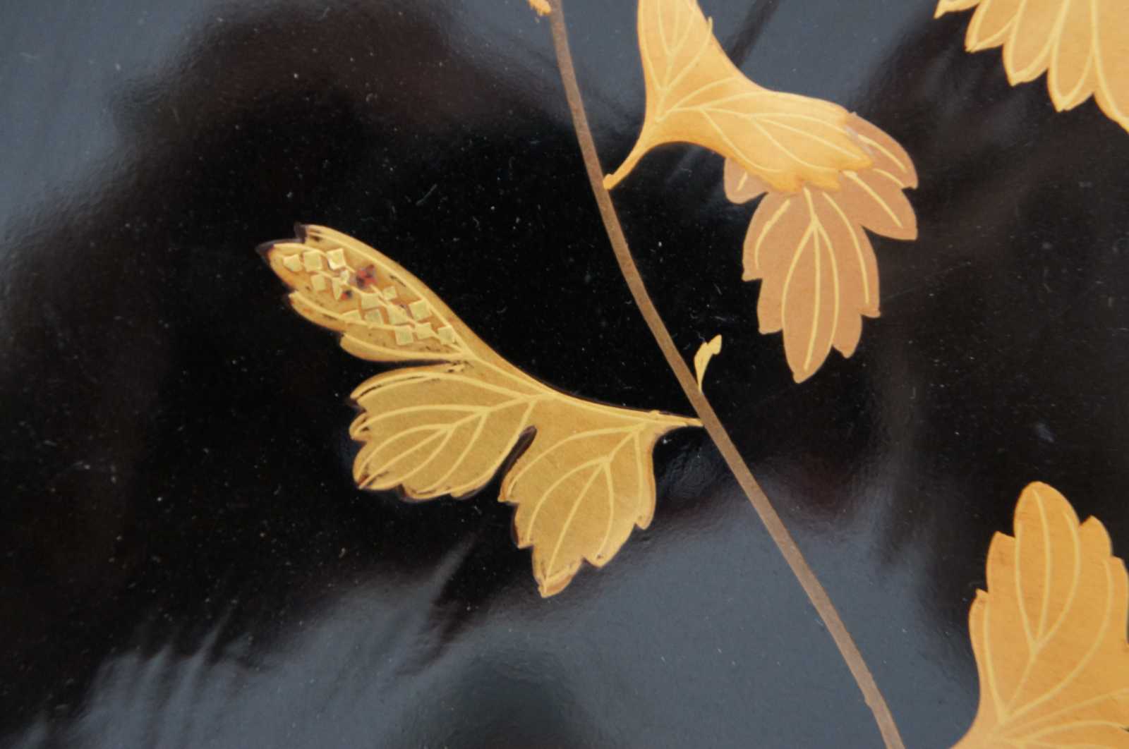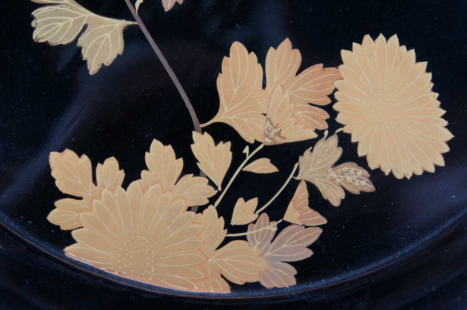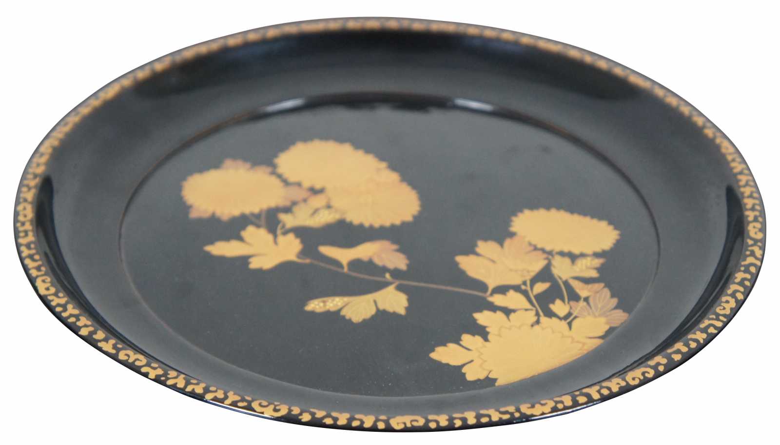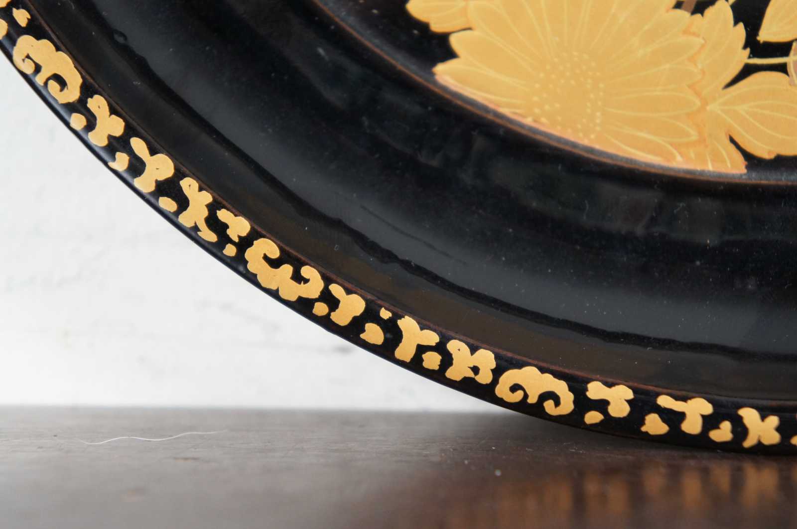 Vintage Japanese black lacquered wood and painted gold floral serving plate.