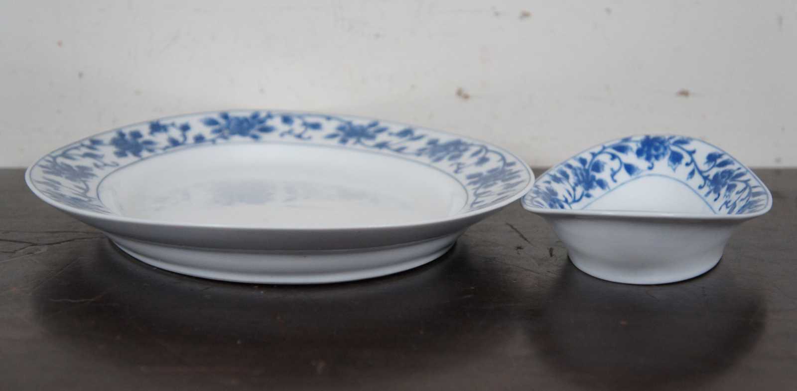 Vintage oval platter and vegetable dish by Nippon Royal Sometuke in white porcelain with a blue flowering vine border.