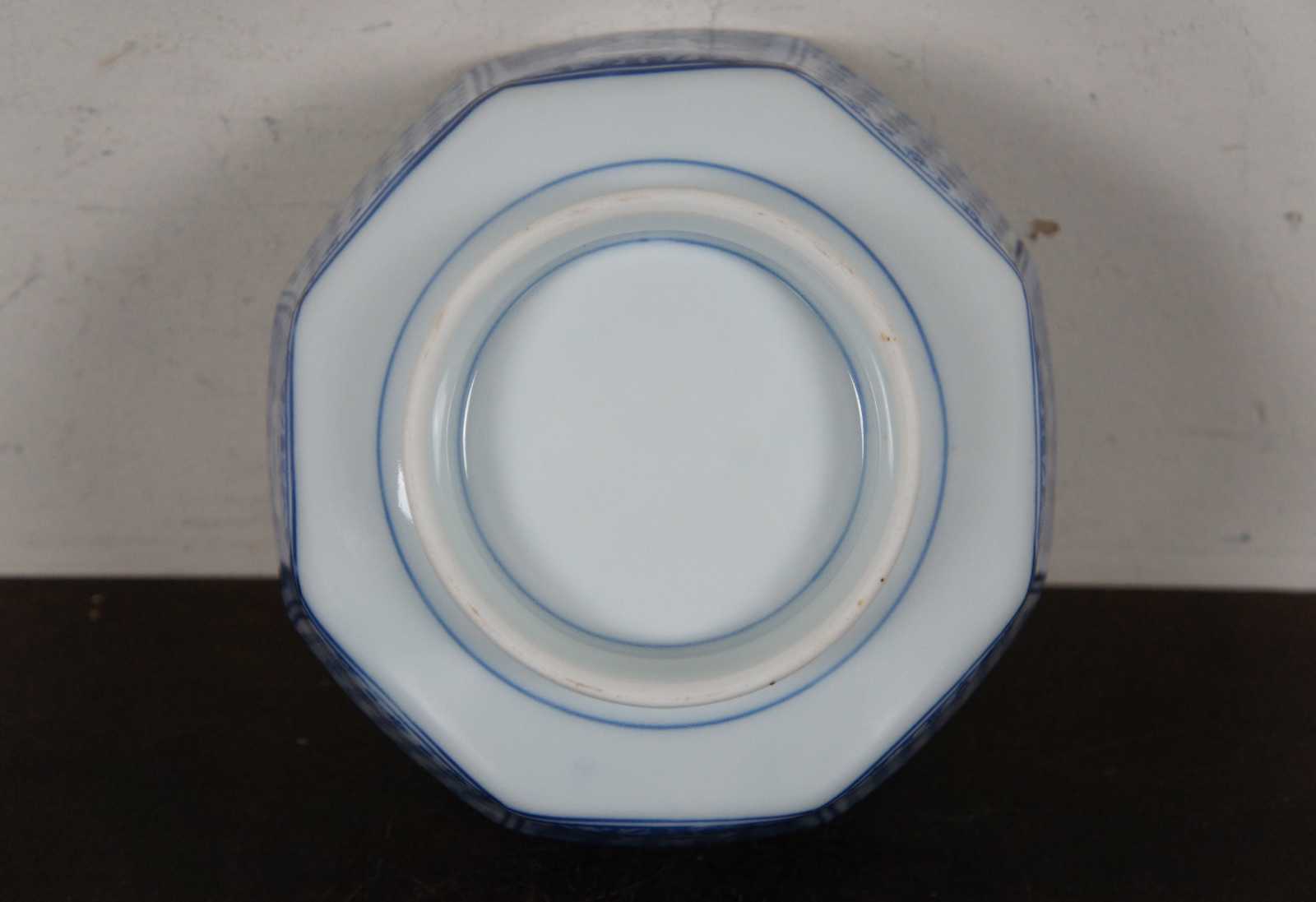 Vintage octagonal Chinese porcelain blue and white transferware bowl with floral patterns around the exterior and a landscape with a water mill in the center.