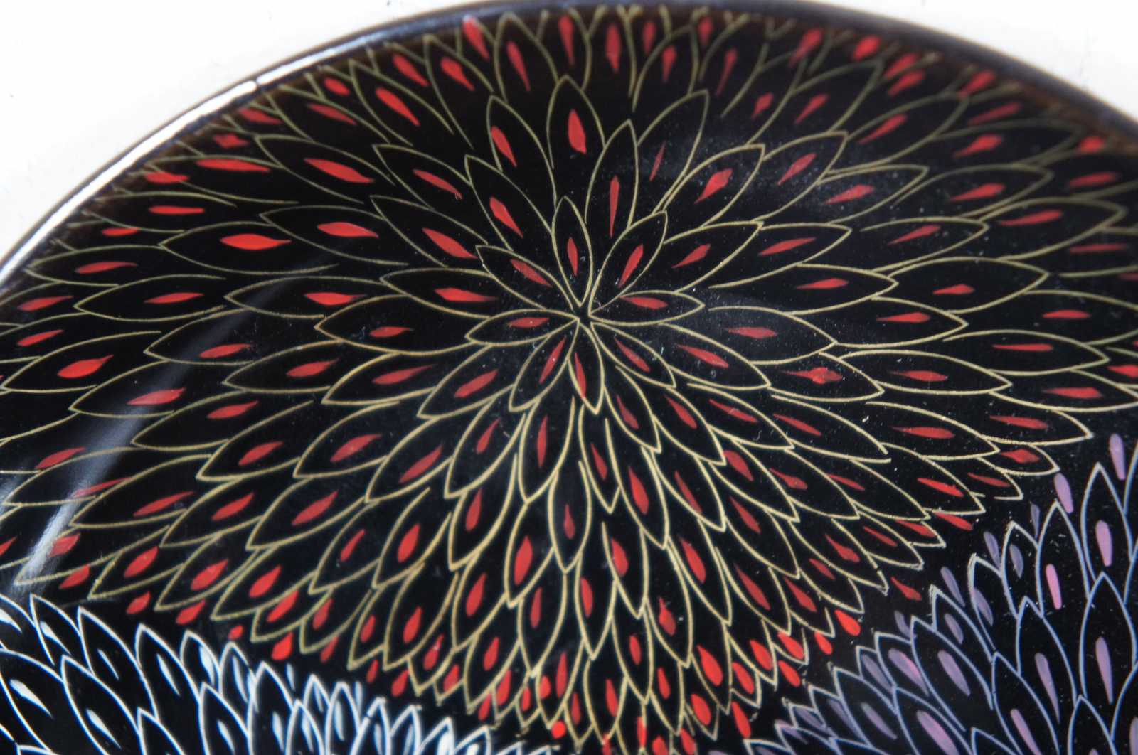 Vintage set of five black lacquered saucers or small plates painted with tricolor sections of peonies.