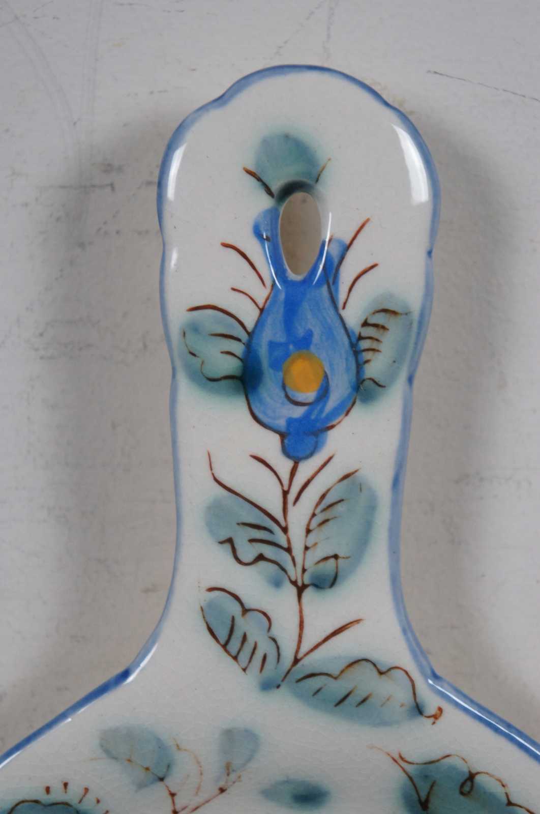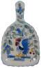 Vintage hand painted porcelain spoon rest with handle and blue and red rooster and flowers.