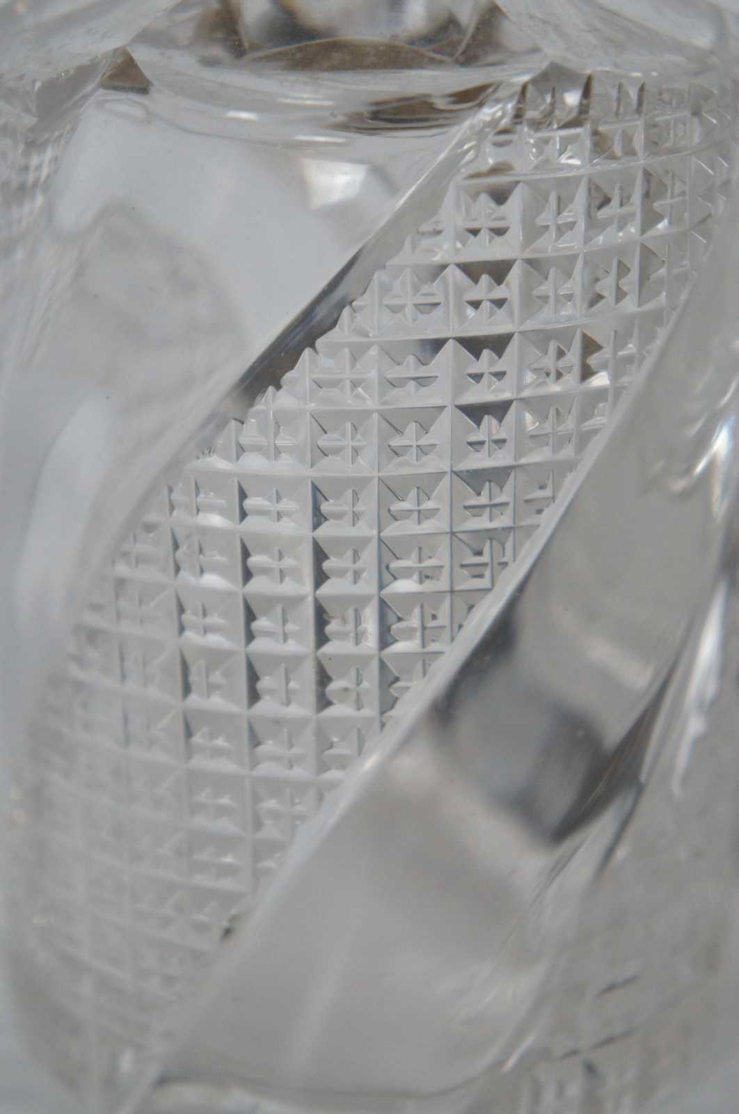 Pair of antique Victorian cut glass scent bottles with faceted stoppers and floral repousse silver lids.