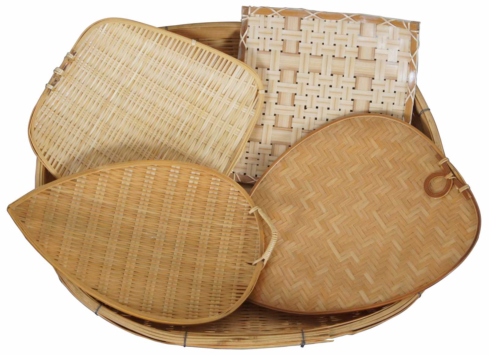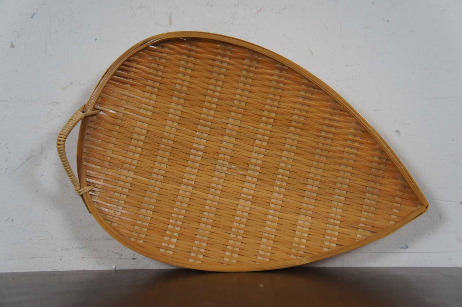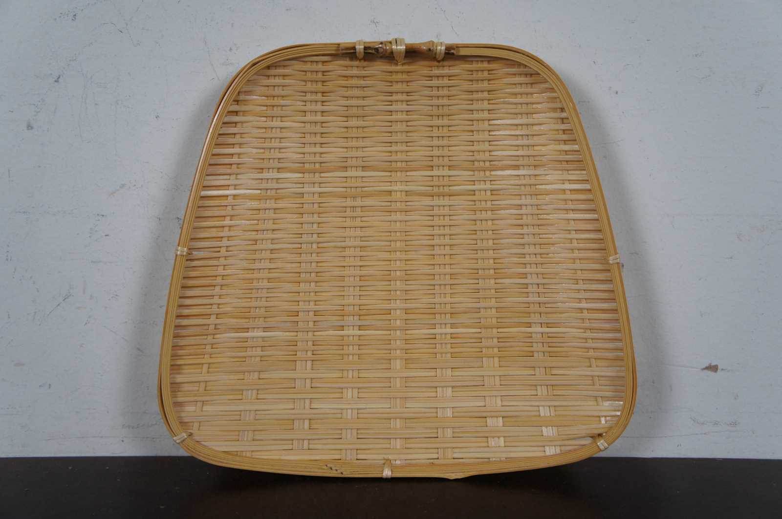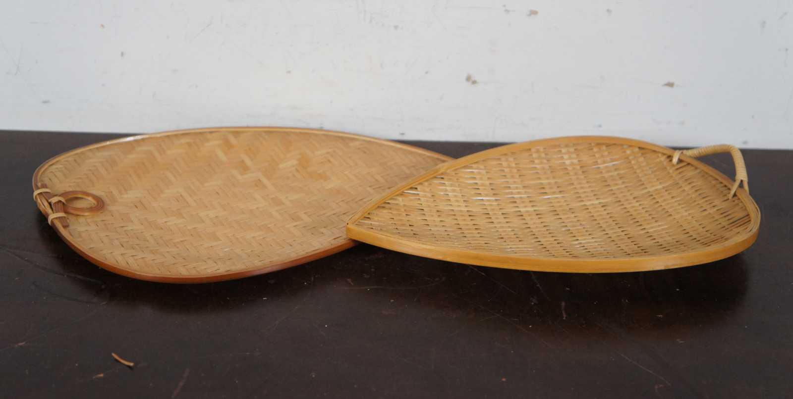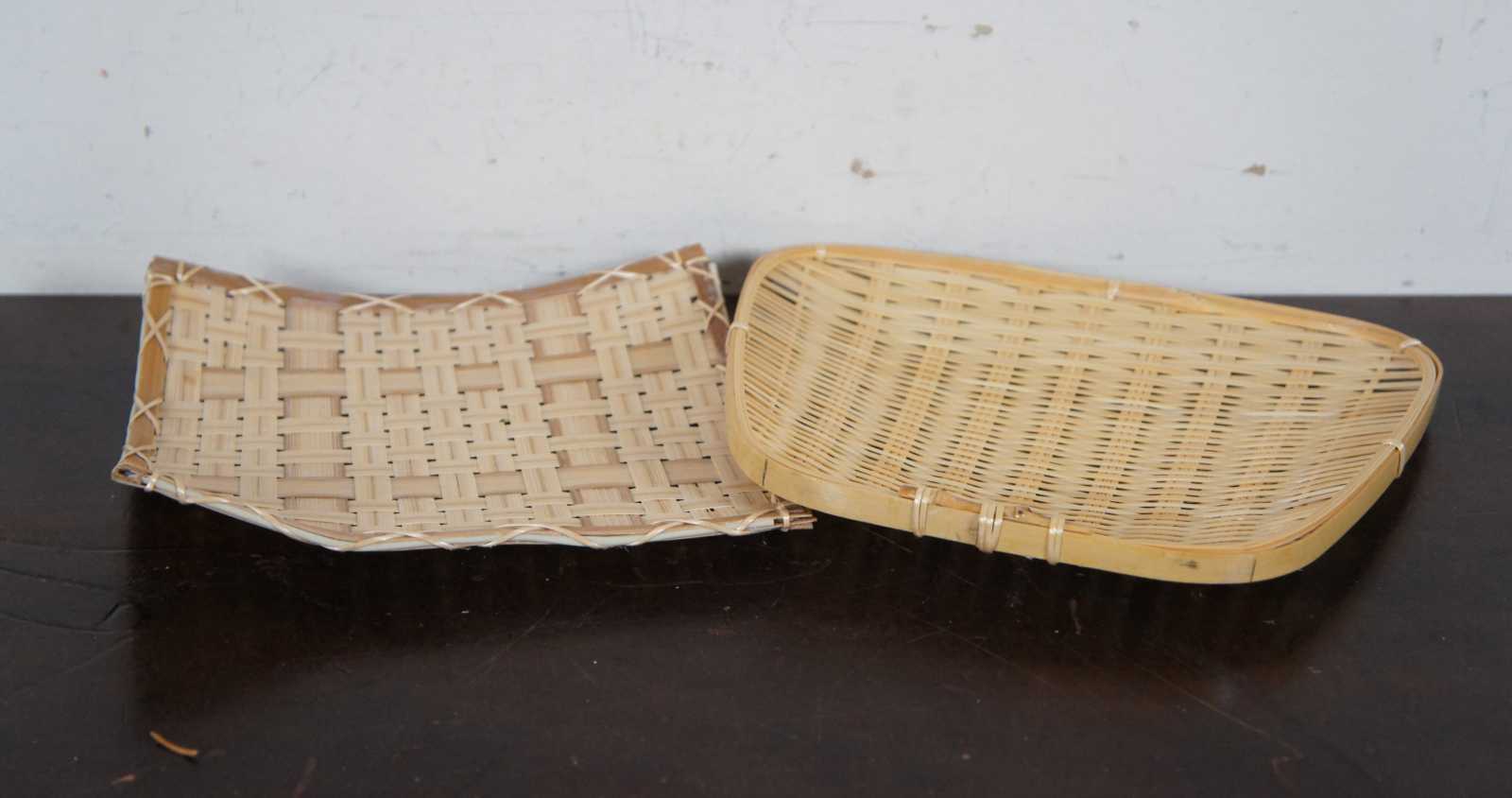 Lot of five vintage woven bamboo and wicker shallow basket trays or bowls in a variety of shapes and shades.