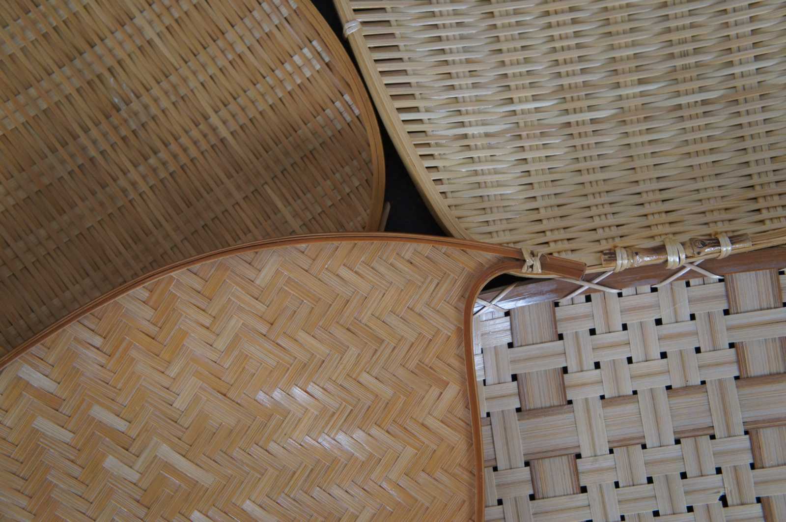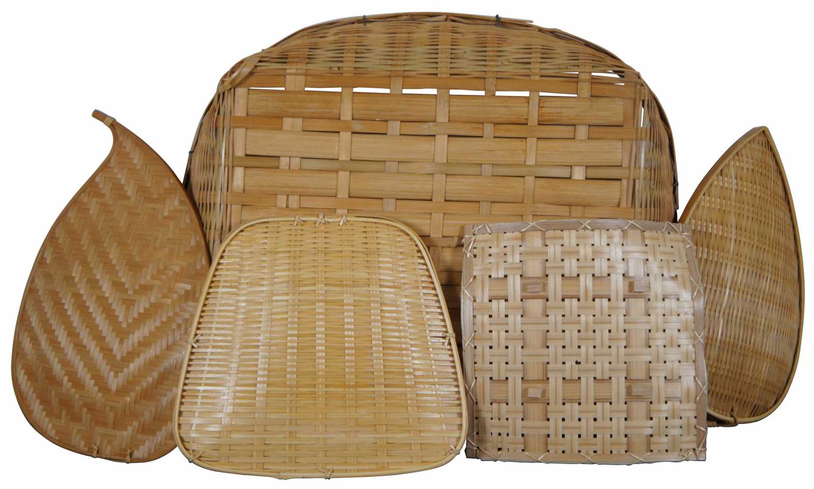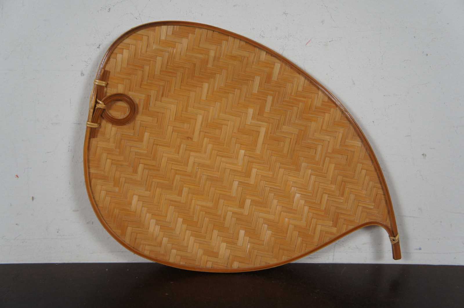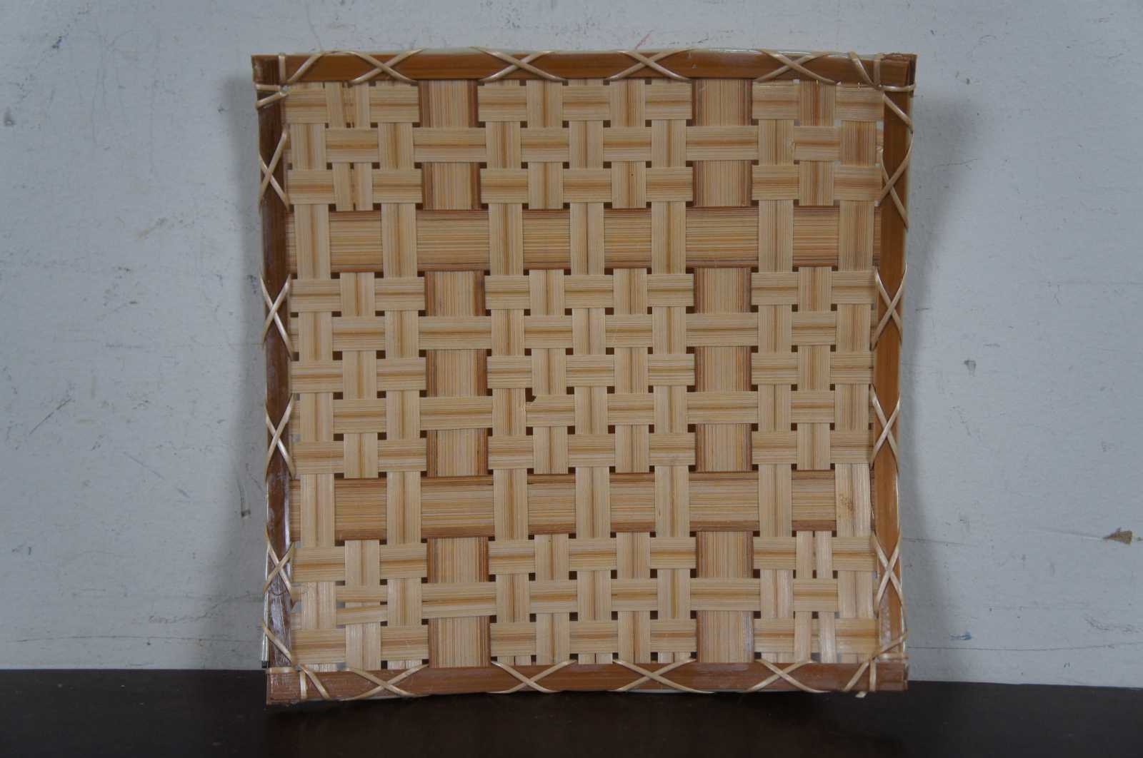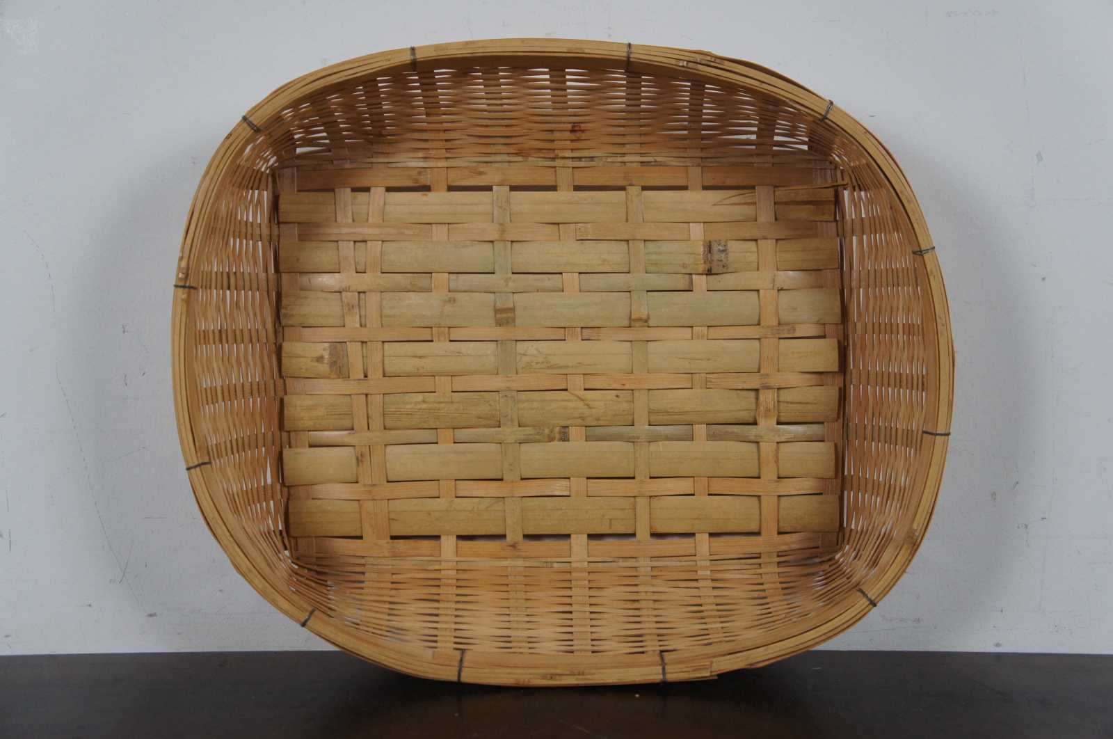 Lot of five vintage woven bamboo and wicker shallow basket trays or bowls in a variety of shapes and shades.