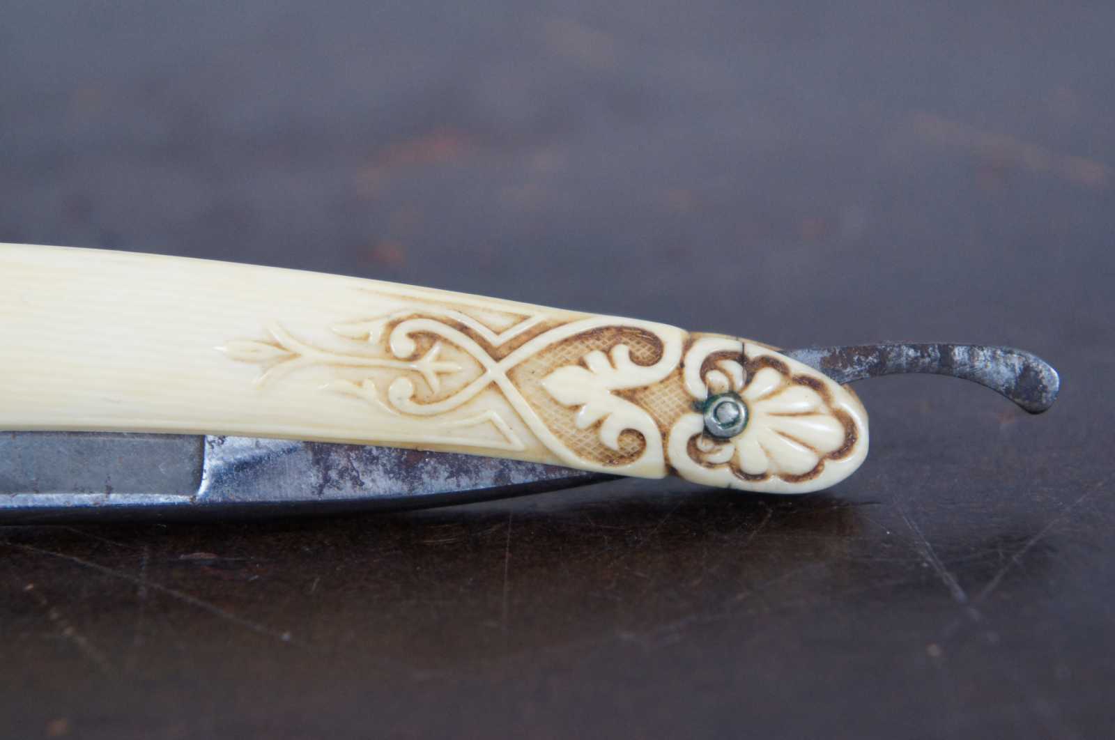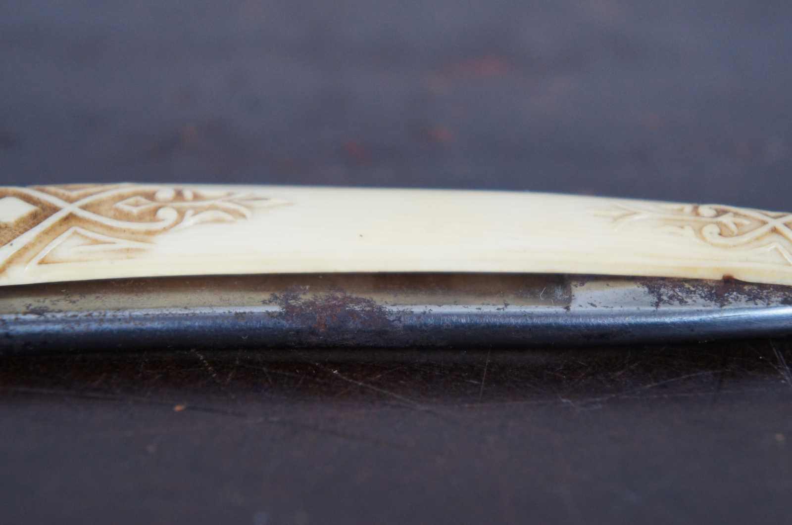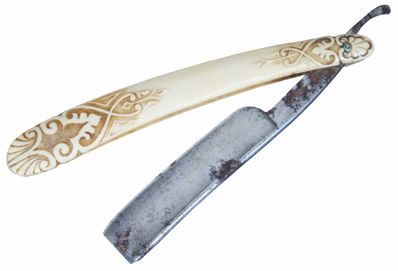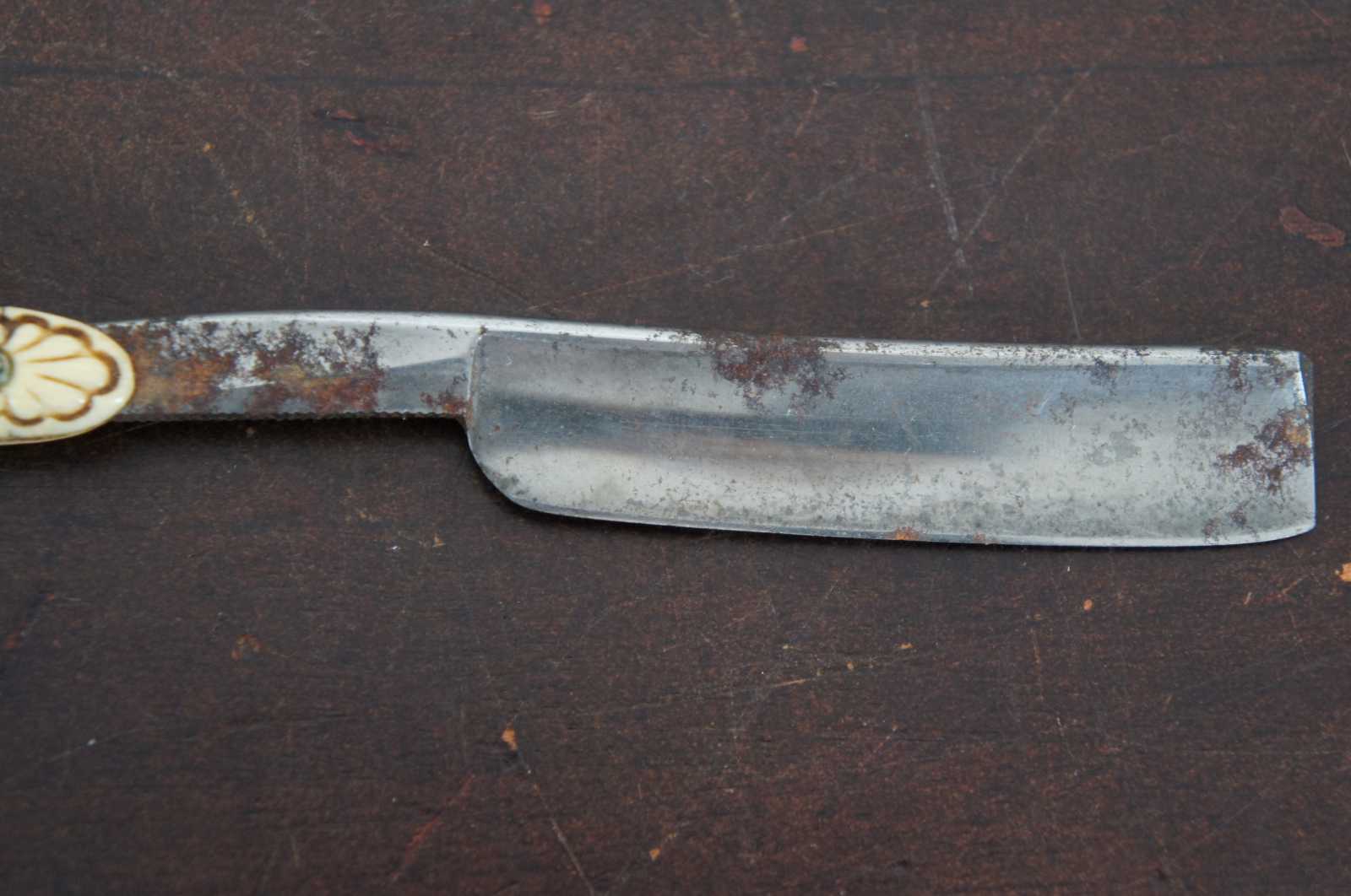Antique folding straight razor by Stanley Cambell with carved bakelite handle.