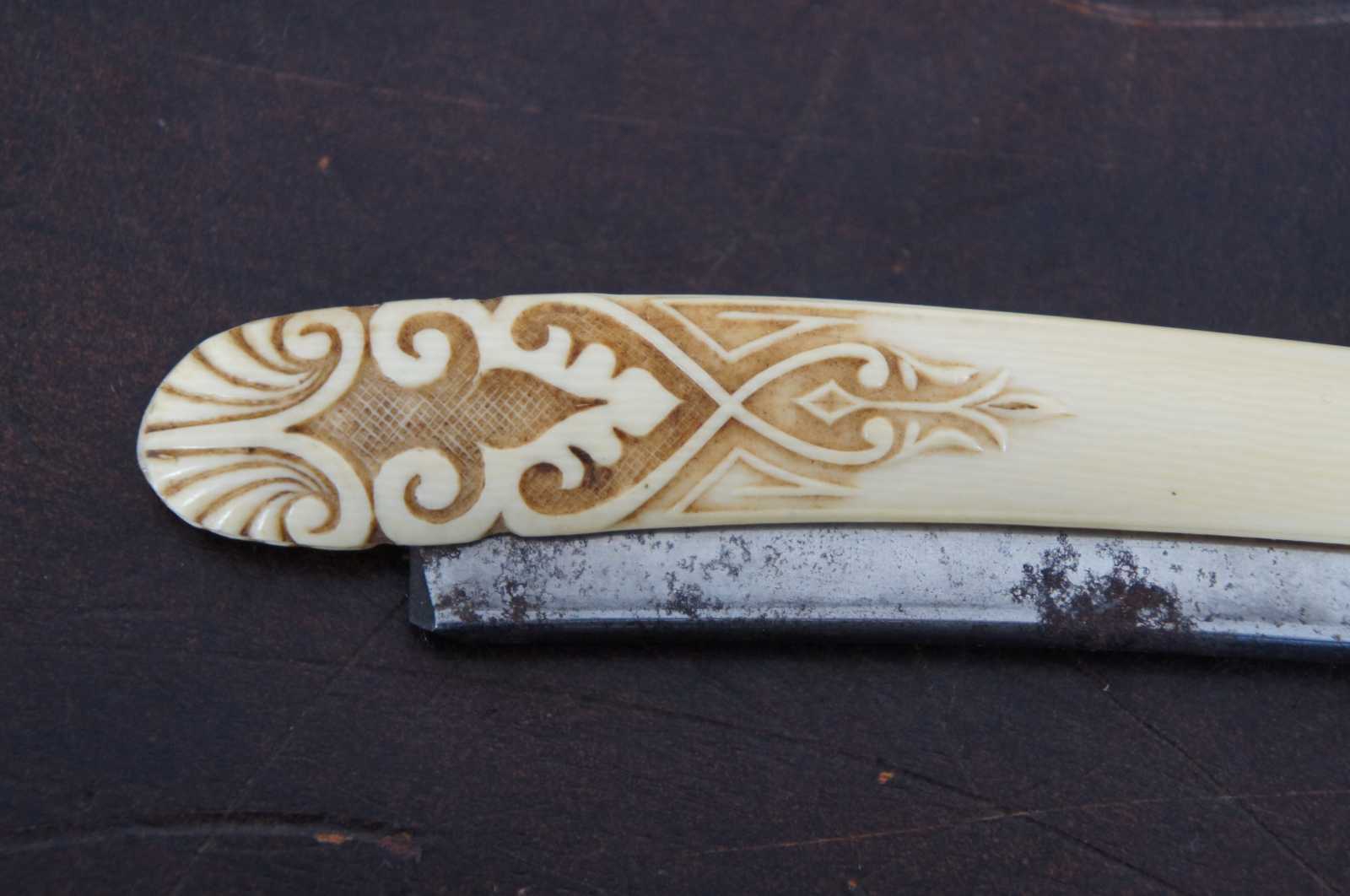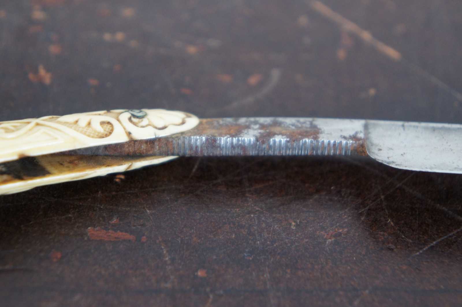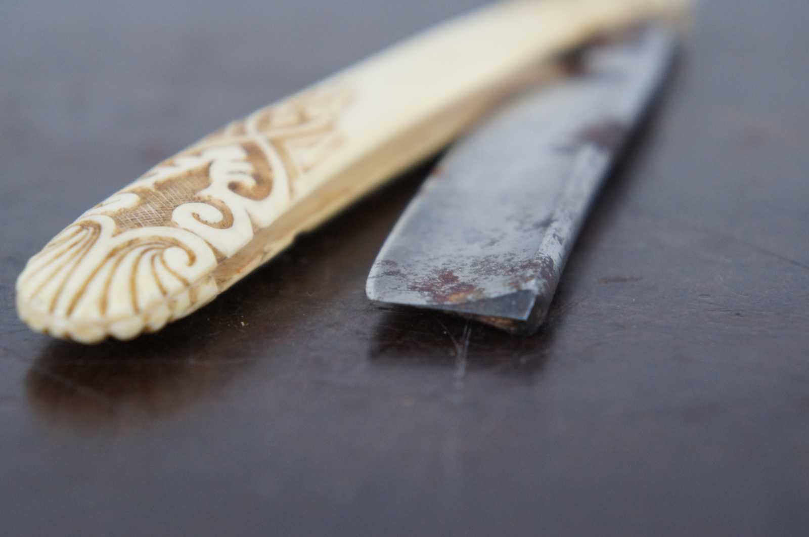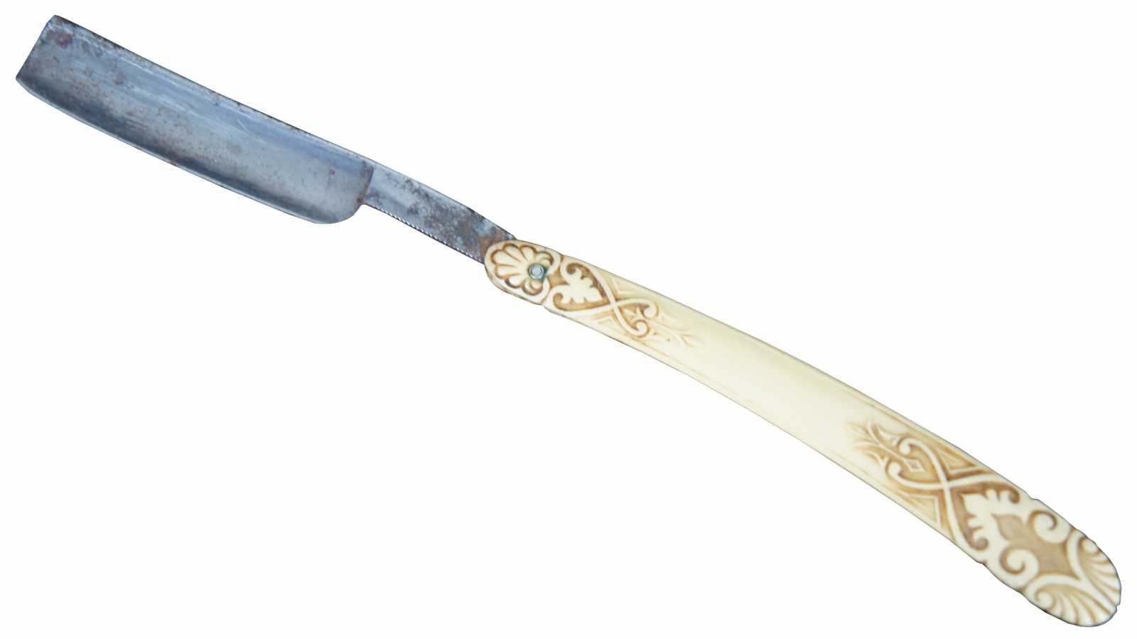 Antique folding straight razor by Stanley Cambell with carved bakelite handle.