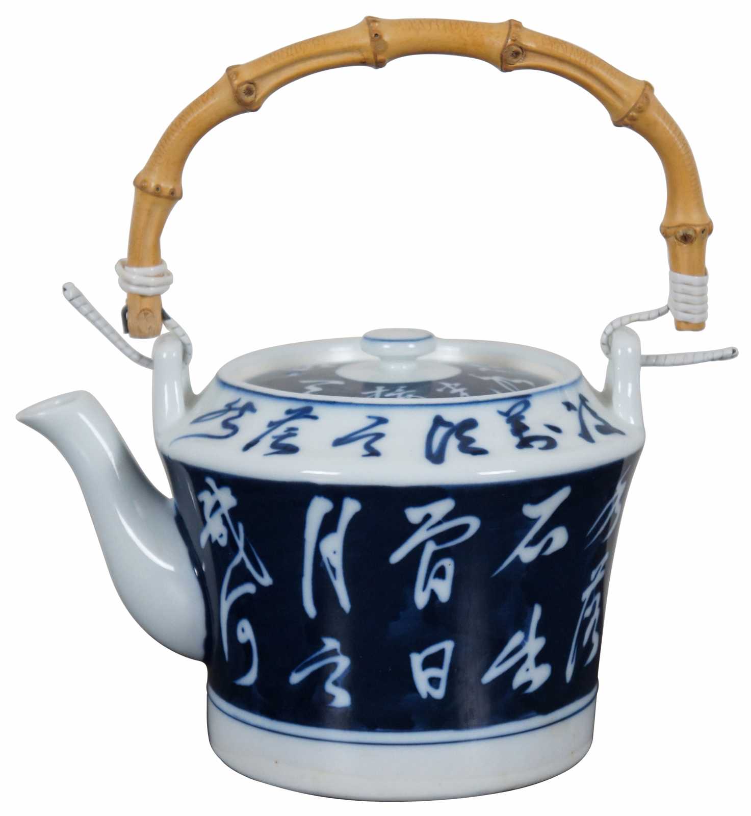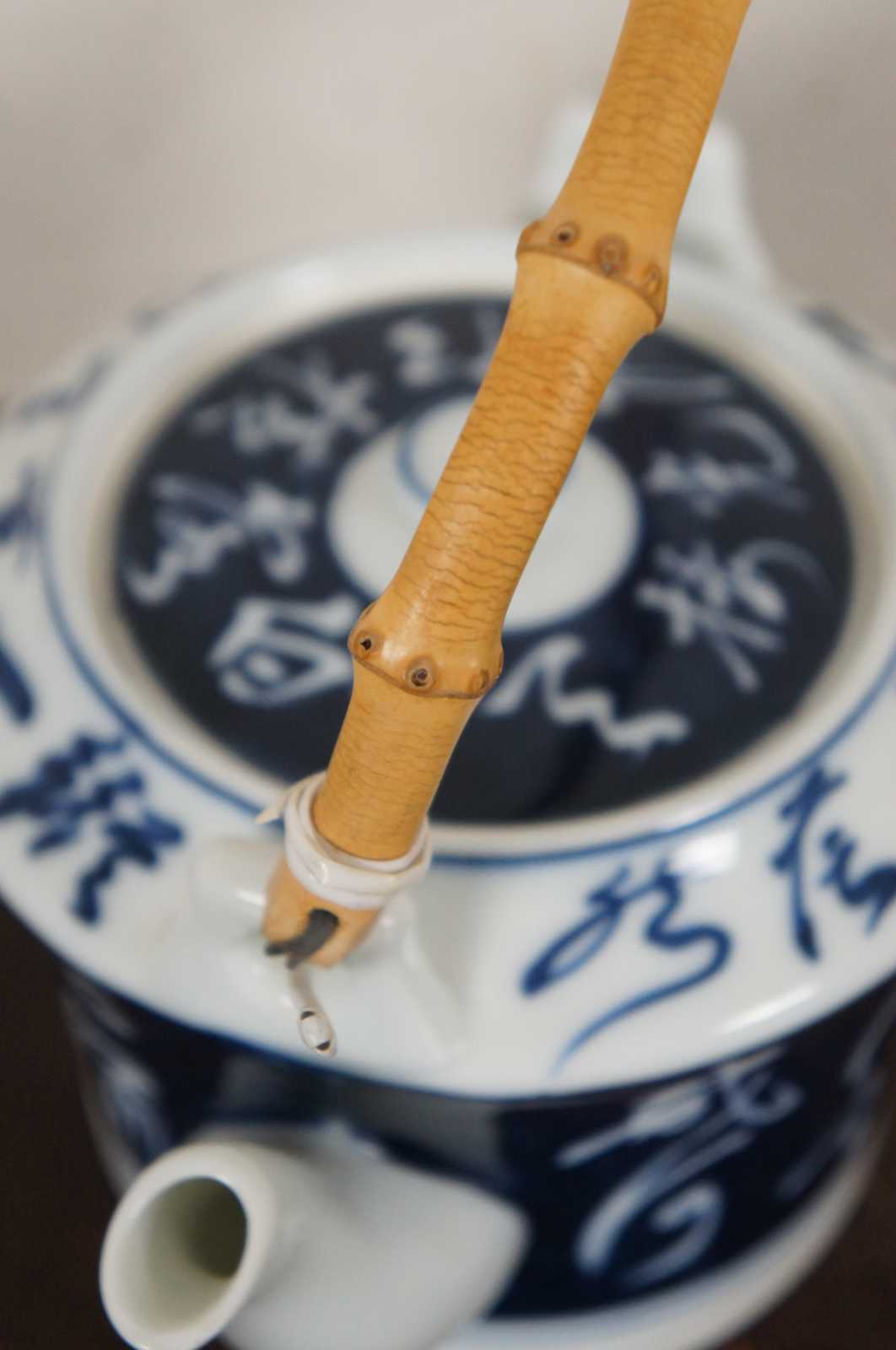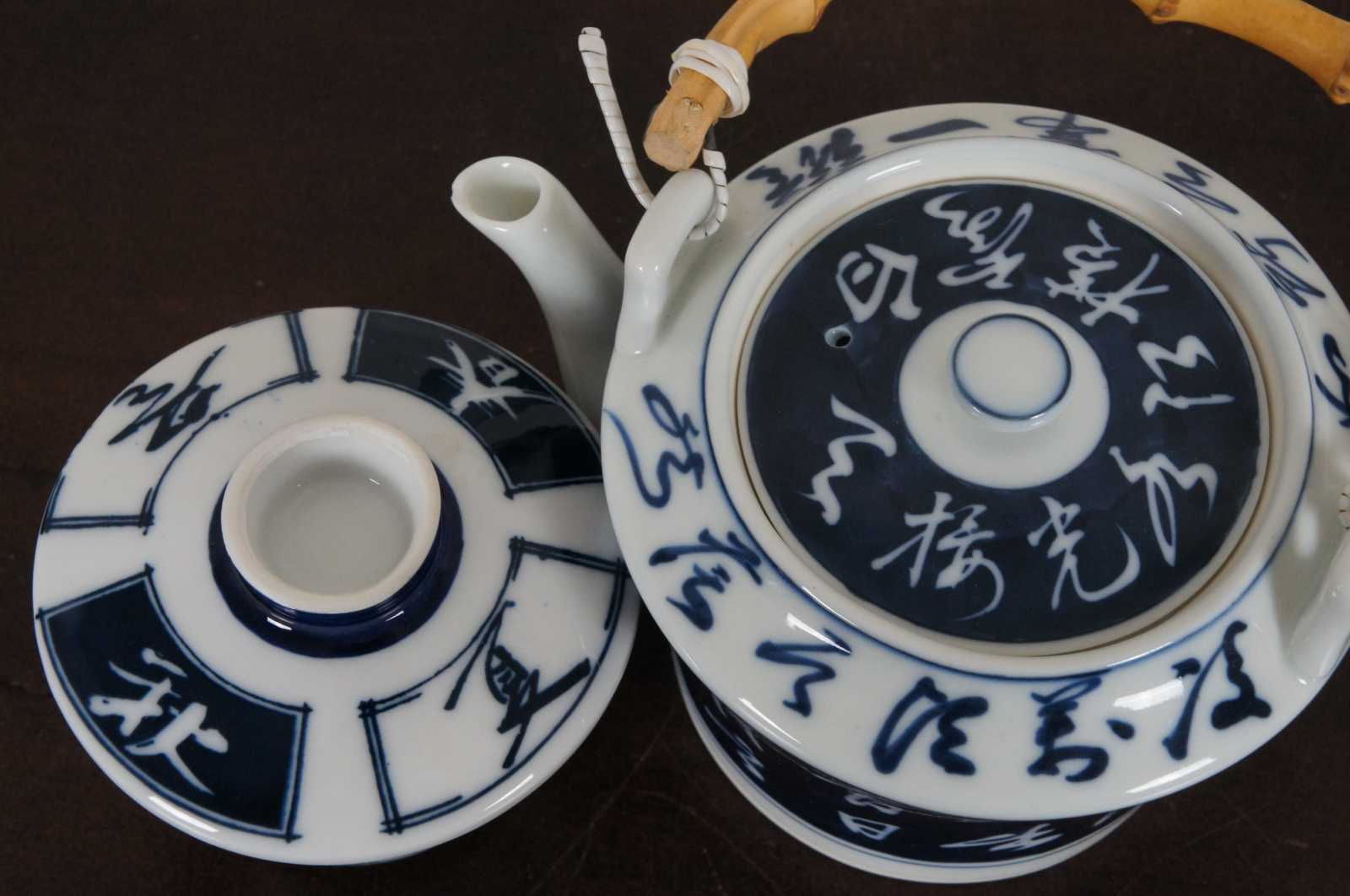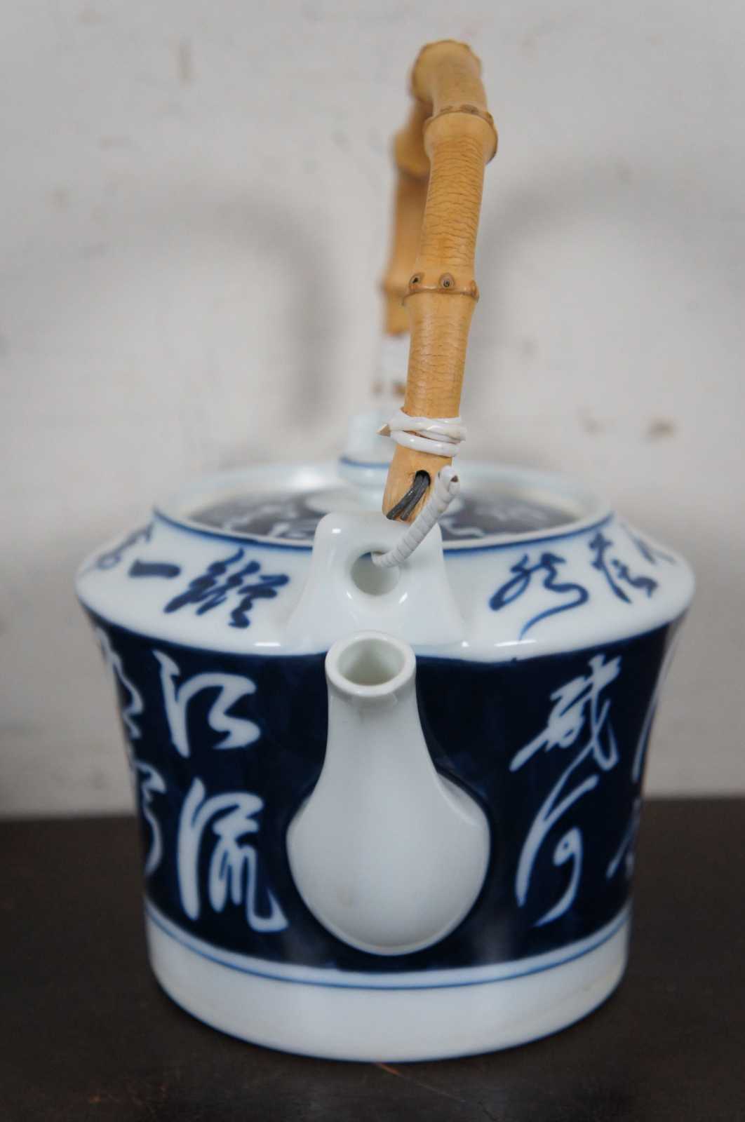 Vintage blue and white Japanese calligraphy decorated set of porcelain – a teapot with bamboo handle, a lidded miso or rice bowl and four plain chopstick or spoon rests.