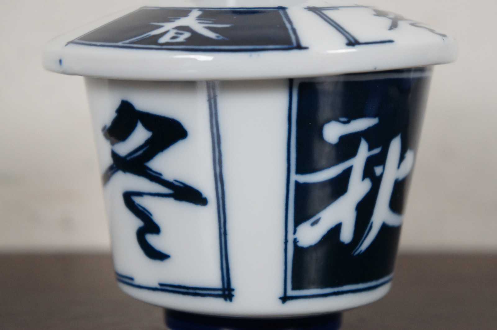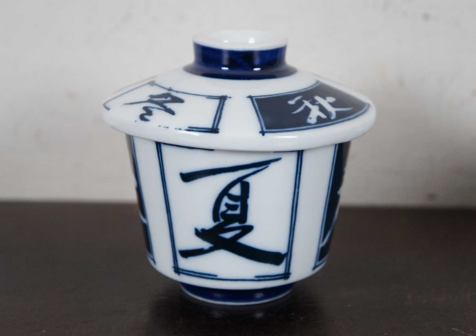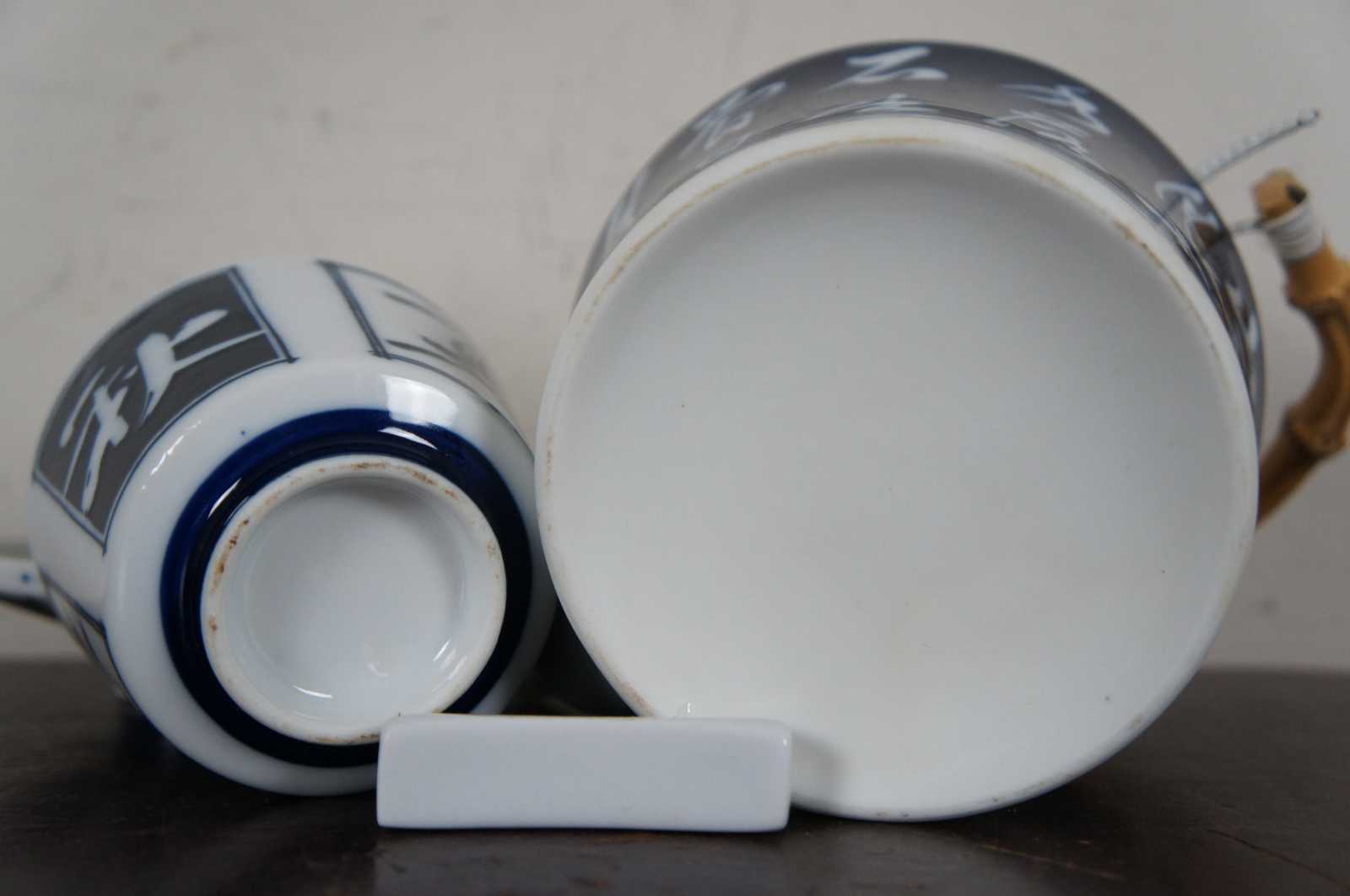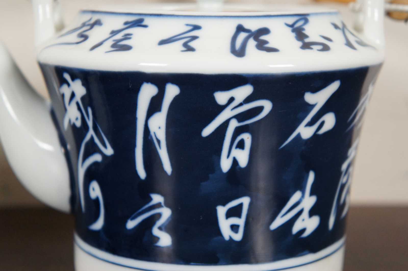 Vintage blue and white Japanese calligraphy decorated set of porcelain – a teapot with bamboo handle, a lidded miso or rice bowl and four plain chopstick or spoon rests.