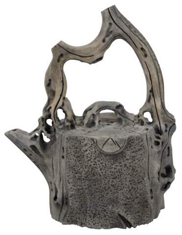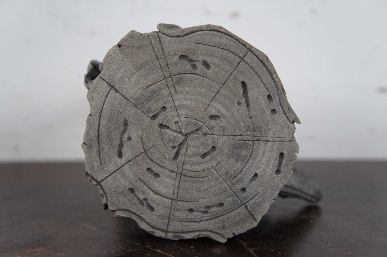 Vintage gray yixing zisha Chinese ceramic teapot shaped like a gnarled tree stump. Marked on base.