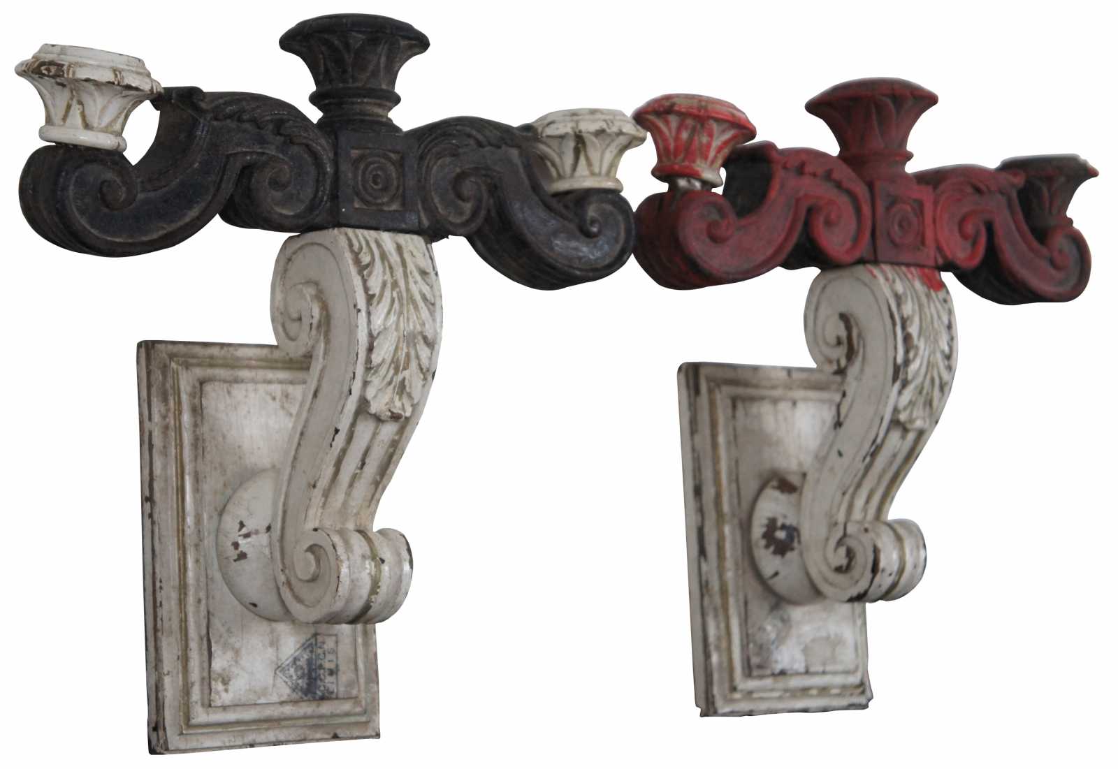 Pair of antique carved wood three arm candle holder wall sconces painted in red and white.